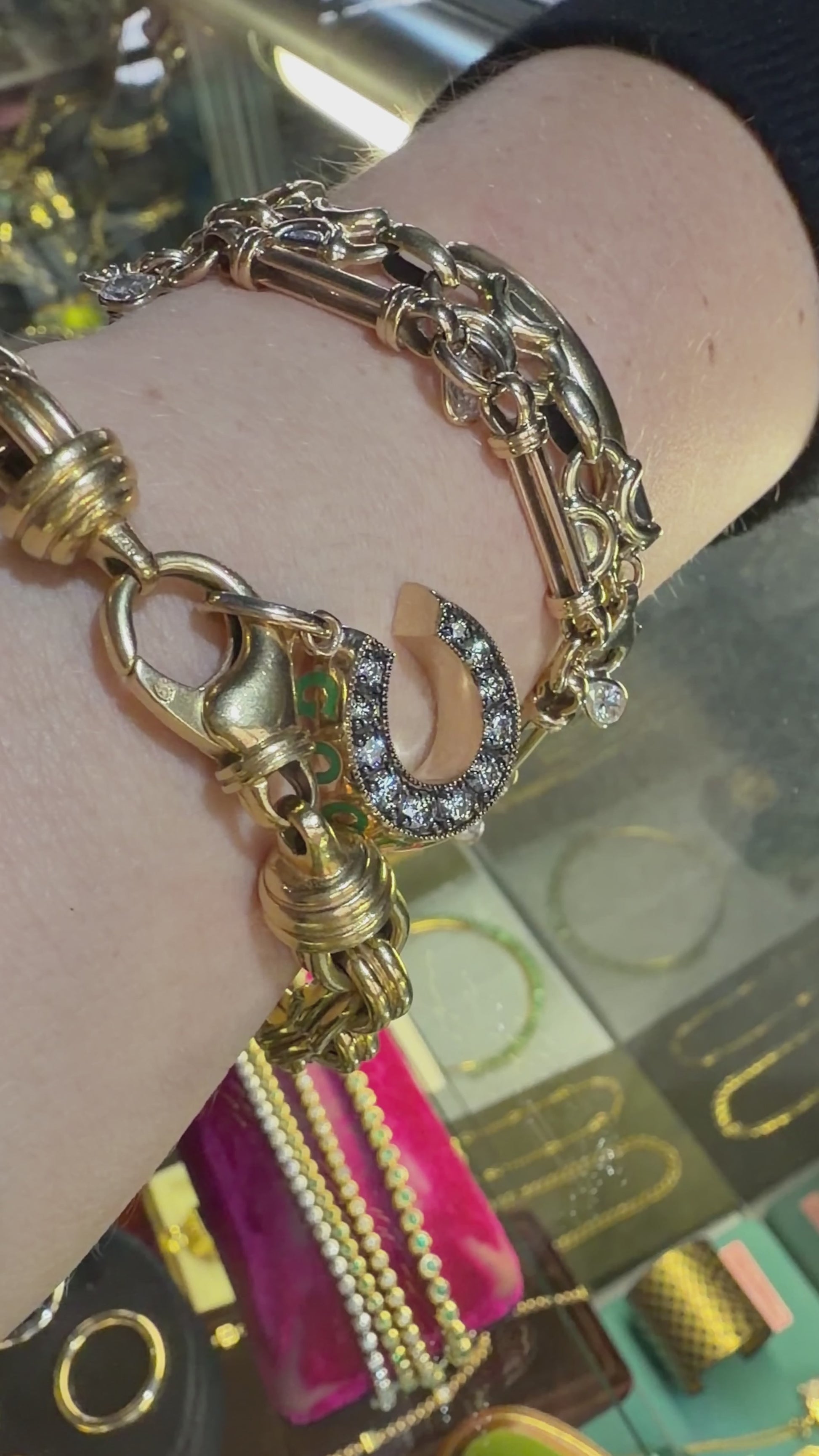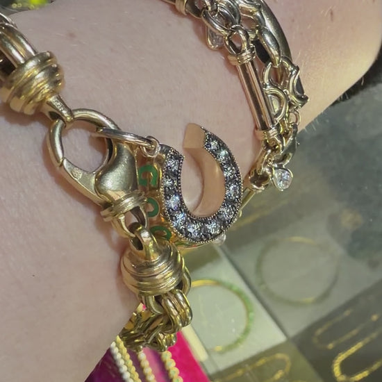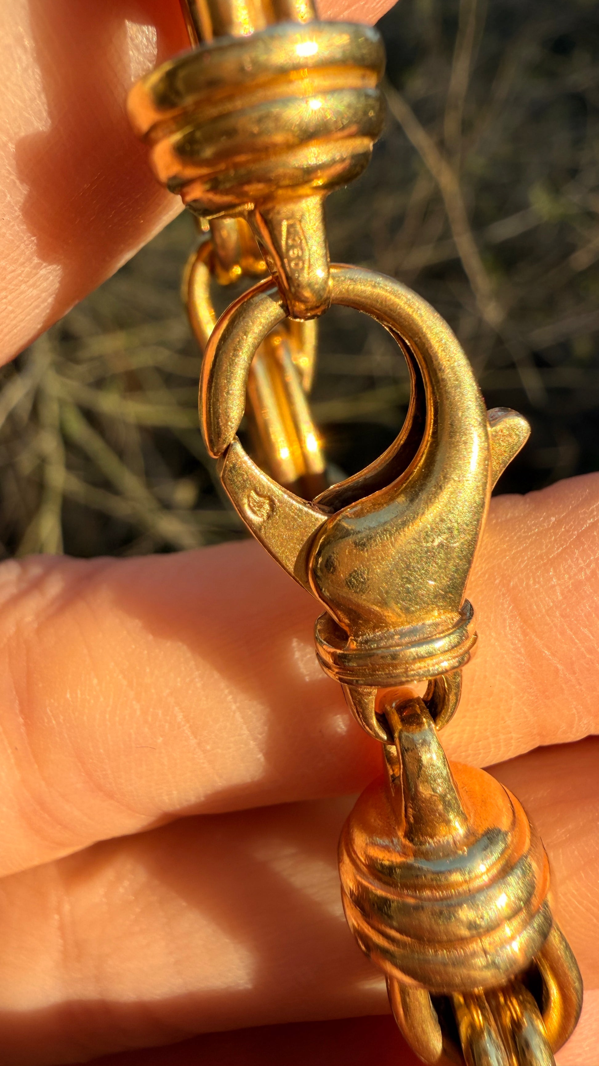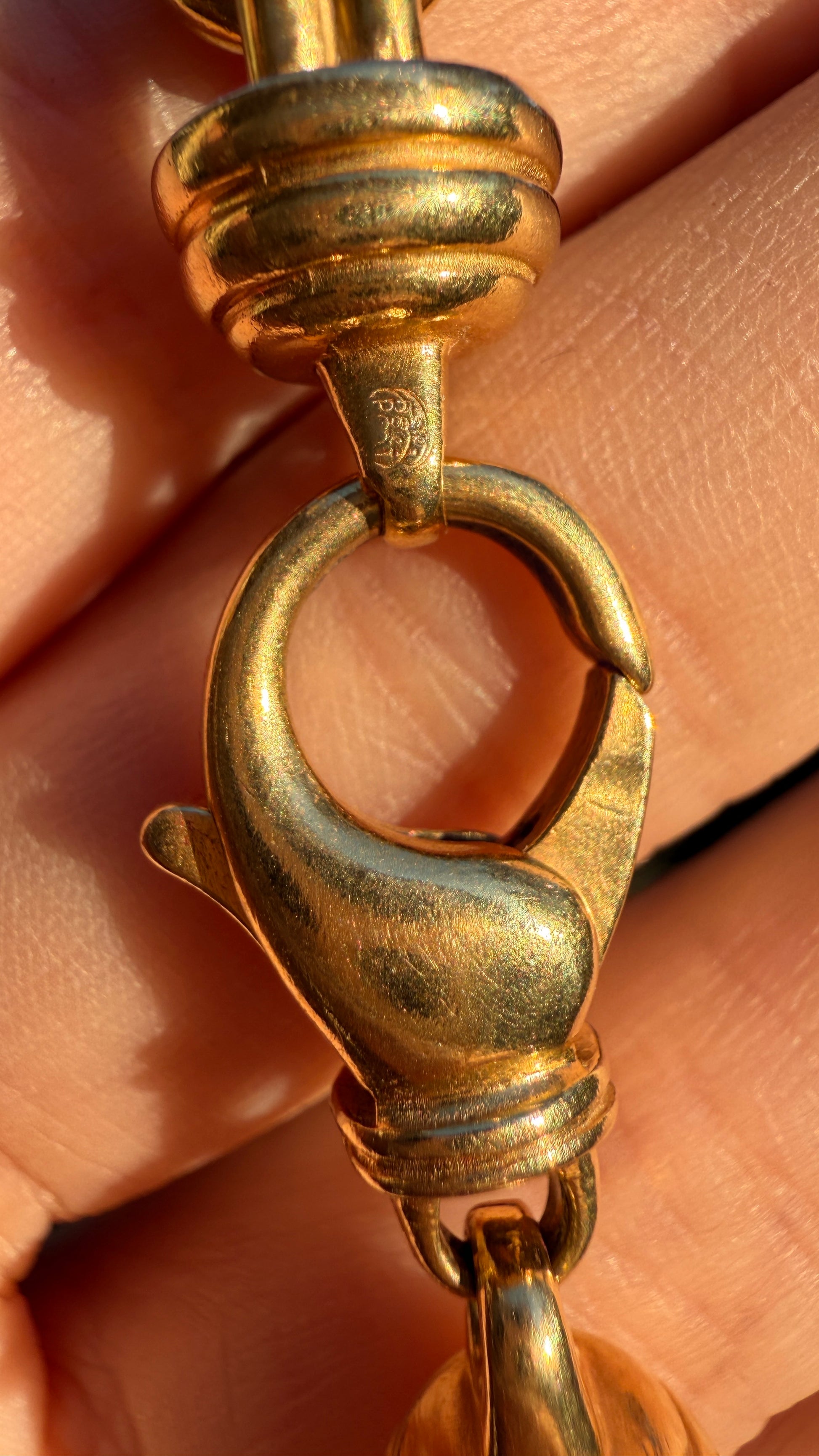 A gorgeous Vintage French yellow 18K round ribbed link bracelet, 7.25 inch fit. Sizable. This bracelet has super attractive round links made in rich yellow 18K gold which is emphasized further by the large ribbed detail. The large lobster clasp is a great asset to this piece as it makes it super easy to hang charms and pendants from, and switch them in and out for different styling options. Links are semi solid but thickly constructed for a very durable quality. This is a very wearable piece and one of our recent favorites!