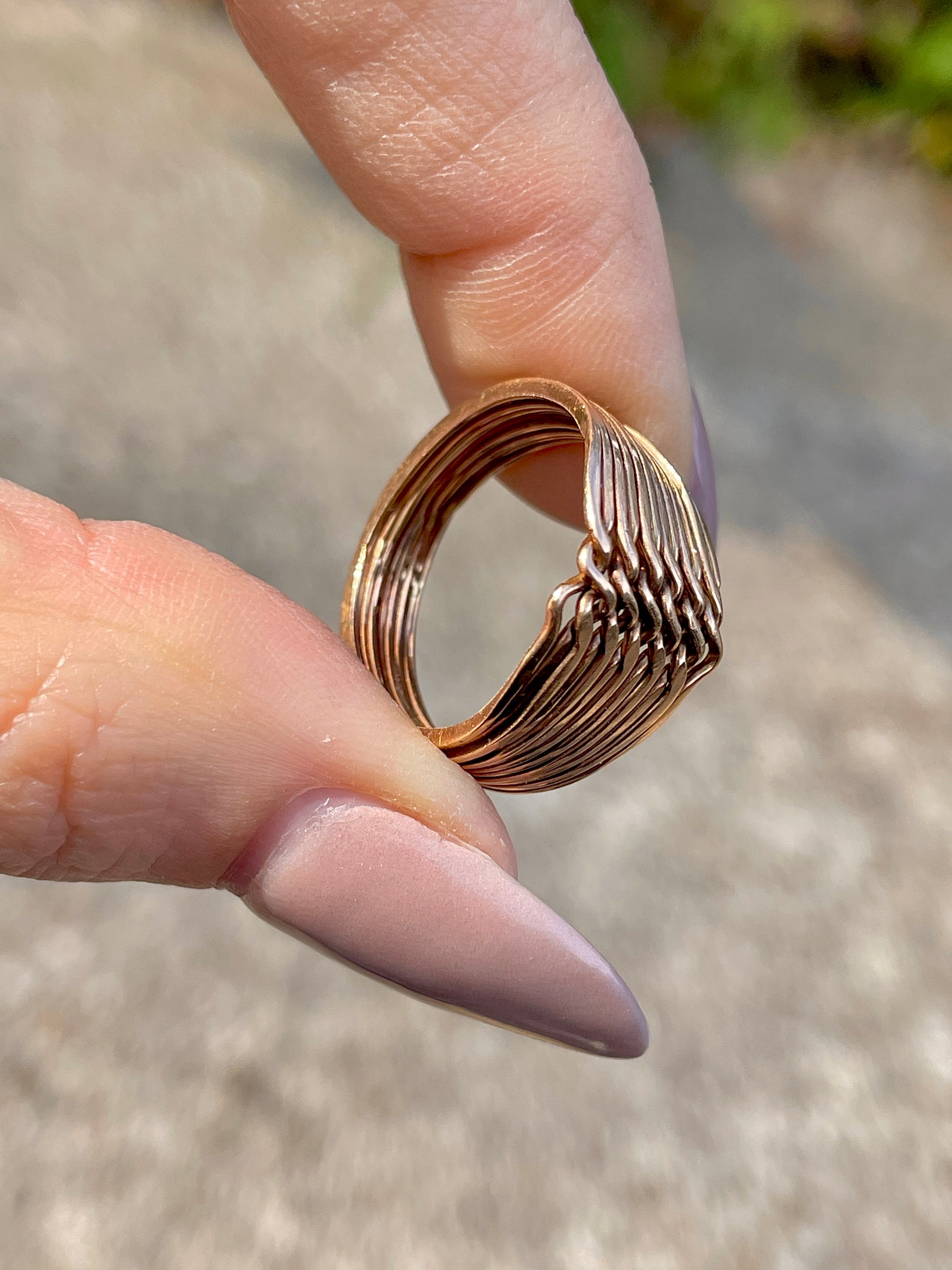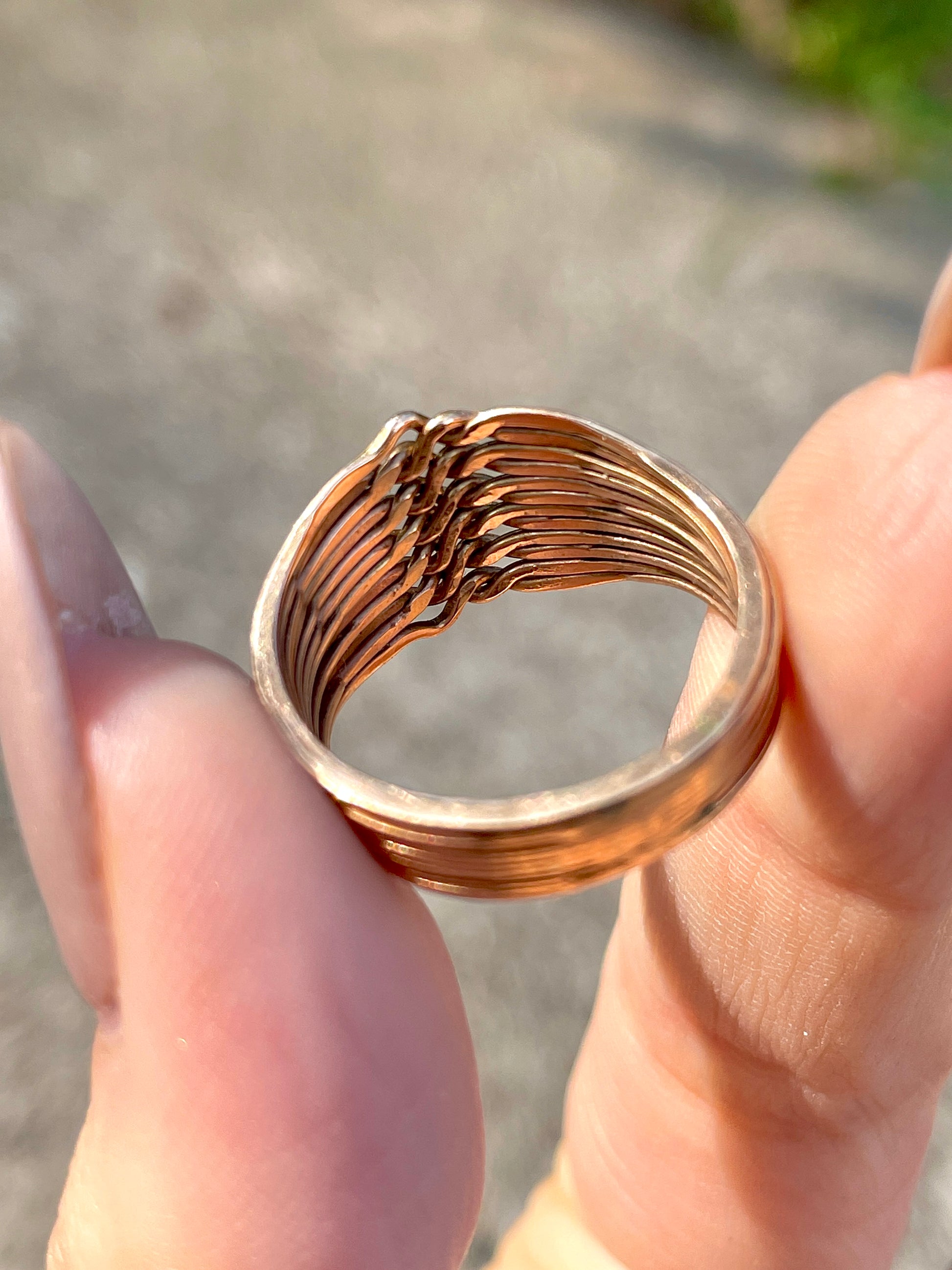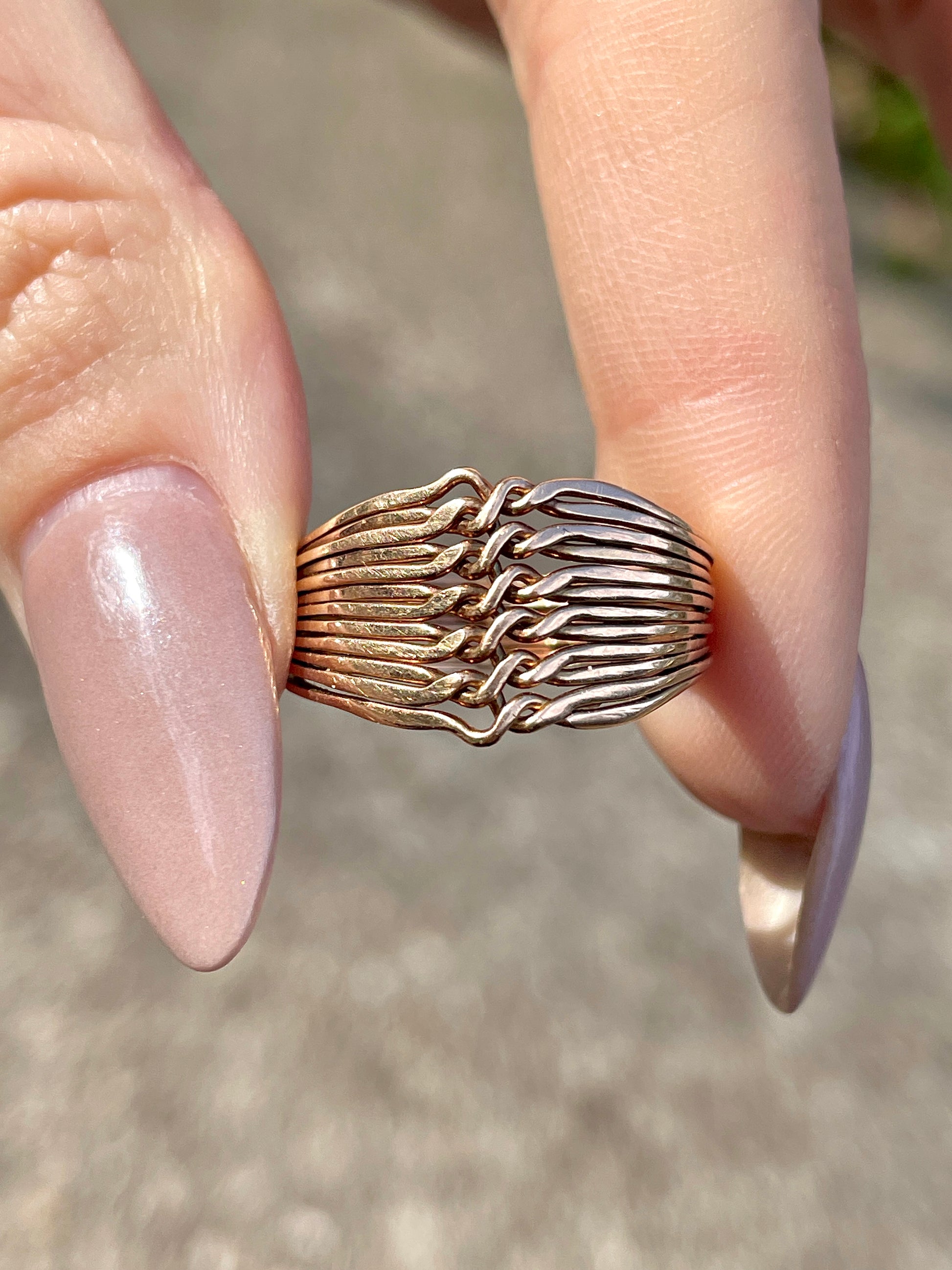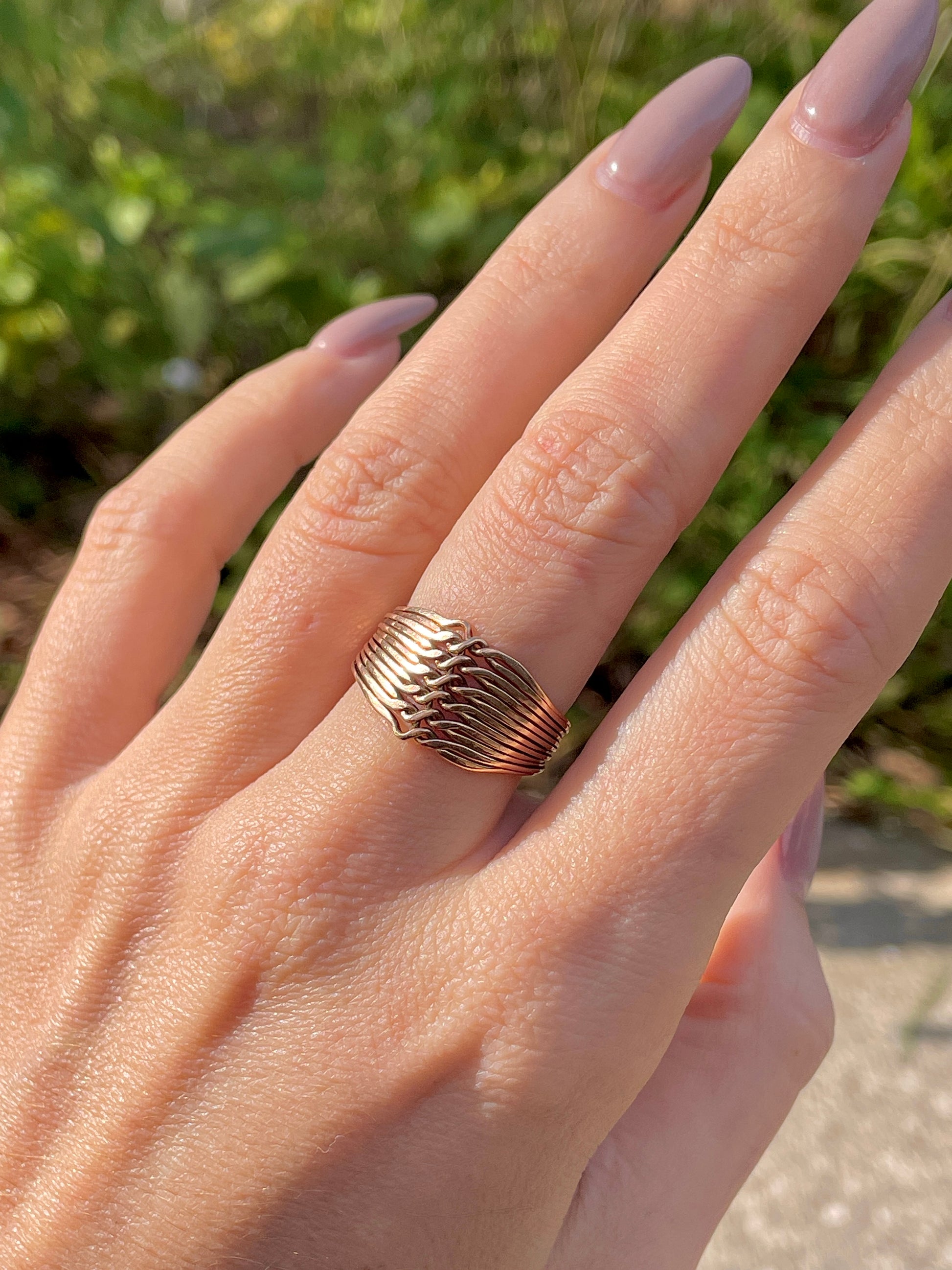 Vintage rosy 14K fused puzzle ring, size 7. Sizable. Measures 12 mm widest, weighs 4.4 grams. At some point in its history each part of the puzzle ring was separated, and at some point someone decided to fuse them together so the puzzle pieces would stay in place. Such a pretty, flattering shape and finger coverage. In very good preowned condition.