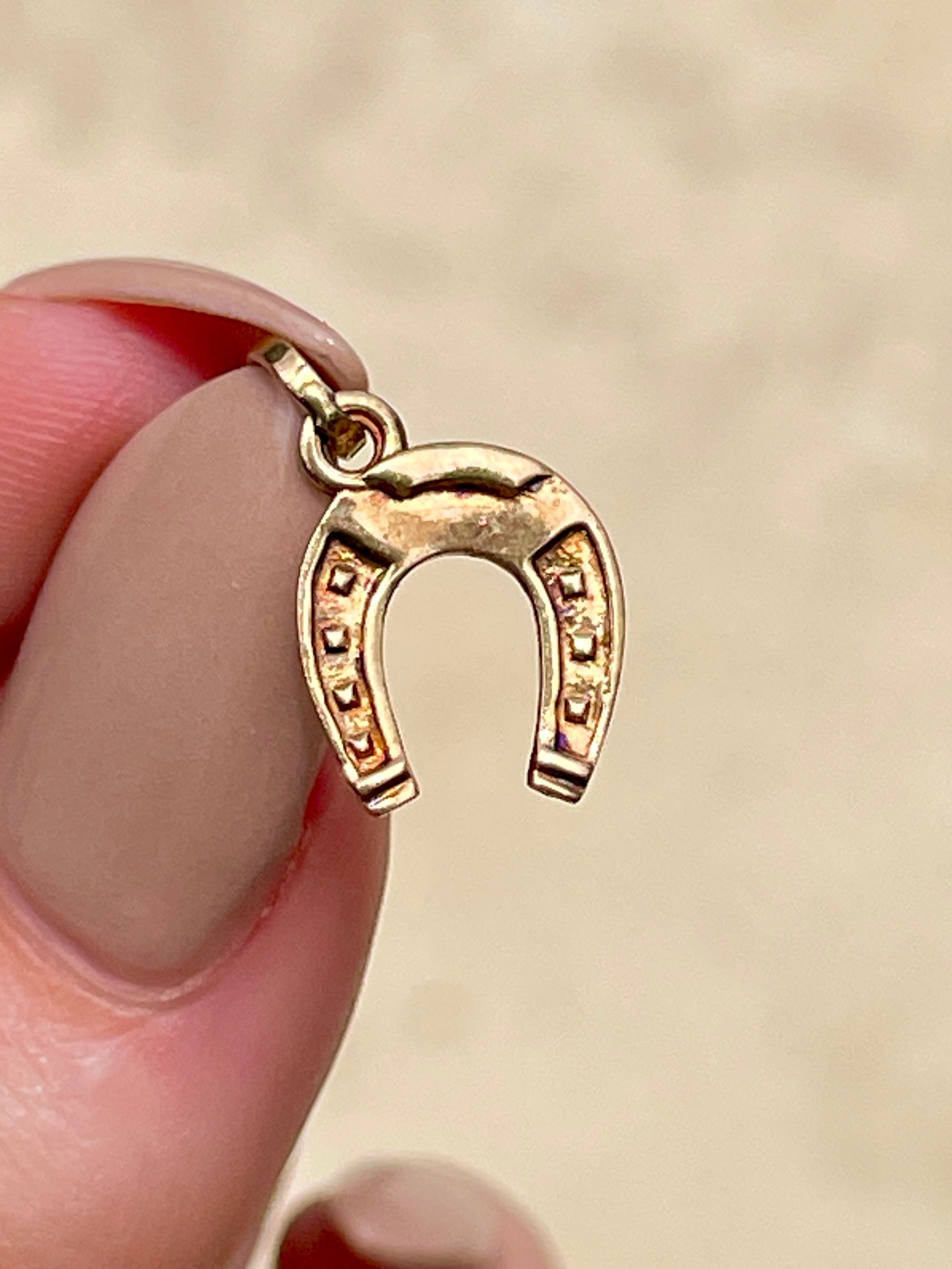 A cute Vintage rosy 18K horseshoe charm with heavy patina. Measures 18.2 mm long with bail x 10.5 mm wide. Engravings on back include "i nonni", "Sergio", "per T.M.". Weighs .9 grams. Very good preowned condition.