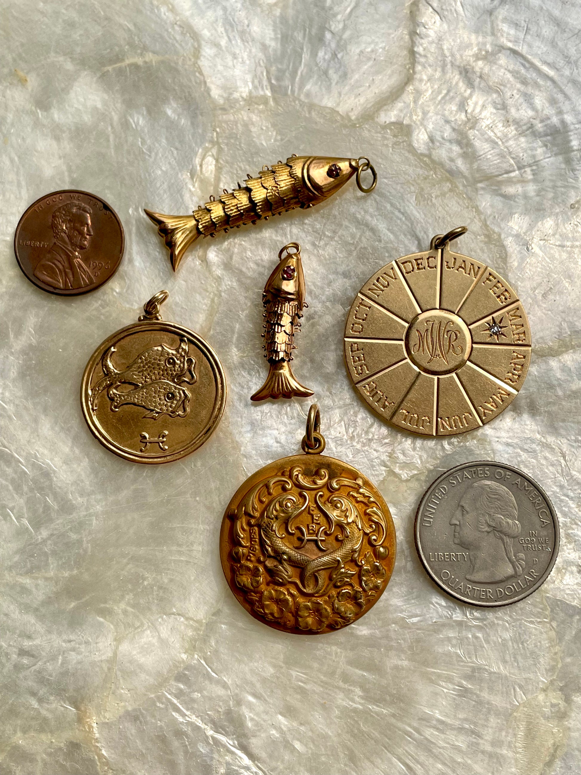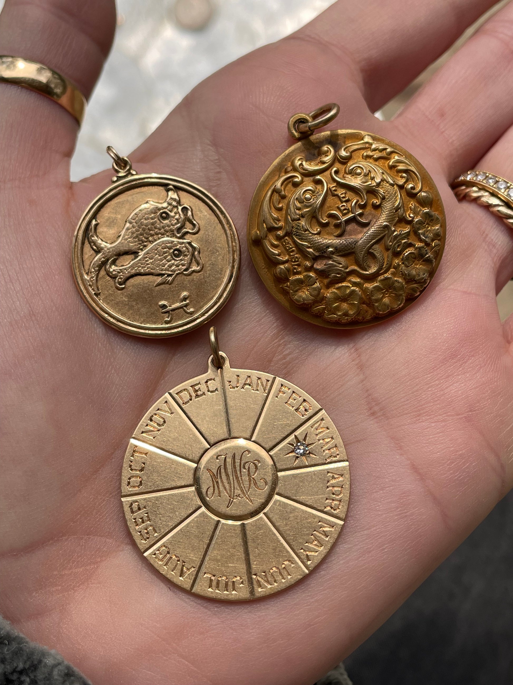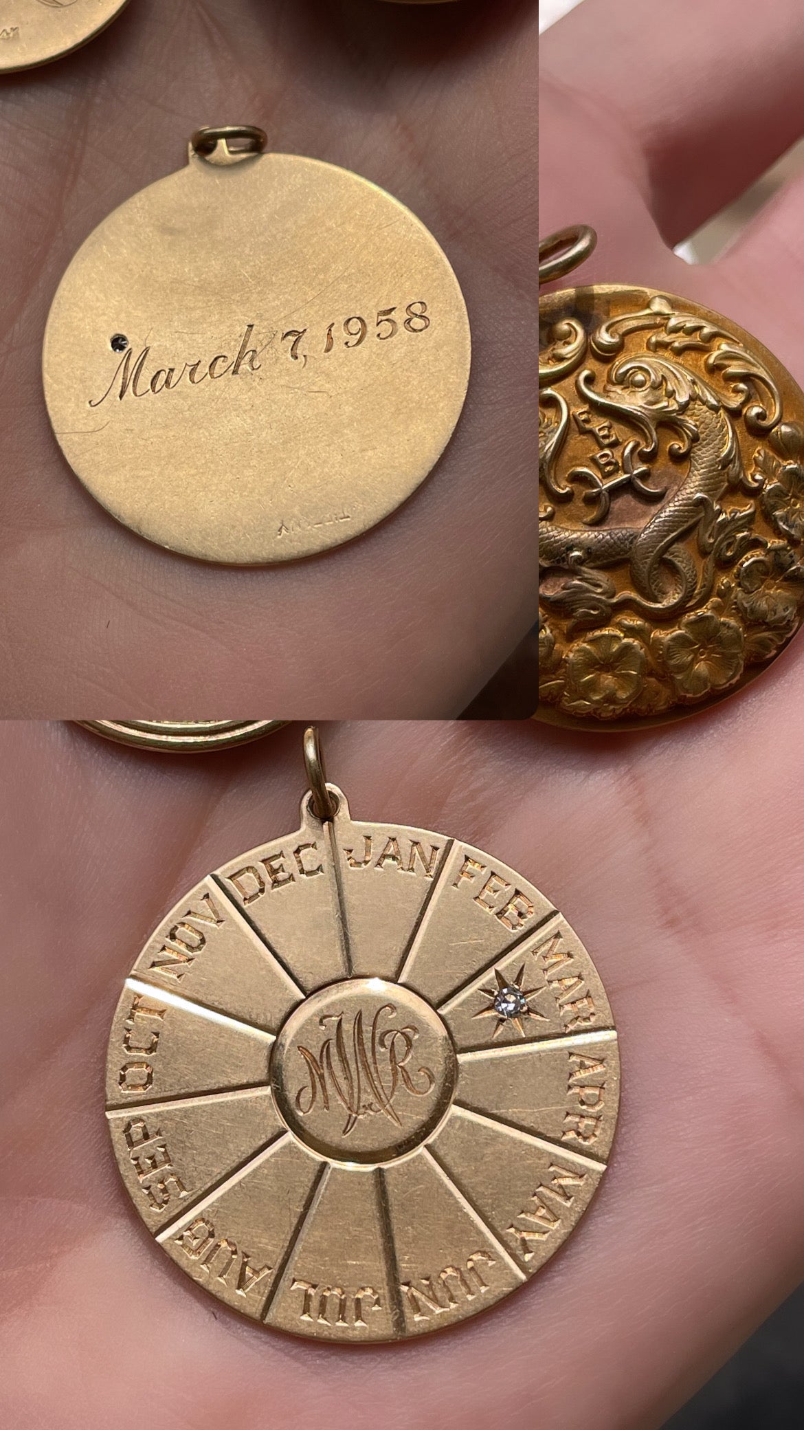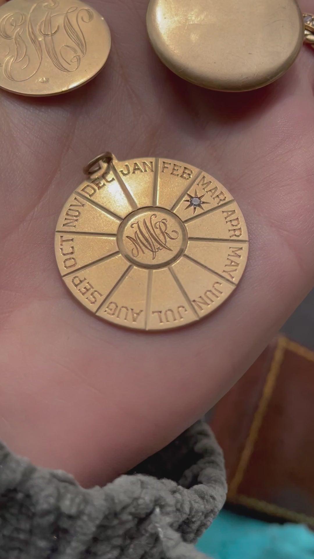 Vintage Tiffany hallmarked 14K months of the year charm with diamond inset for March, engraved “March 7, 1958” on back in beautiful hand engraved script. Weighs 10.5 grams. Measures 1.6 x 1.3 inch
