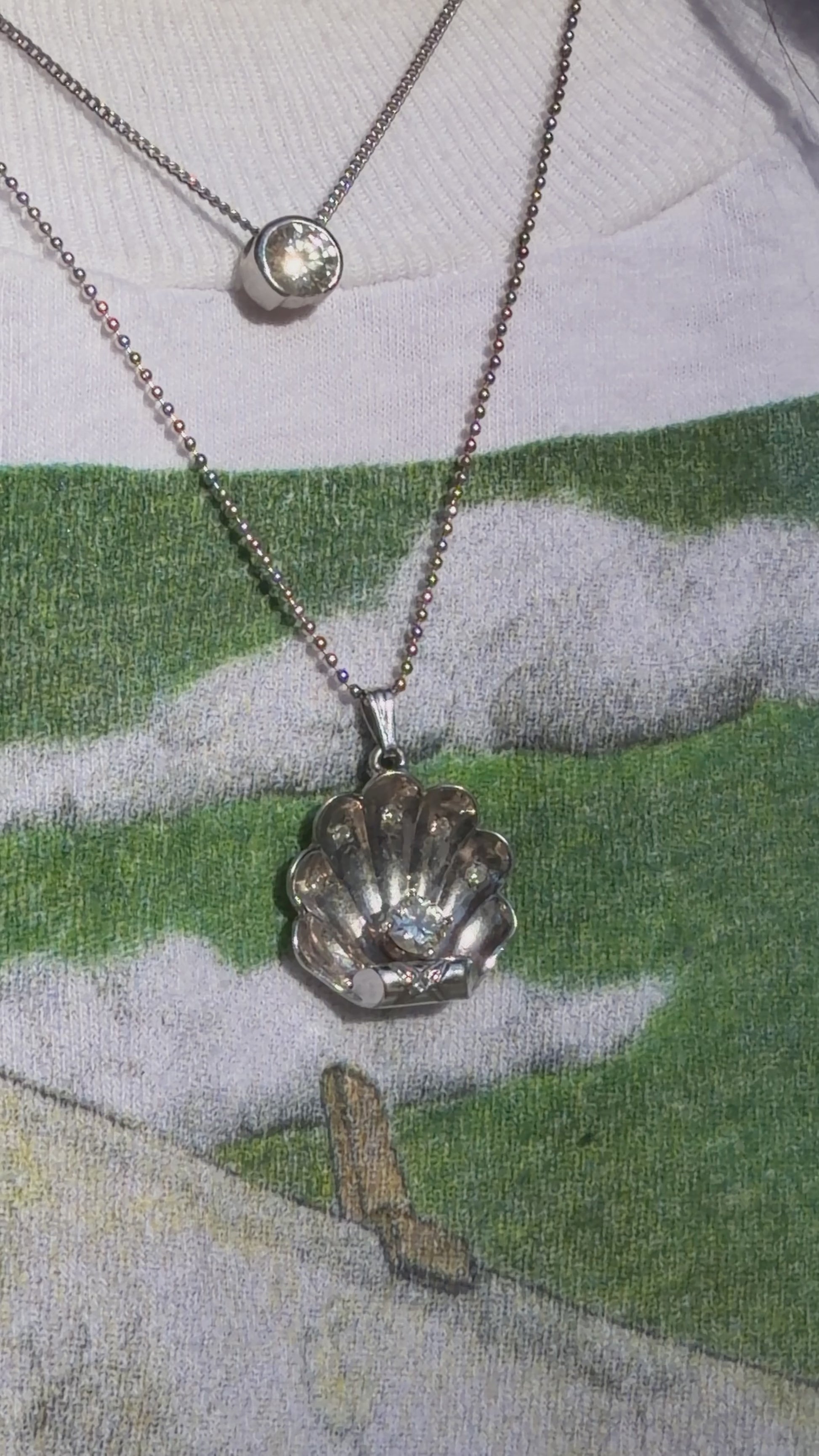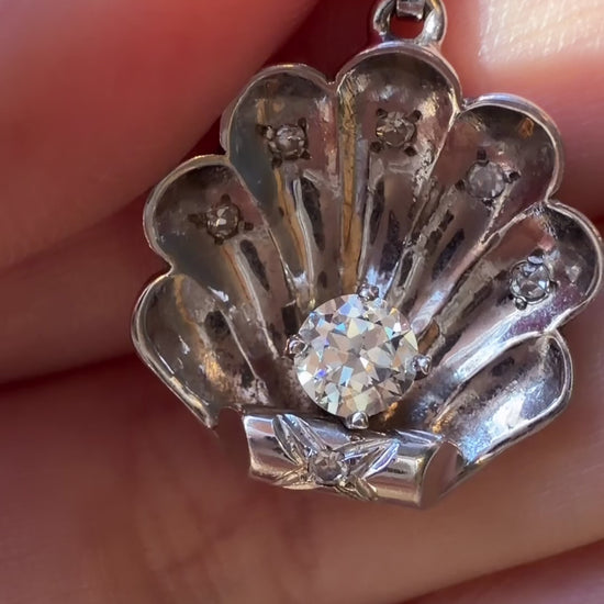 A really pretty Vintage white 14K approx .35ctw diamond shell pendant with sterling silver 18.25 inch Tiffany ball chain (came with it, just throwing it in with the piece, and it comes off the chain easily). Set with a very sparkly 4.7 x 4.8 mm center approx .35 ctw transitional cut diamond (called transitional as it marked the transition between old European cut diamonds and modern round brilliant cuts) with a open but smaller culet than an old European cut, surrounded by 6 single cut diamonds adding another .05ctw. The central diamond has a really big look and a pretty warm sparkle, approx KL color range. SI clarity only for a few scattered fluffy white inclusions under 10X loupe away from center but otherwise super clean. Pendant measures 26.5 x 19 mm, with a 4.2 mm bail opening. Open back Settings. Weighs 5.9 grams together with chain, and 3.8 grams pendant alone. Hallmarked.