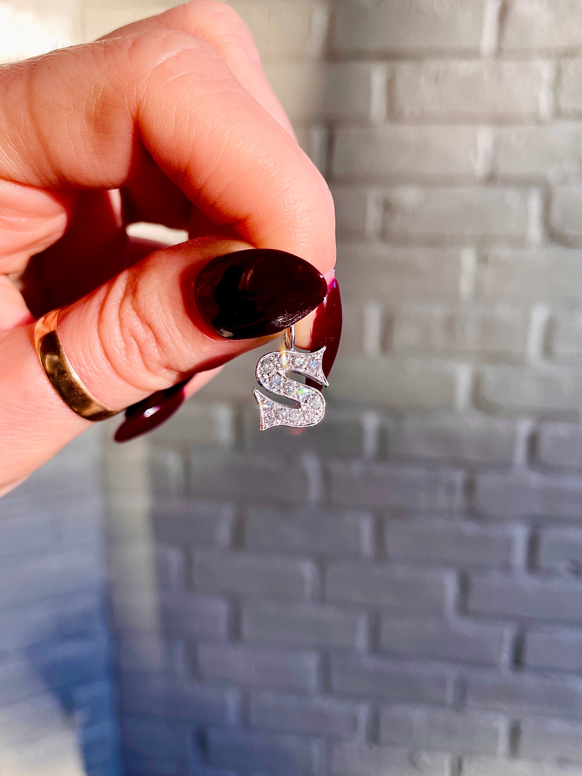 A really great Vintage white 14K letter S charm with .39 ctw diamonds. Measures 16.4 mm tall with bale and 11 mm across. In very good preowned vintage condition. Weighs 1.1 grams. In very good preowned vintage condition.