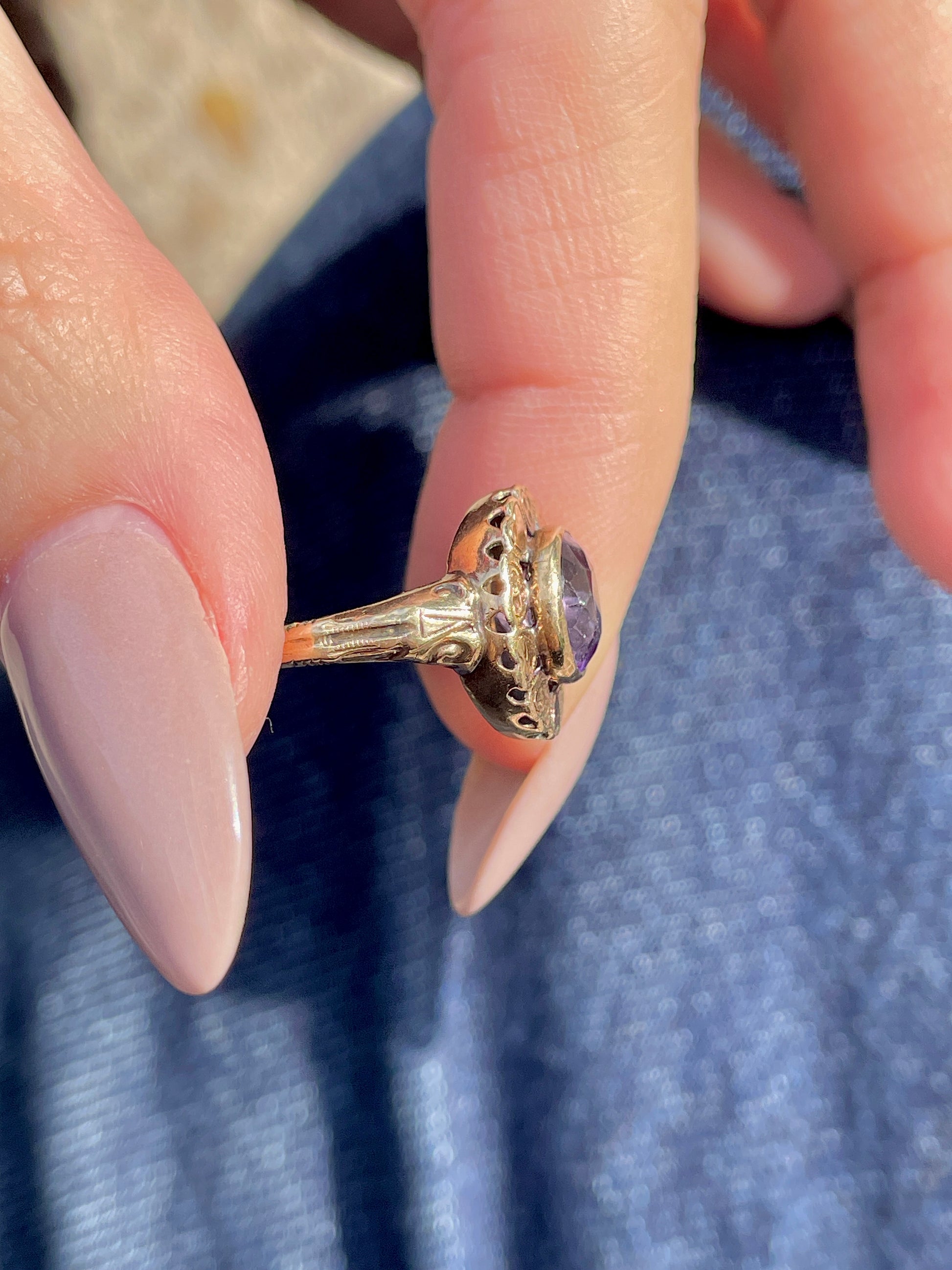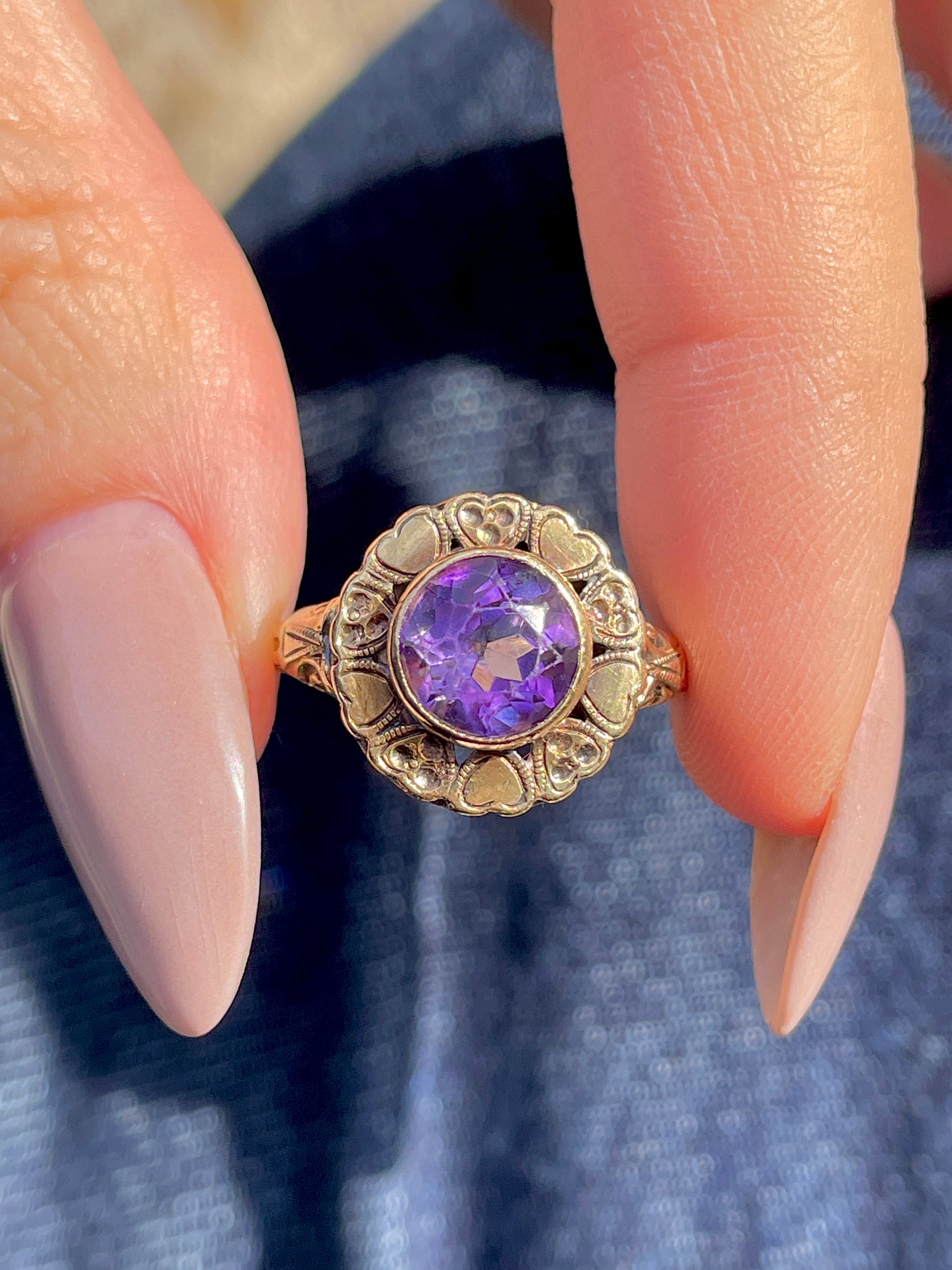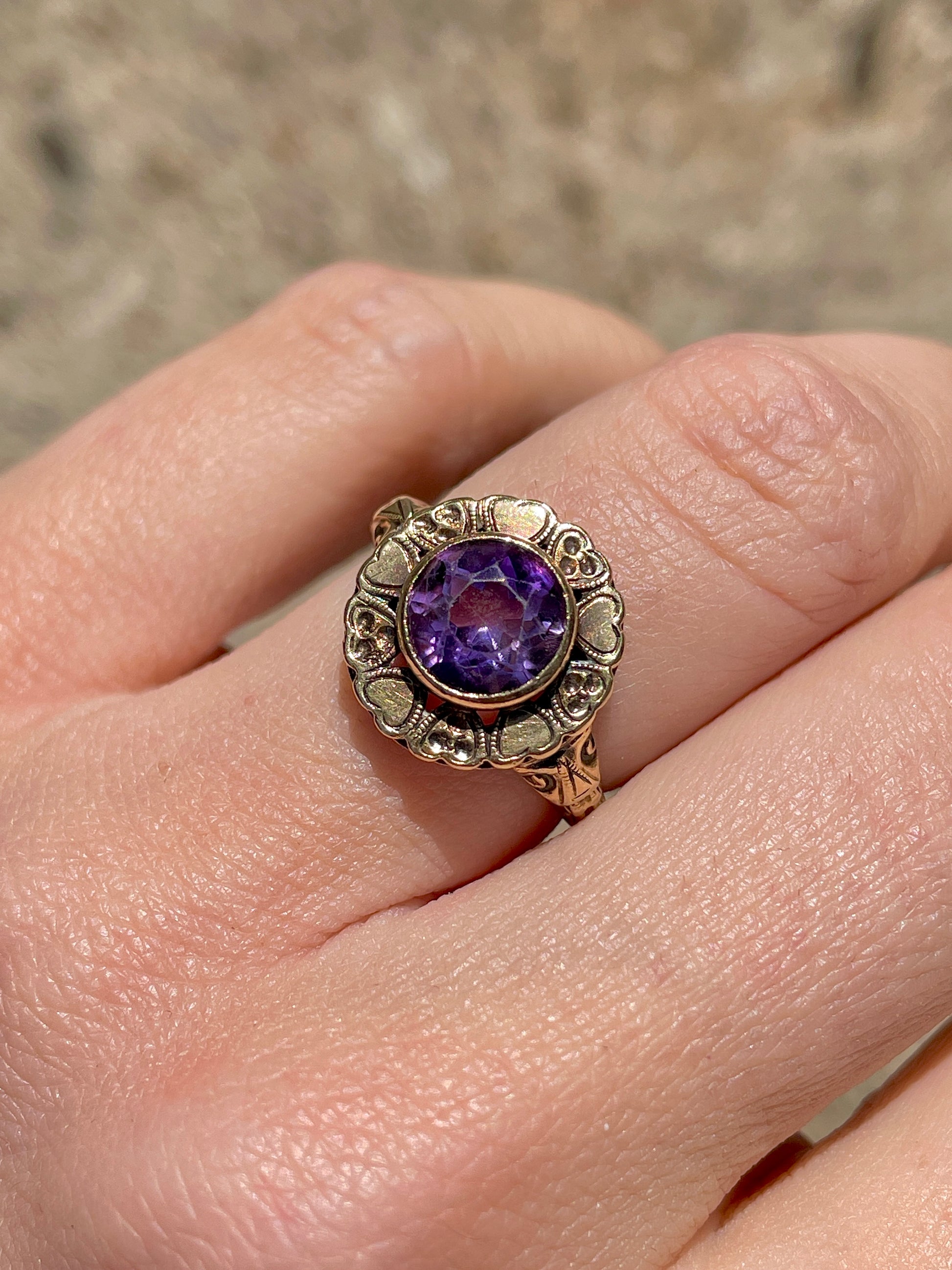 Antique yellow 10K amethyst heart design ring, size 5.5