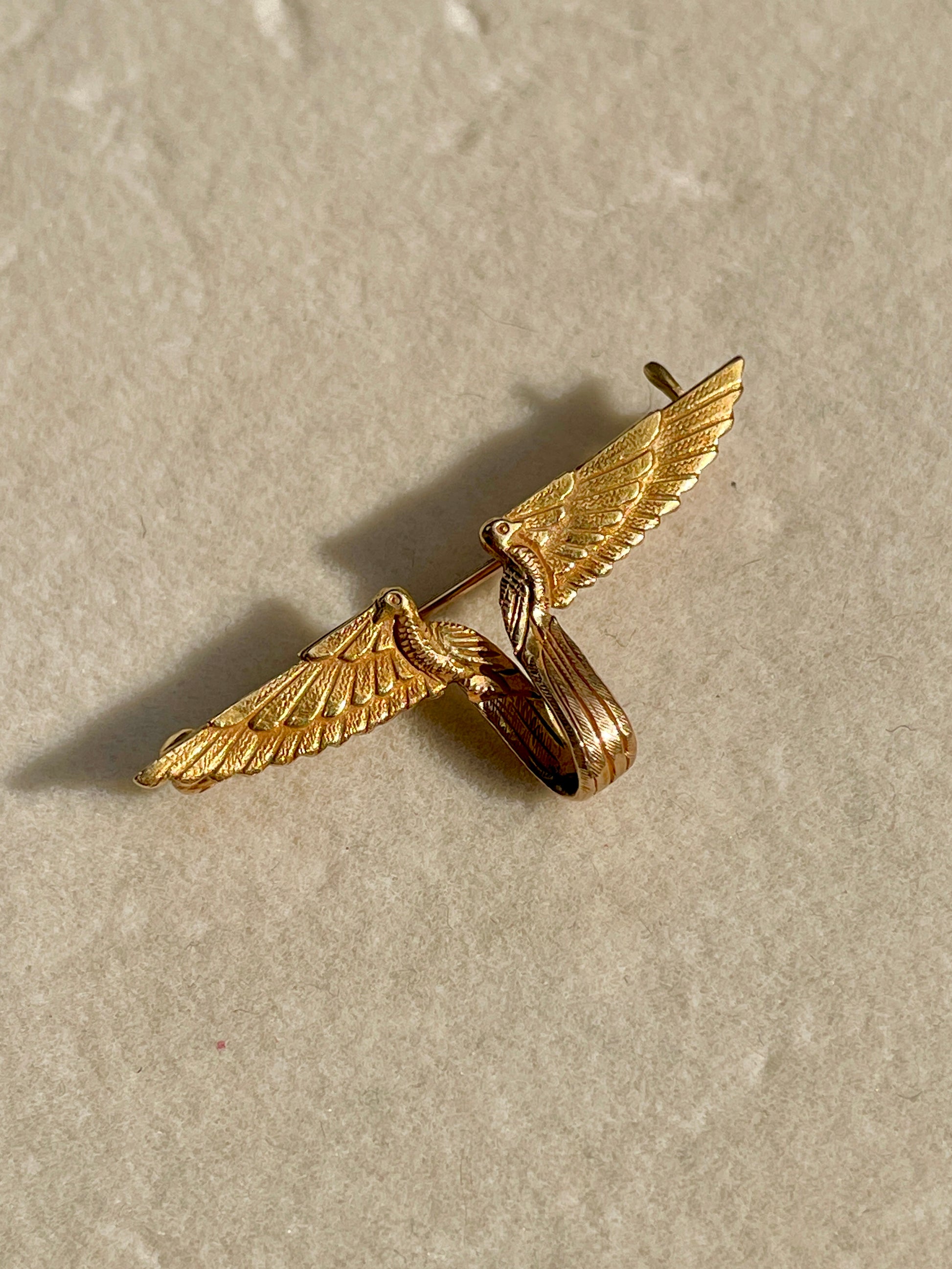 A truly gorgeous 10K gold art nouveau era pin featuring birds with outstretched wings and highly detailed feathers, 1.5 inch long. With a rich high karat bloomed gold finish. Pin function is intact and works well. Weighs 2.3 grams. In excellent preowned vintage condition.