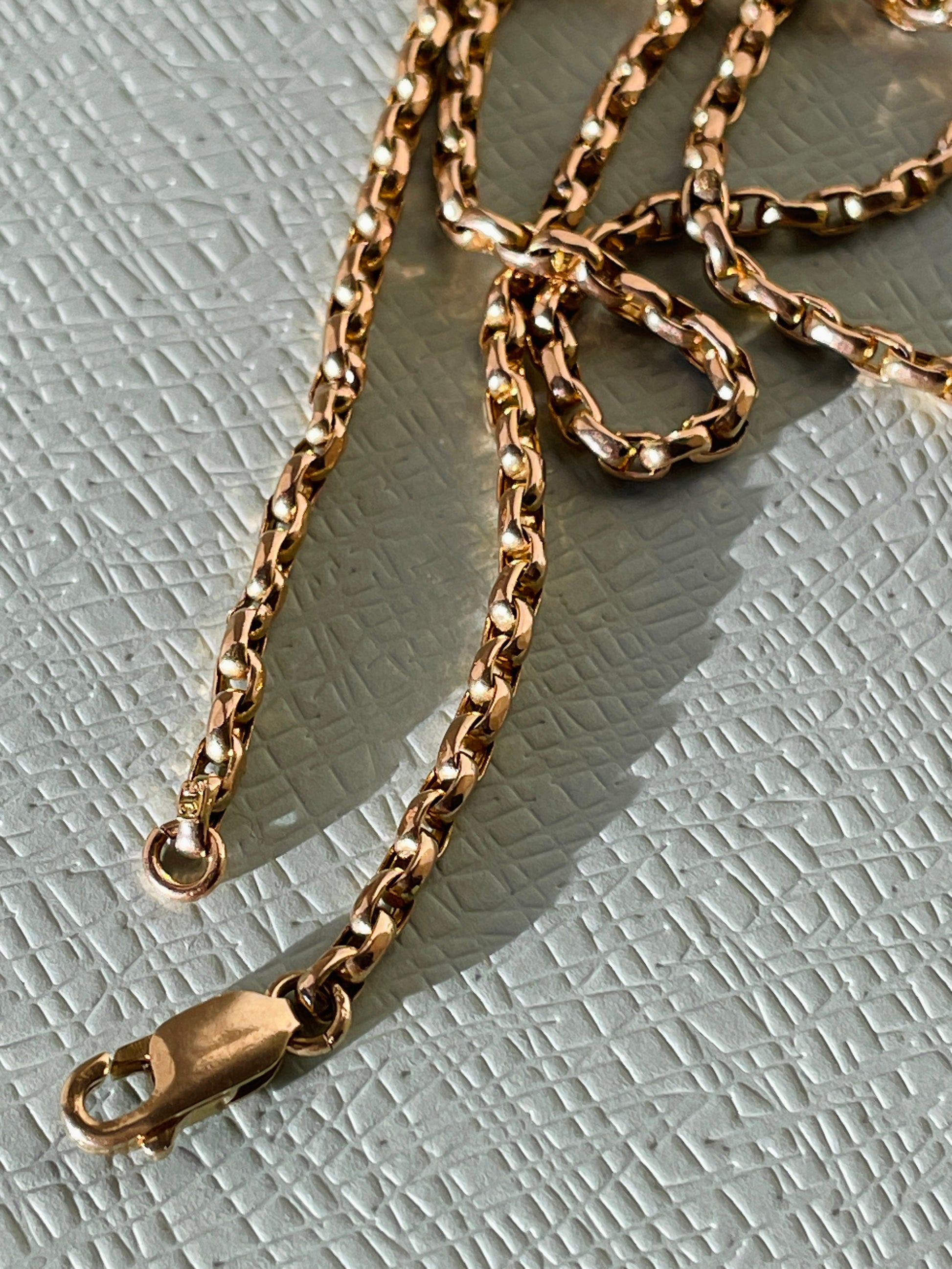 A great Antique slightly rosy yellow 10K tested gold faceted belcher link chain with a newer 14K gold lobster clasp, 26.5 inch. Measures 2.8 mm wide. Weighs 13 grams. In good preowned condition. Chain is marked 9C. Clasp is marked 14K.