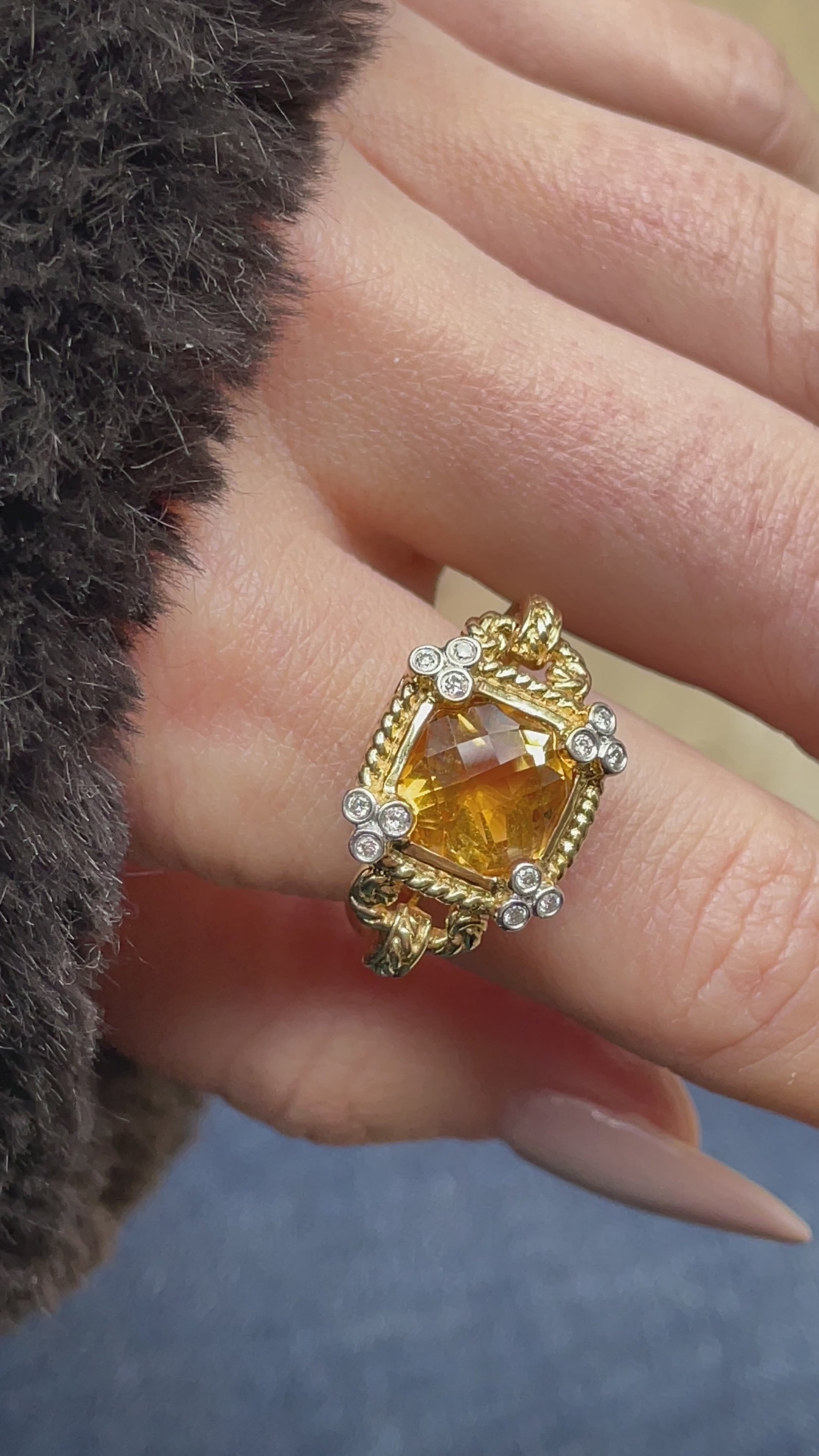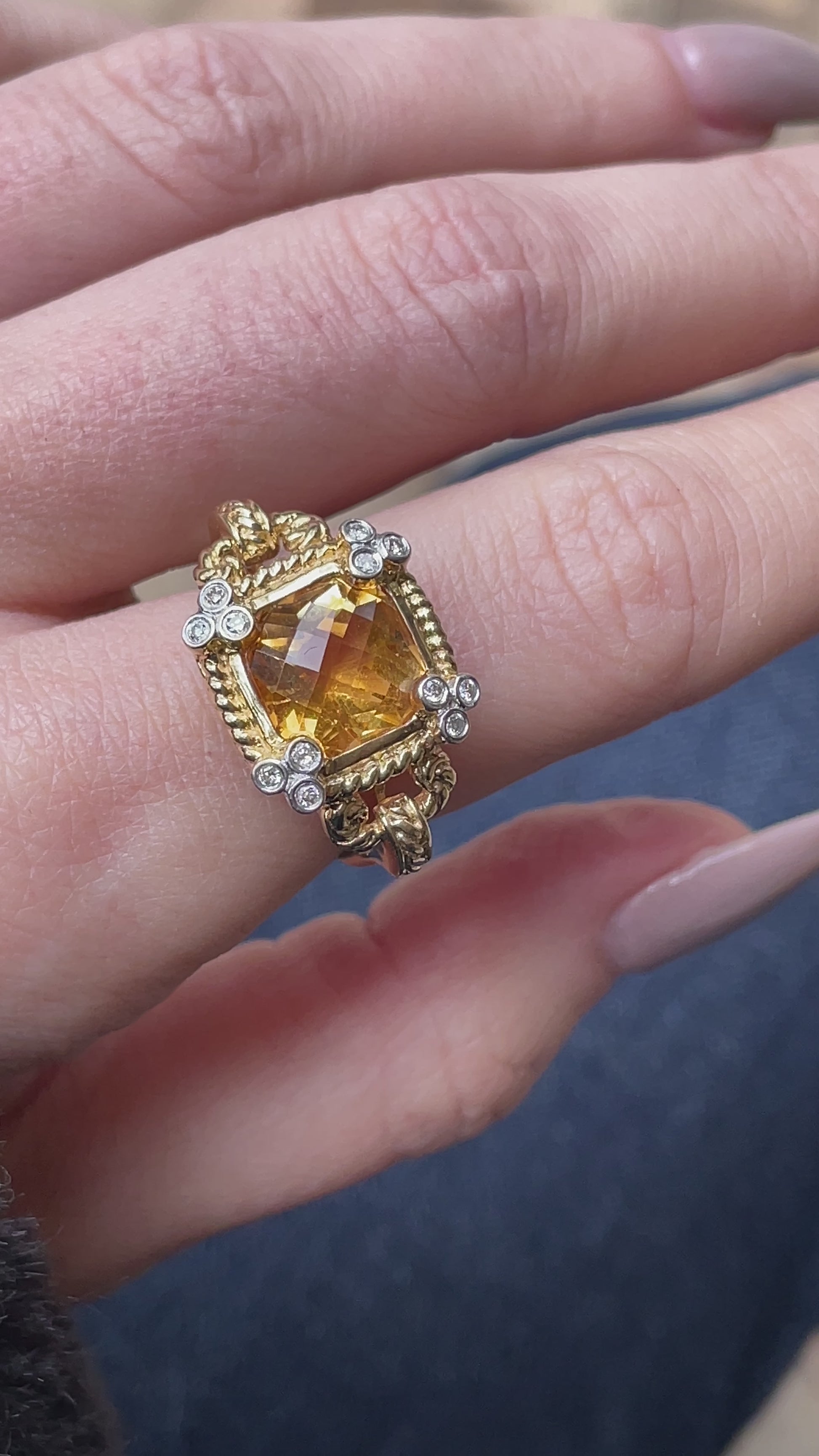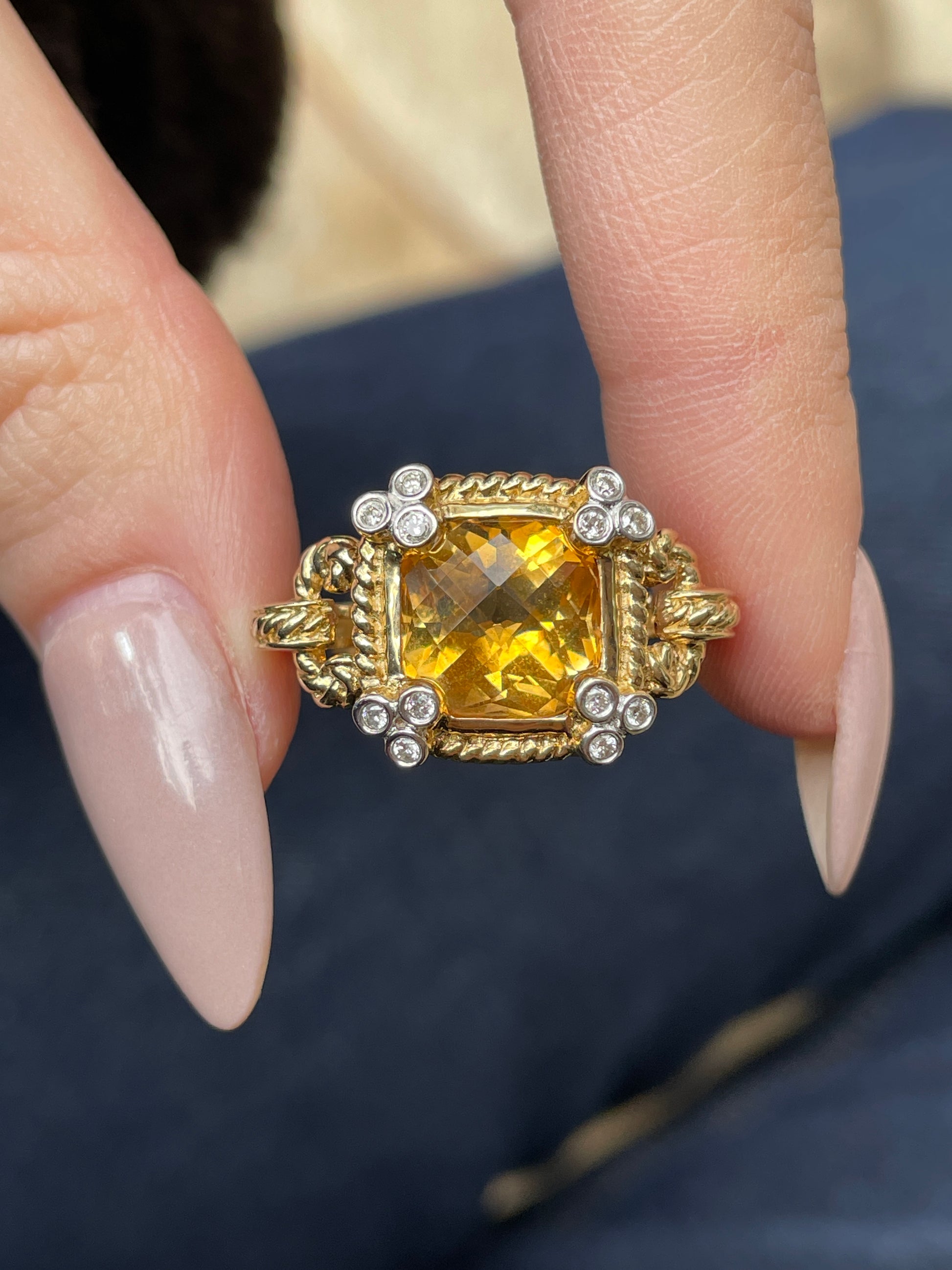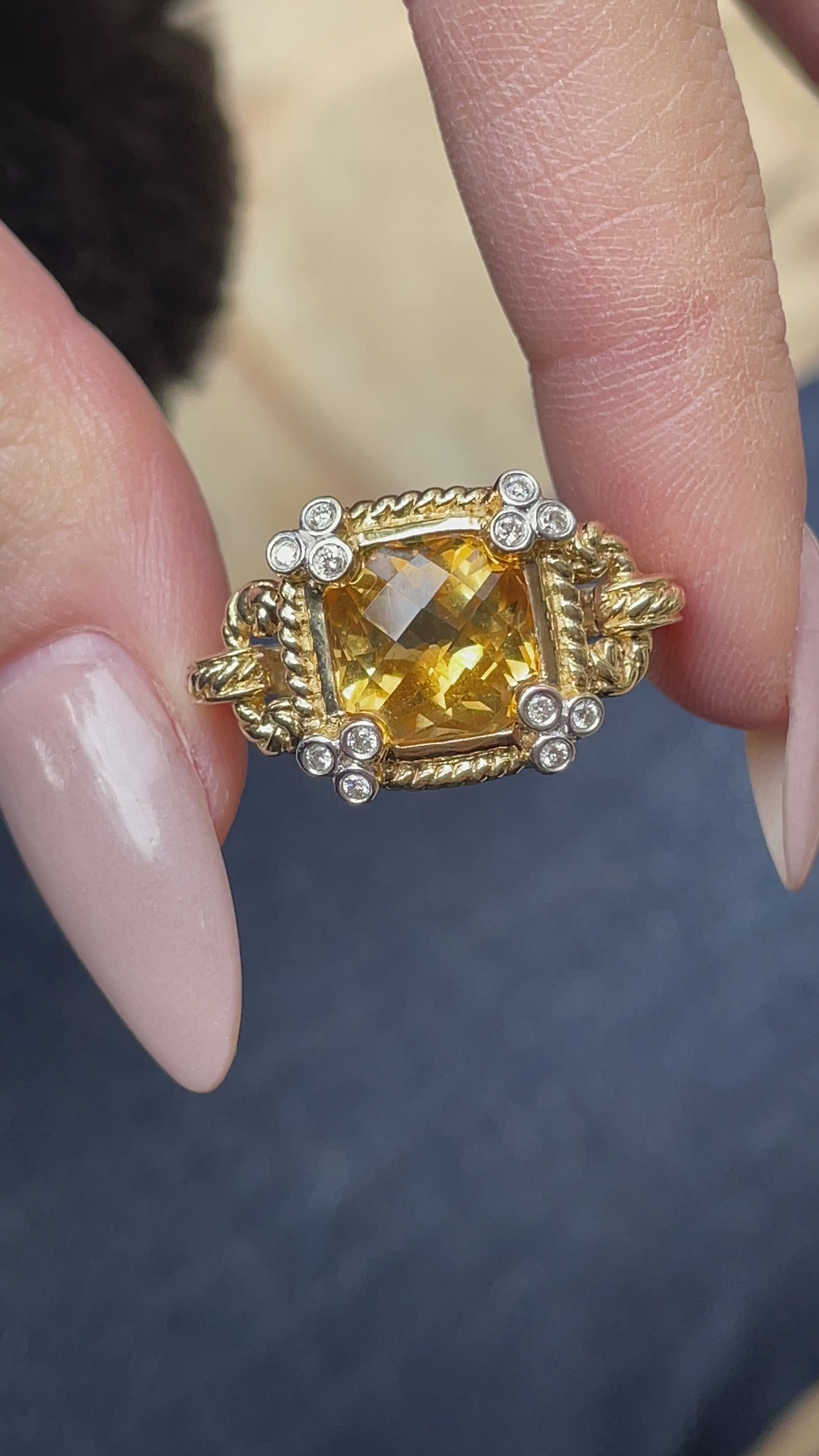 Vintage yellow 14K checkerboard cut 1.8 ctw citrine and .12 ctw diamond ring, size 7. Sizable. Measures 14.3 mm widest. Citrine measures 9.6 x 9.6 mm. Weighs 7.1 grams. In very good preowned condition.
