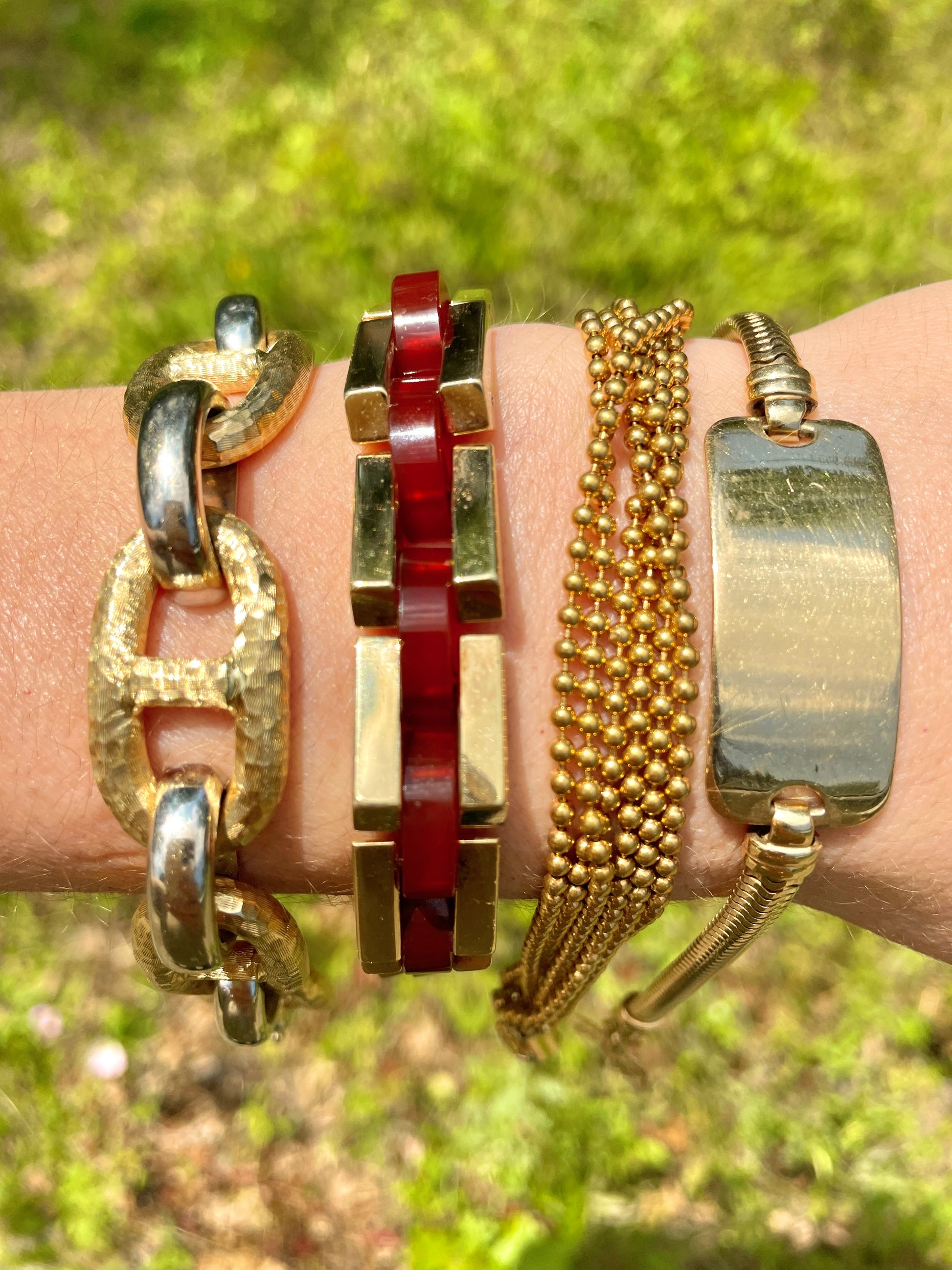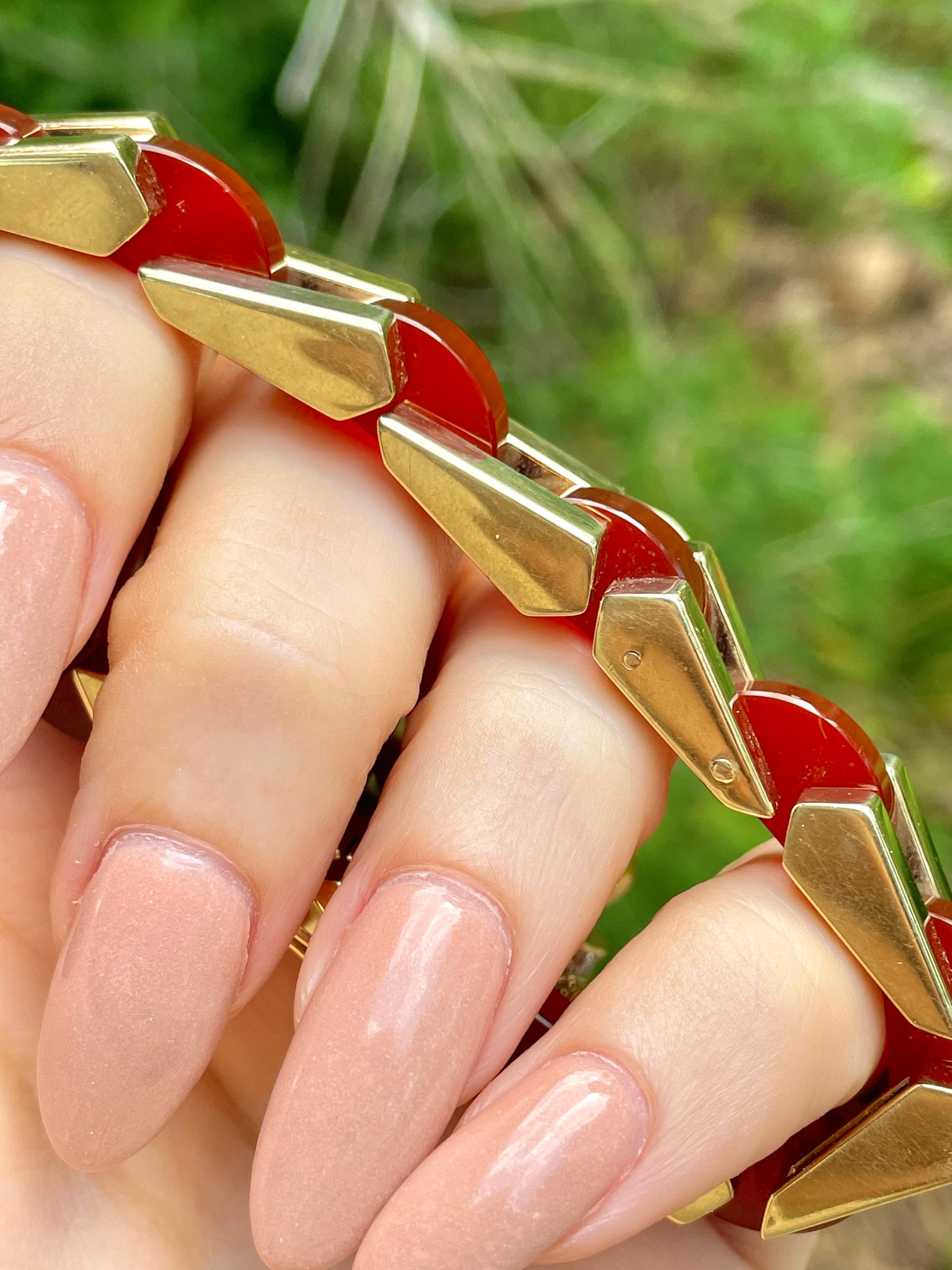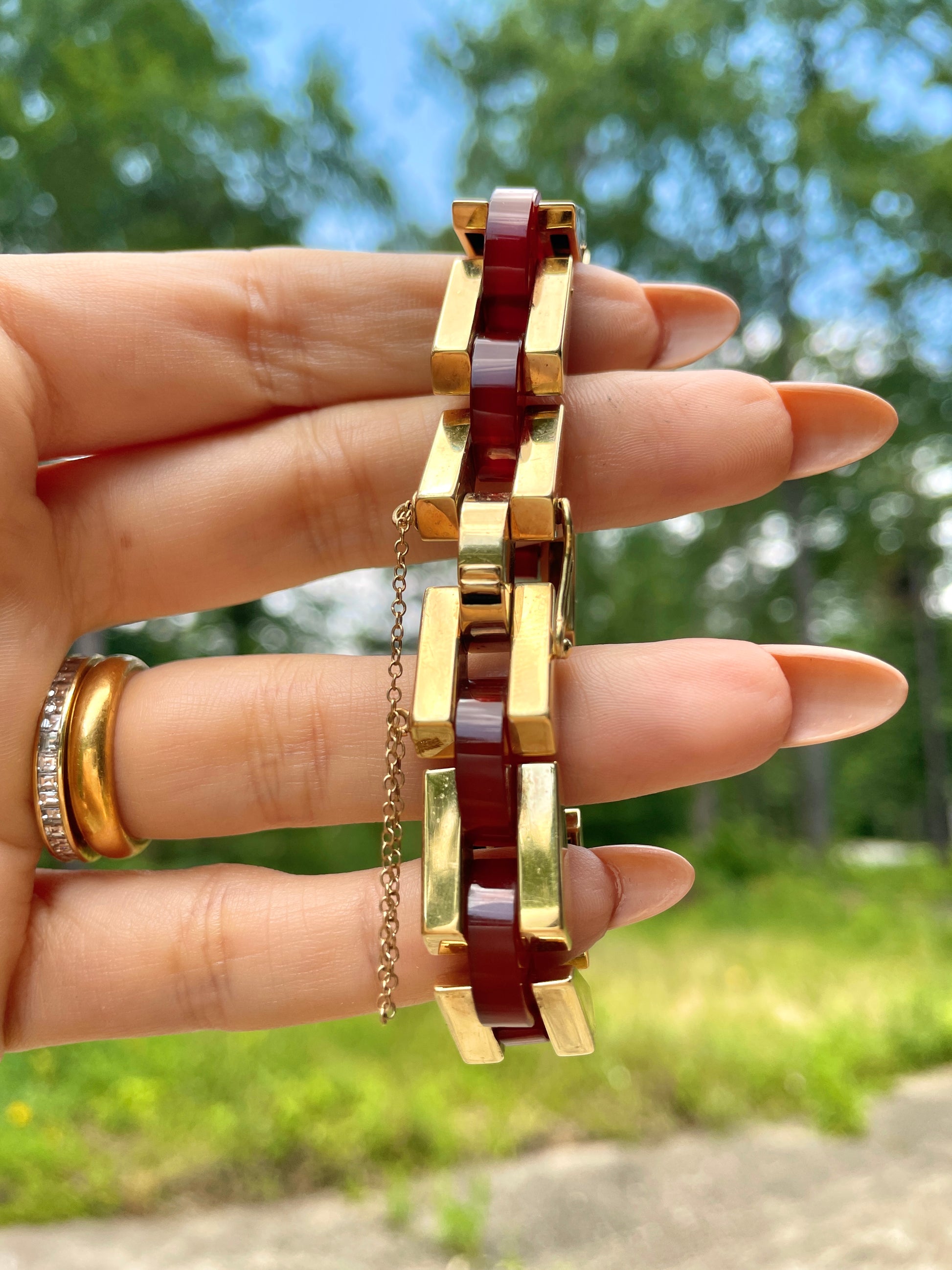 A super awesome Vintage yellow 14K and carnelian angled link bracelet, 7.25 inch long. Love the chunkiness and edge of this funky angular bracelet link - the red carnelian half moon links add such an earthy and colorful touch! Link is 12.4 mm wide. Continuous closure is tight and secure with a side safety and original safety chain intact. Weighs 39.2 grams. In very good preowned vintage condition. No damage to carnelian links.