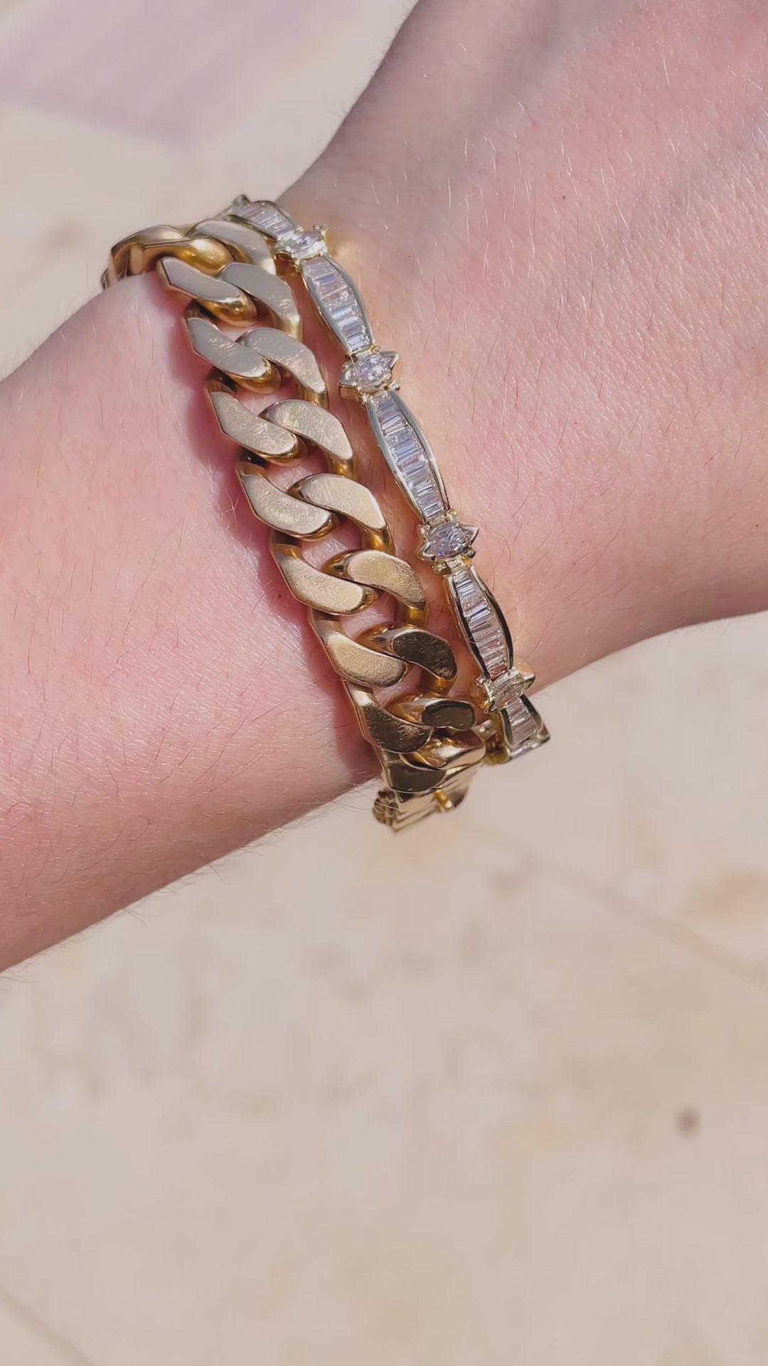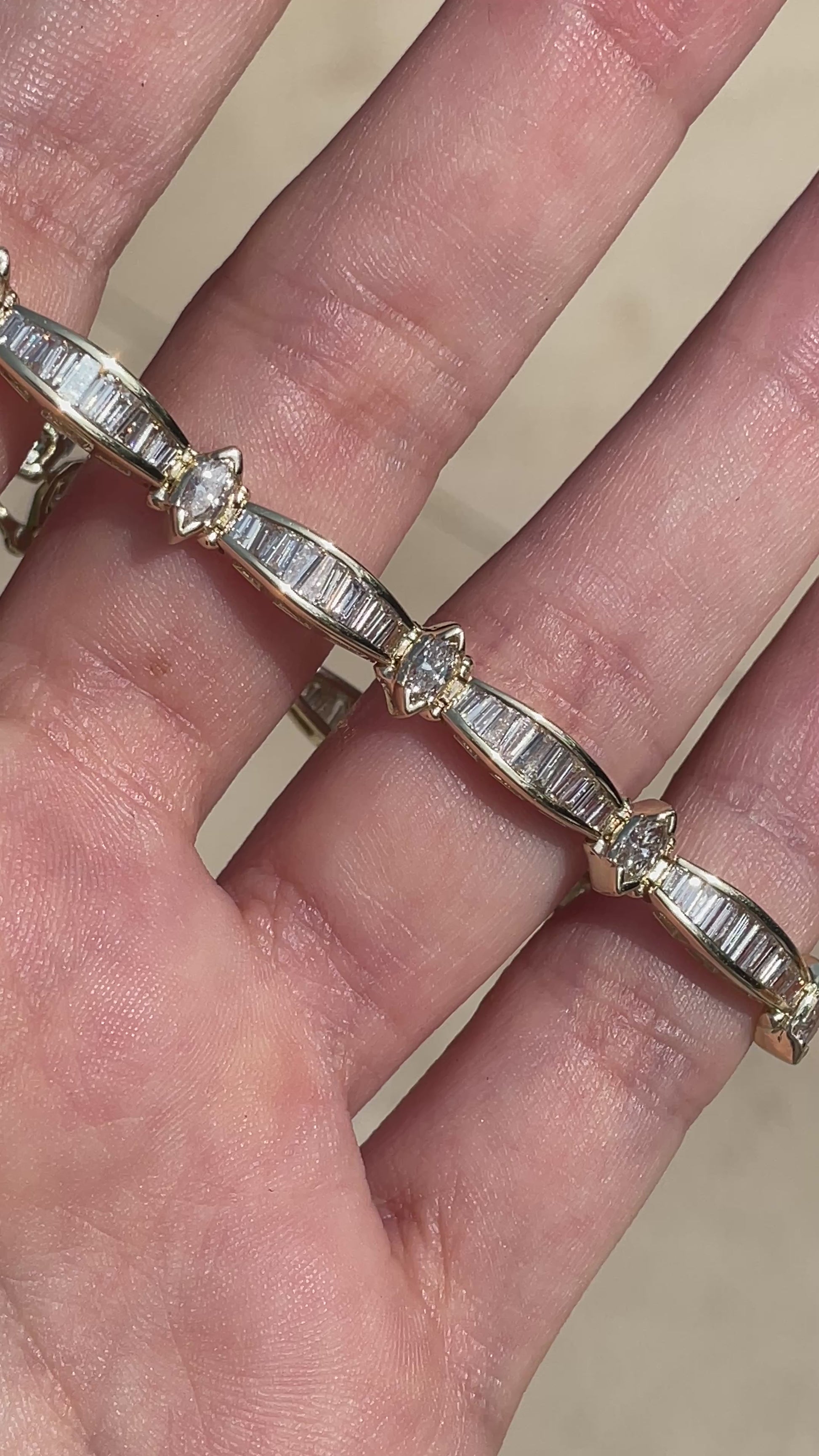 A super sparkly yellow 14K gold approx 5.5 total carat weight marquise and baguette diamond bracelet, 7.5 inch. Measures 6.7 mm widest. Averaging estimated GH color, and averaging SI clarity. Weighs 14.7 grams. Very good preowned condition.