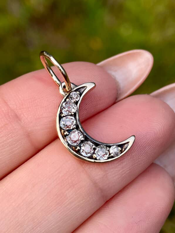 A beautiful Vintage yellow 14K approx .52 ctw old mine cut diamond crescent pendant. Pendant is nicely made with blackened finish behind the stones, measuring 15x11 mm without the bale. Very good preowned condition.