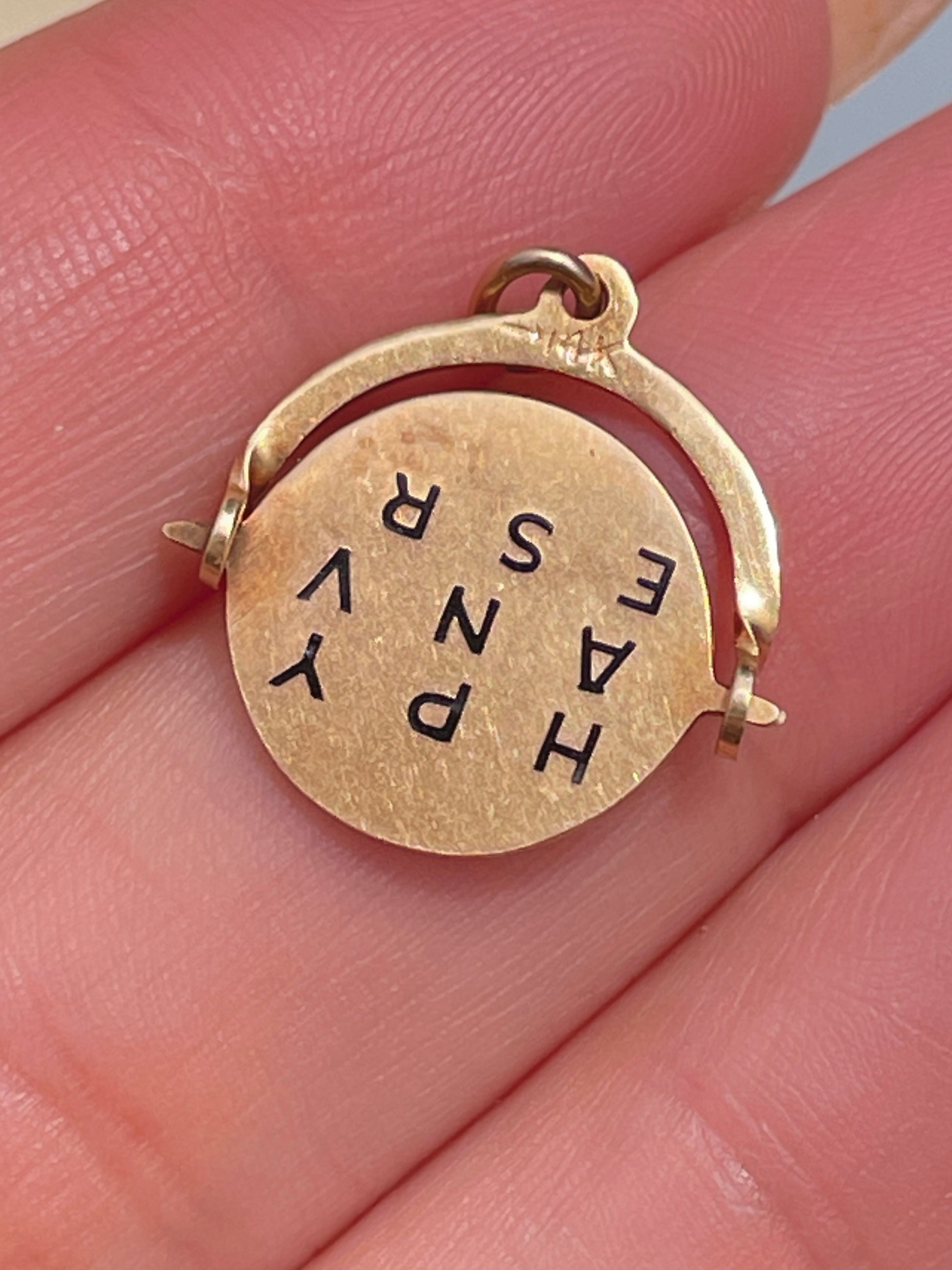 Vintage yellow 14K blue enamel Happy Anniversary spinner charm