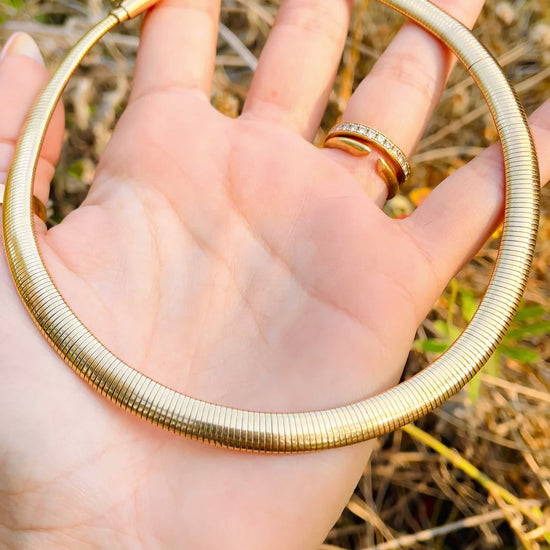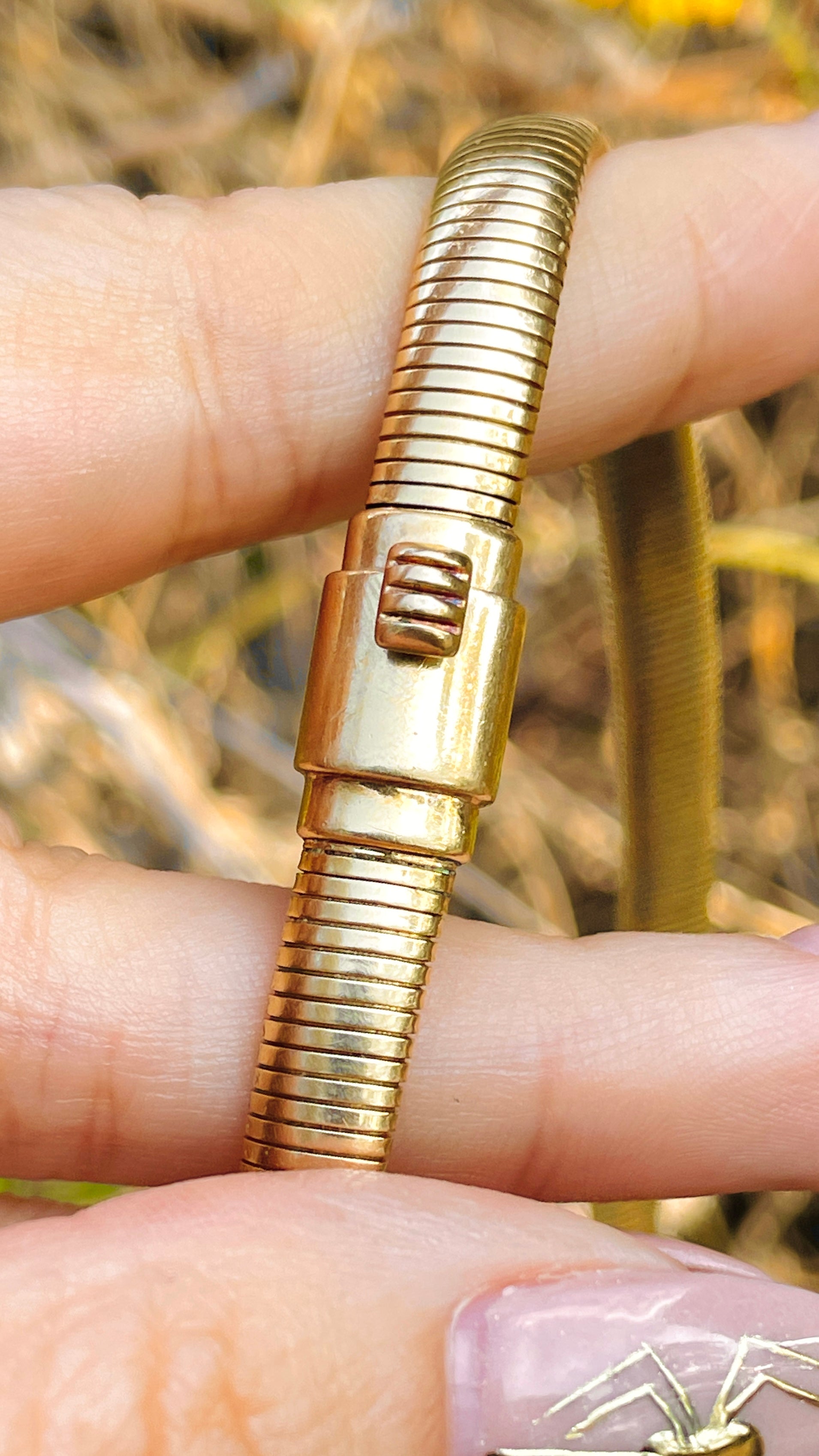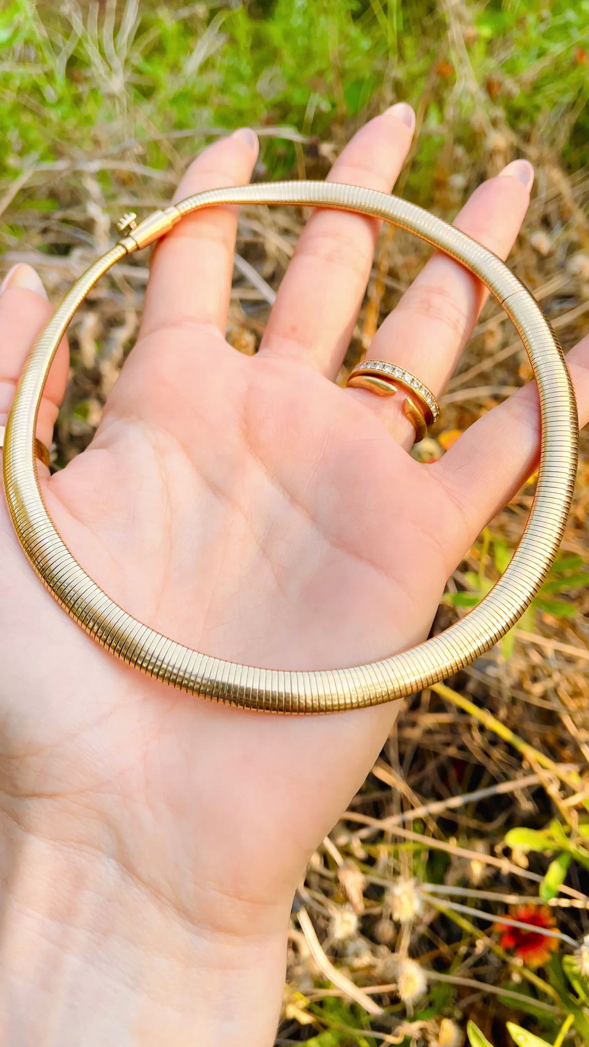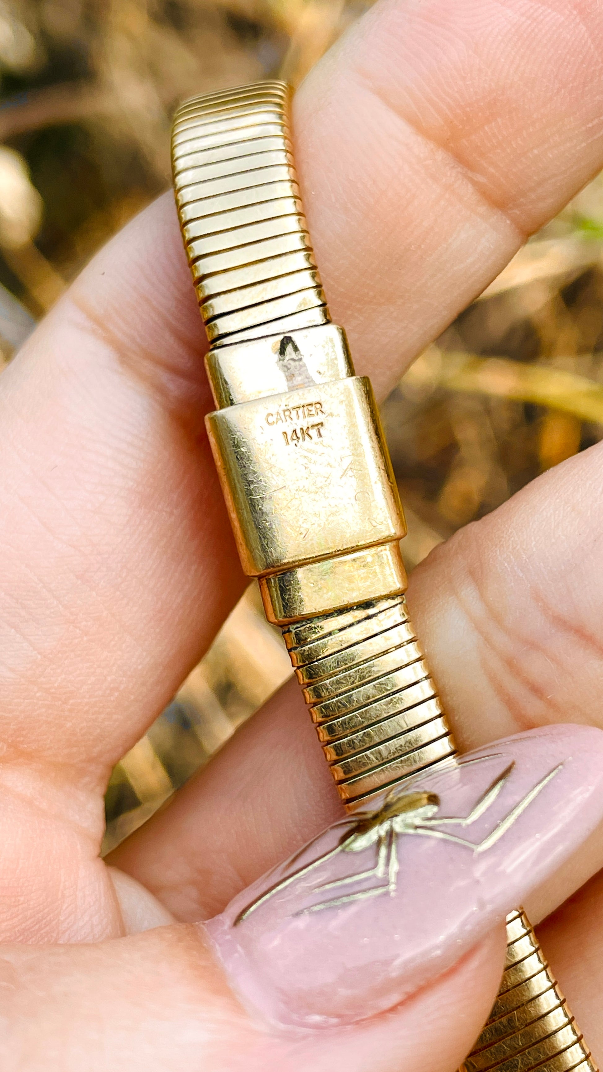 A highly wearable and super chic Vintage yellow 14K Cartier snake chain Tubogas collar chain, 15 inch but stretchy up to 17 inch. So comfortable on!Measures 6.9 mm wide. Hallmarked Cartier and 14K for 14K gold. Very good preowned condition, with a couple slight bends that aren't visible when chain is worn. There is one presumably very old repair mark underneath the clasp which is darker in color. Weighs 32.6 grams.