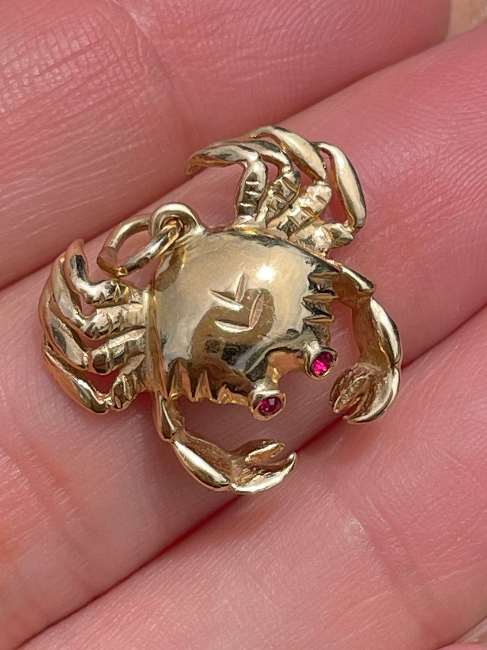A really charming 3 dimensional Vintage yellow 14K crab pendant with ruby eyes. A nice size, measures 20.2 mm long x 20.1 mm wide. Weighs 3 grams. Very good preowned condition.
