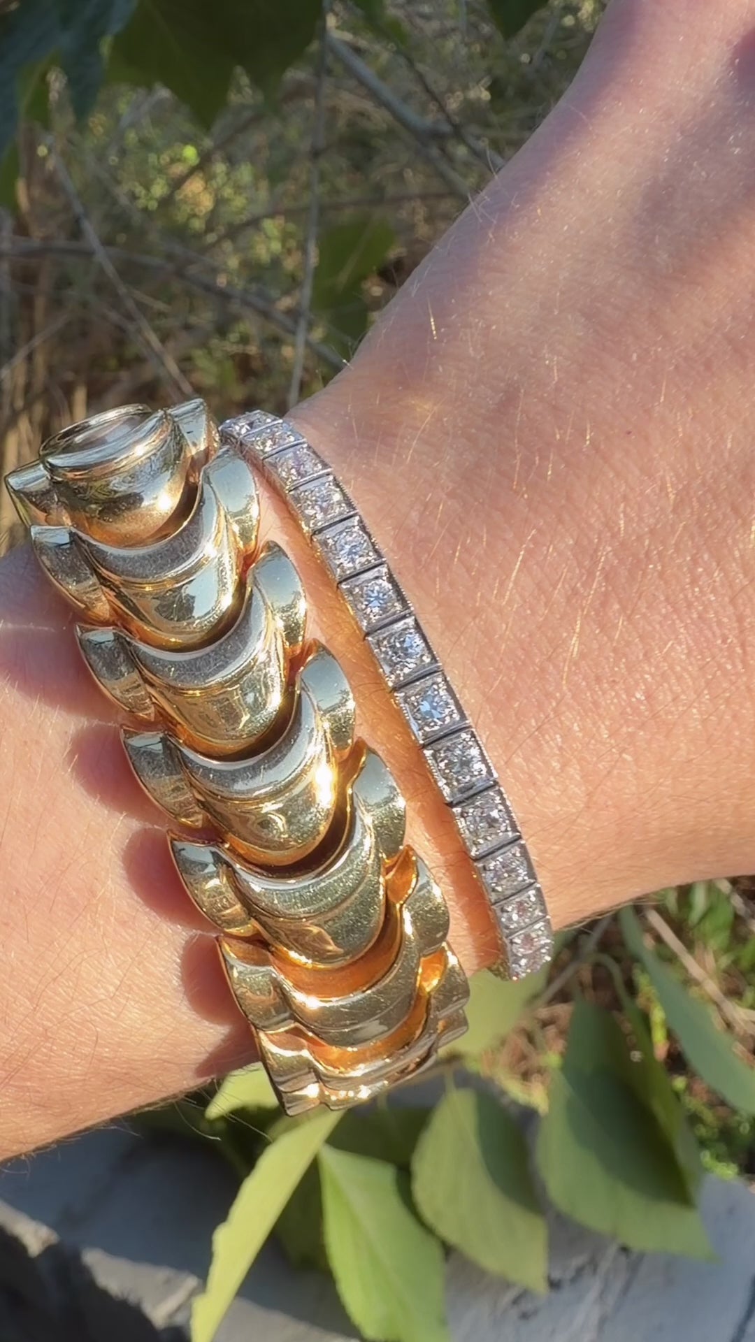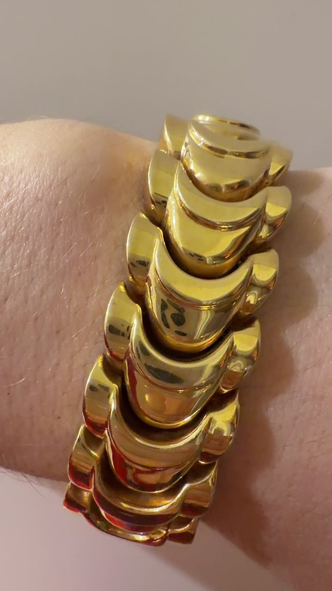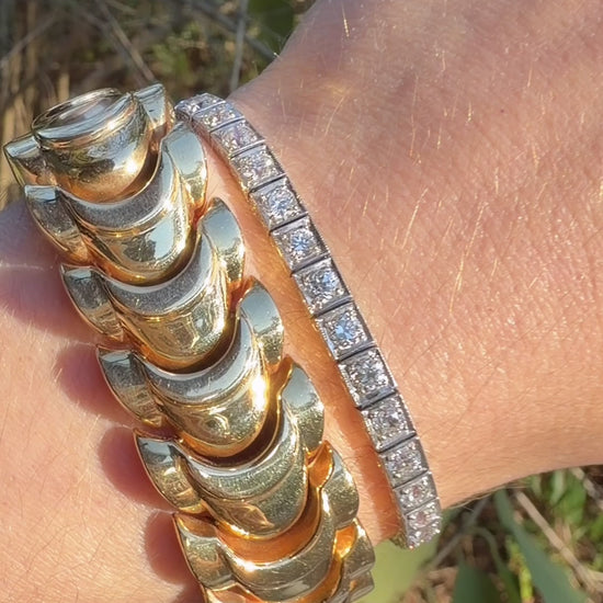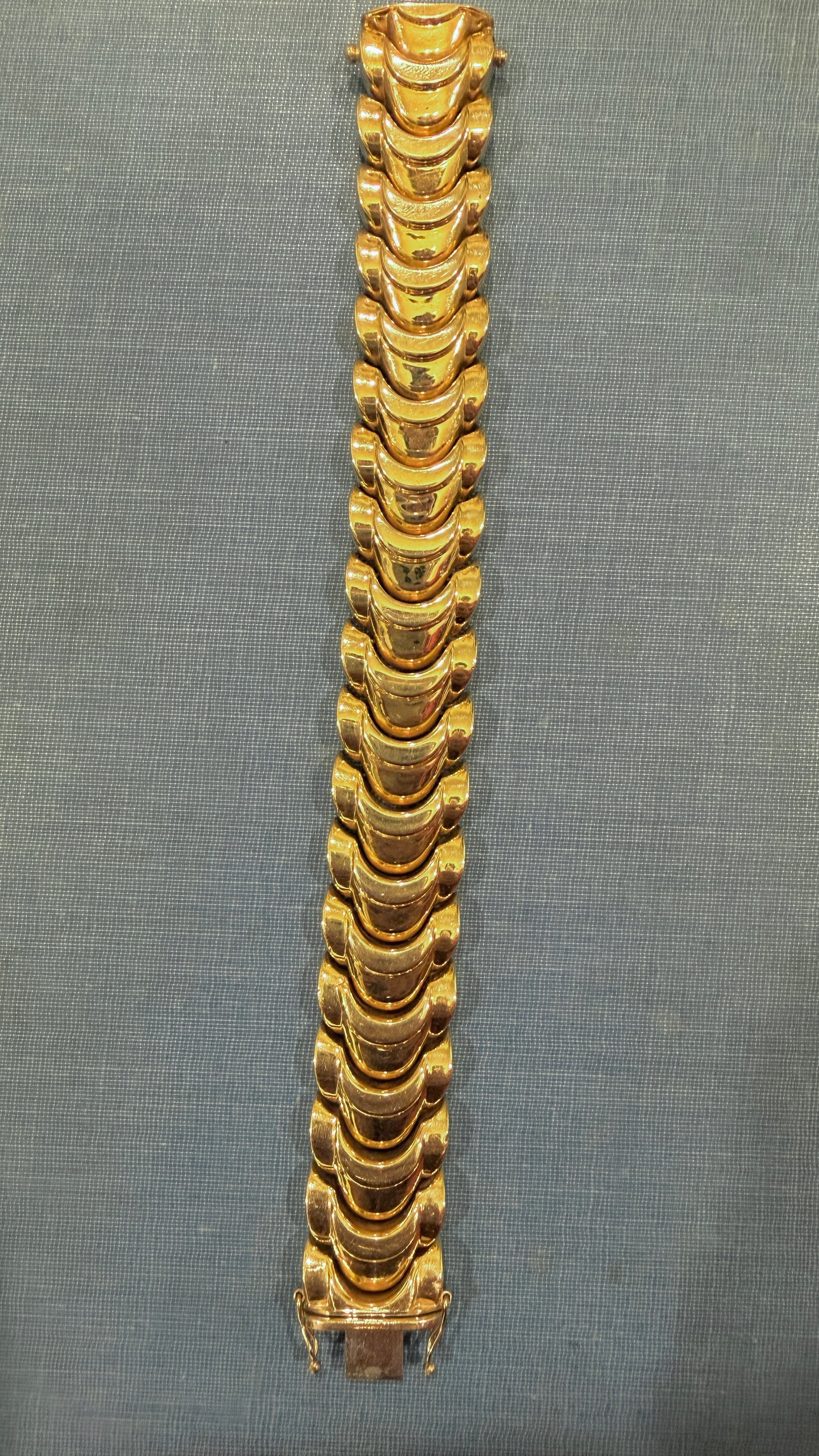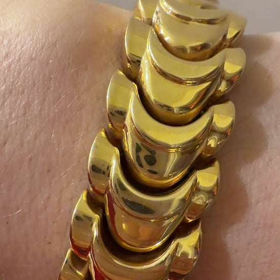 A bold Vintage yellow 14K crescent moon-esque link bracelet, 6.5 inch fit due to width. Sizable. Such a great standalone or layered piece that makes an impact! So chic and feels great on. Measure 19.5 mm wide. Weighs 47.1 grams. Hallmarked 14K. Secure clasp with side safety clasps. Very good preowned condition, no meaningful dents.