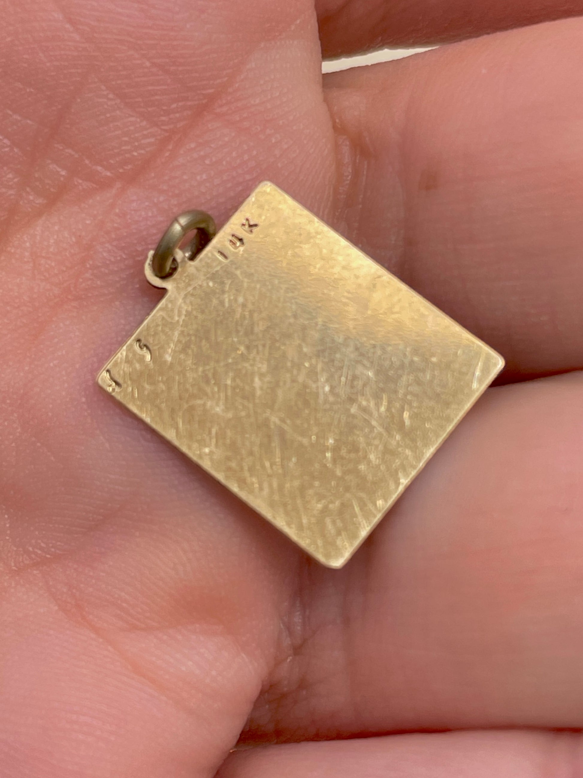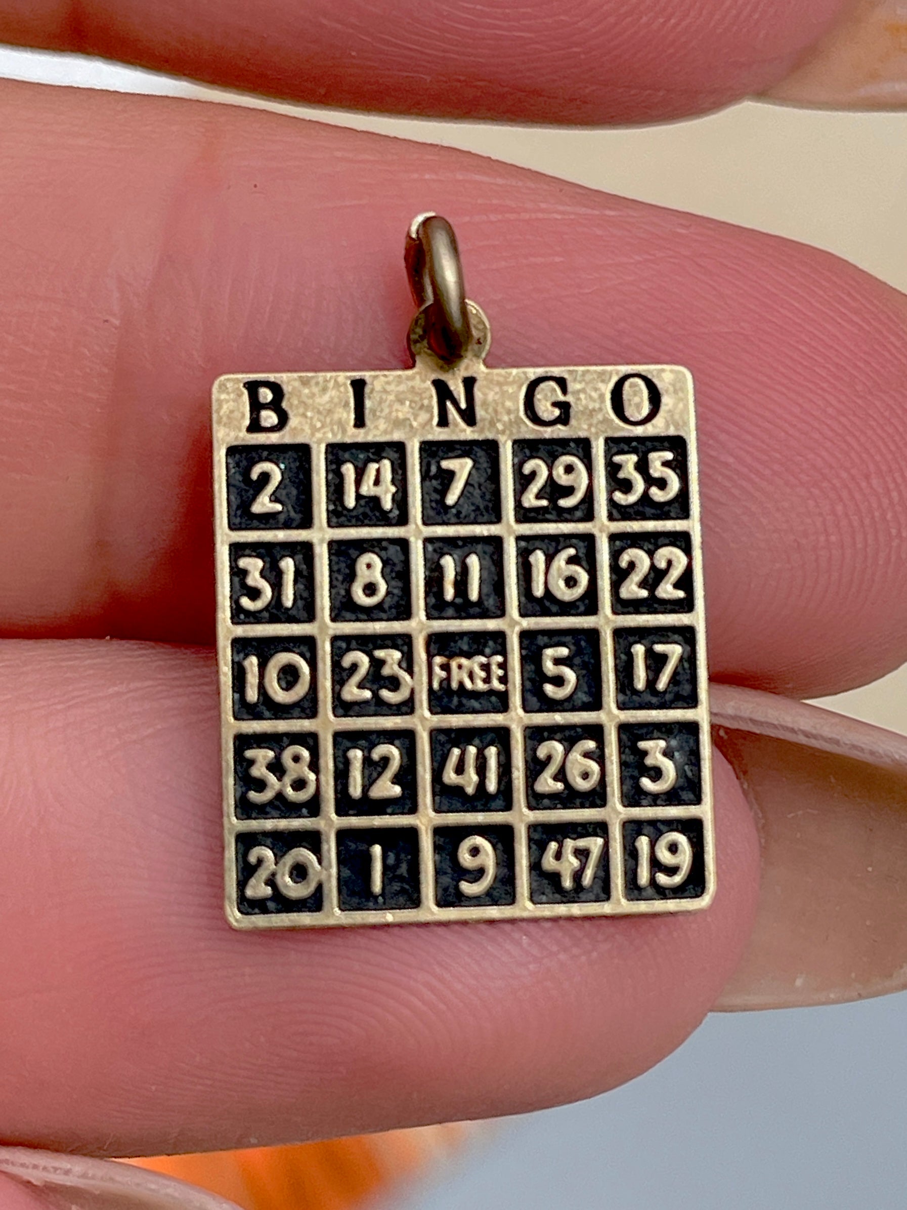 A charming Vintage yellow 14K enamel Bingo card charm. Measures 19 mm long with bail x 12.9 mm wide. Weighs < 1 gram. Hallmarked 14K. Note this currently has a small bale for attaching onto a charm bracelet -- if you would like a larger solid 14K gold bale added it is $35 additional (DM to email to request - it would be invoiced separately). Very good preowned condition.