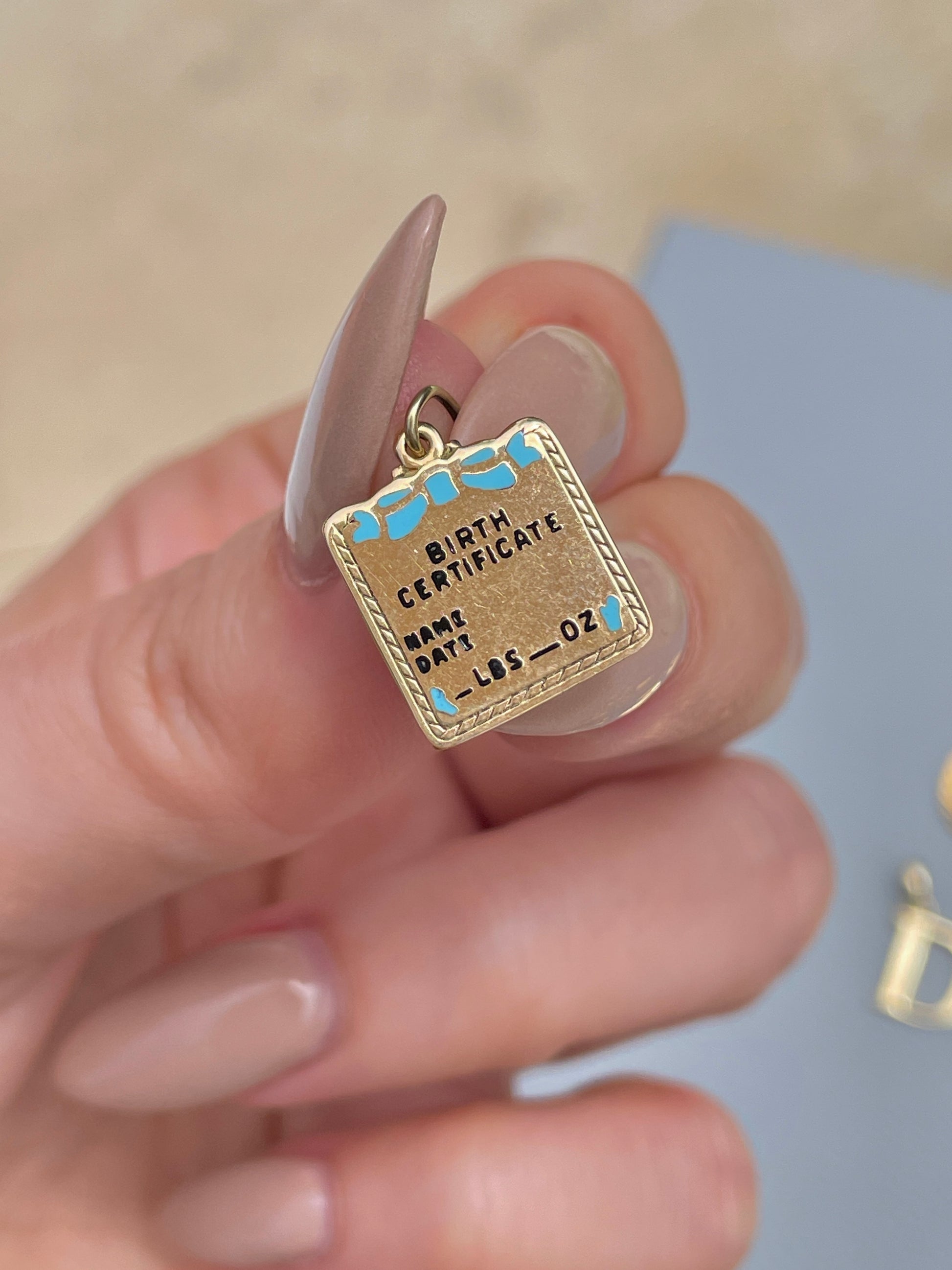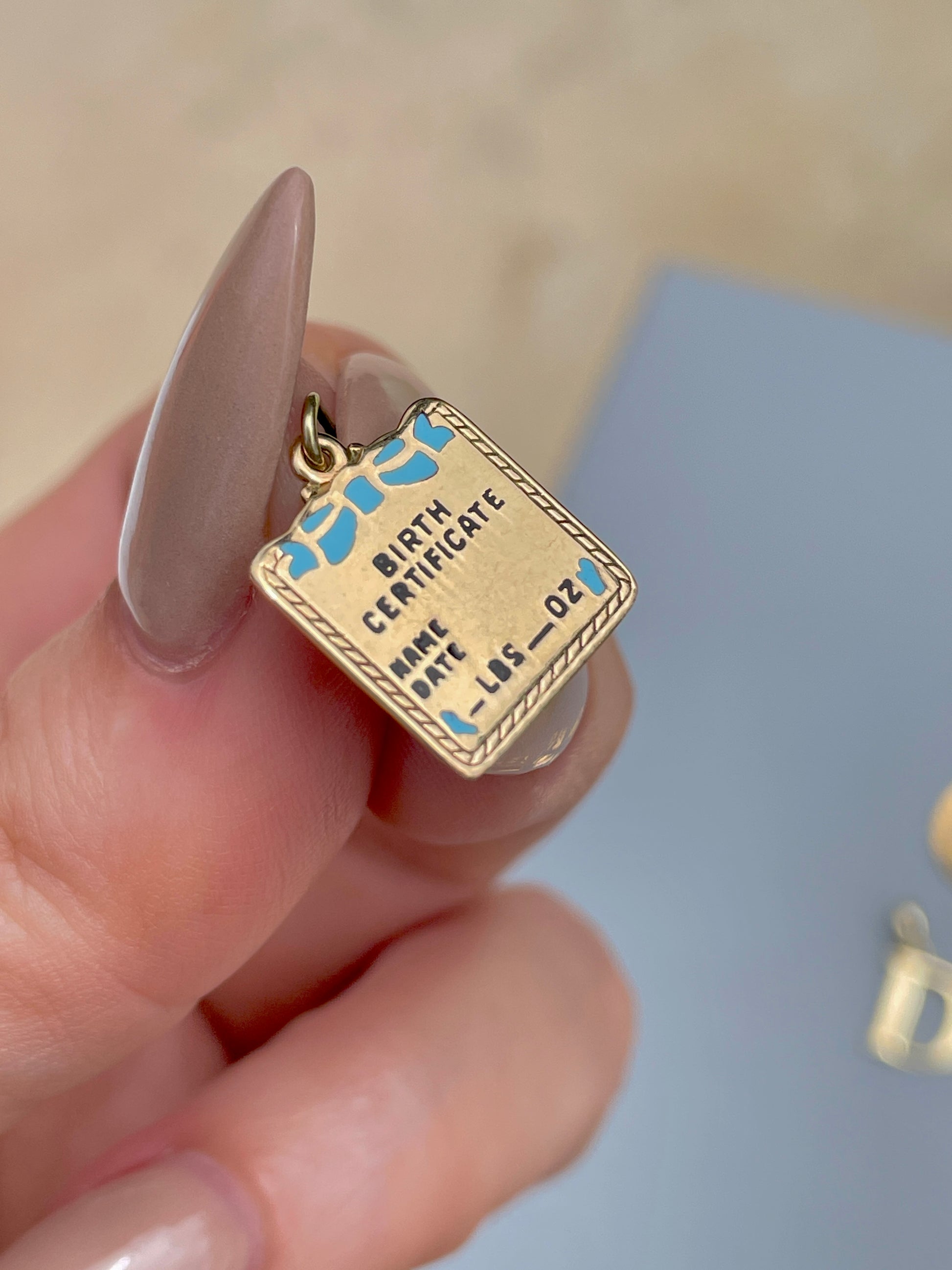A sweet unengraved Vintage yellow 14K gold enamel Birth Certificate pendant with blue and black enamel that's ready for personalization. Measures 19.7 mm long with bail x 12.9 mm wide. Weighs 1.1 gram. Hallmarked 14K and AC for maker. Very good preowned condition with minimal enamel wear.