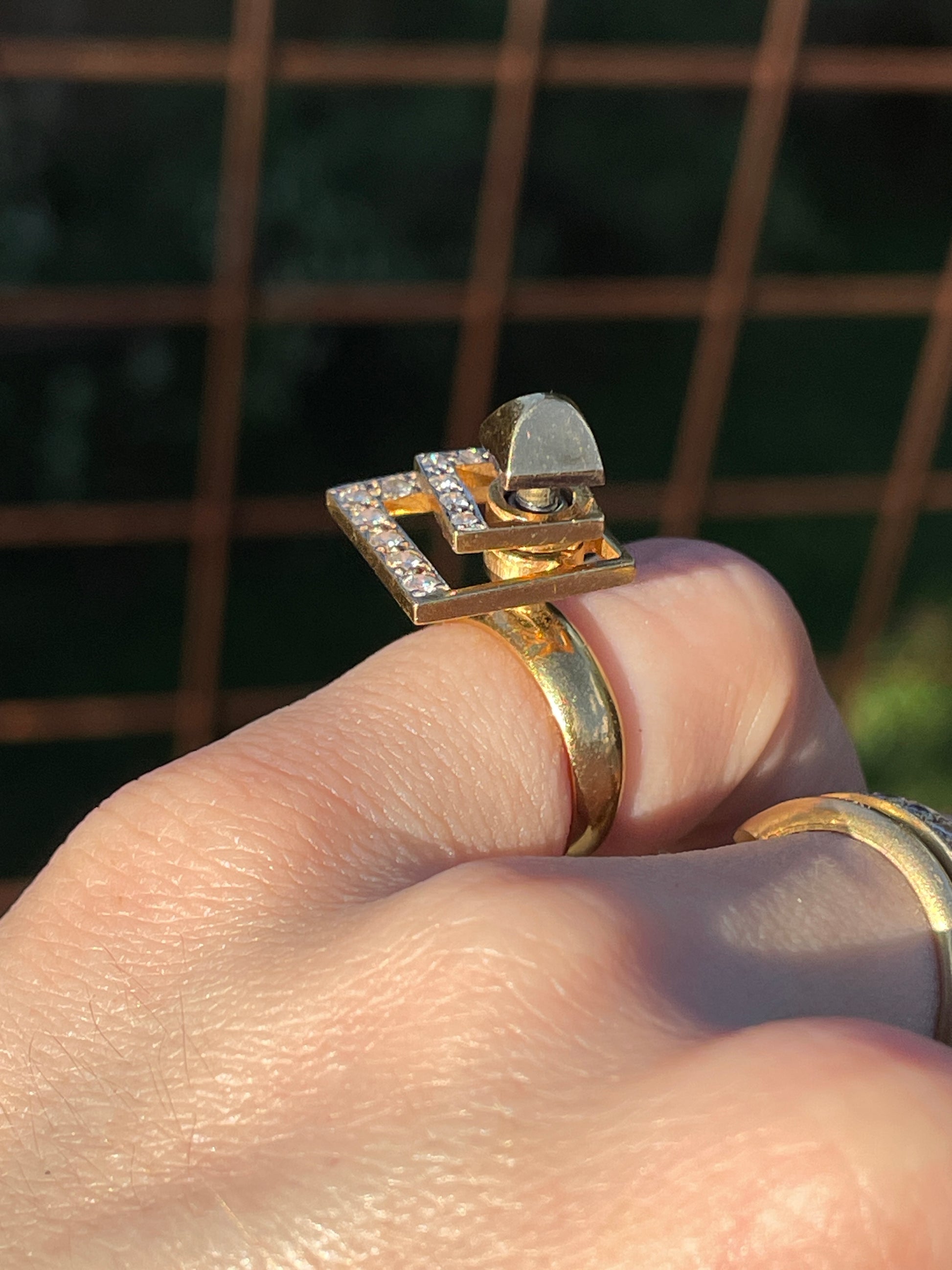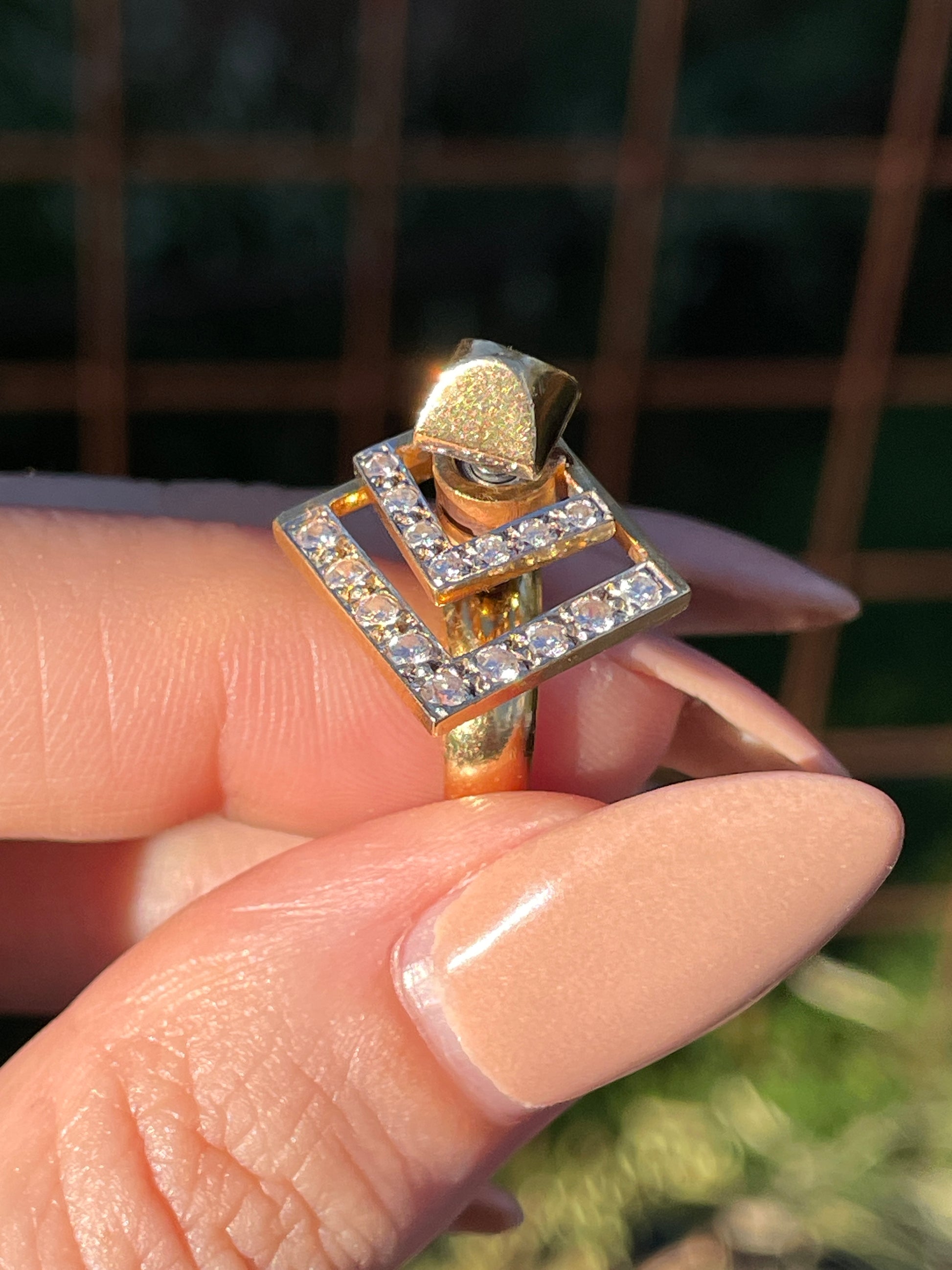 A fun Vintage yellow 14K (with other metal components) geometric approx .37 ctw diamond spinner ring, size 3.25. Sizable. Weighs 7.1 grams. Spinner components measure 13.3 mm widest down to 8.7 mm. Height of 13.7 mm off the finger. Hallmarked but not readable, the band and the spinner elements set with diamonds tests 14K gold. The top stud that holds the spinner components is gold plated, and there are other metal components in the interior that are not presumed gold.