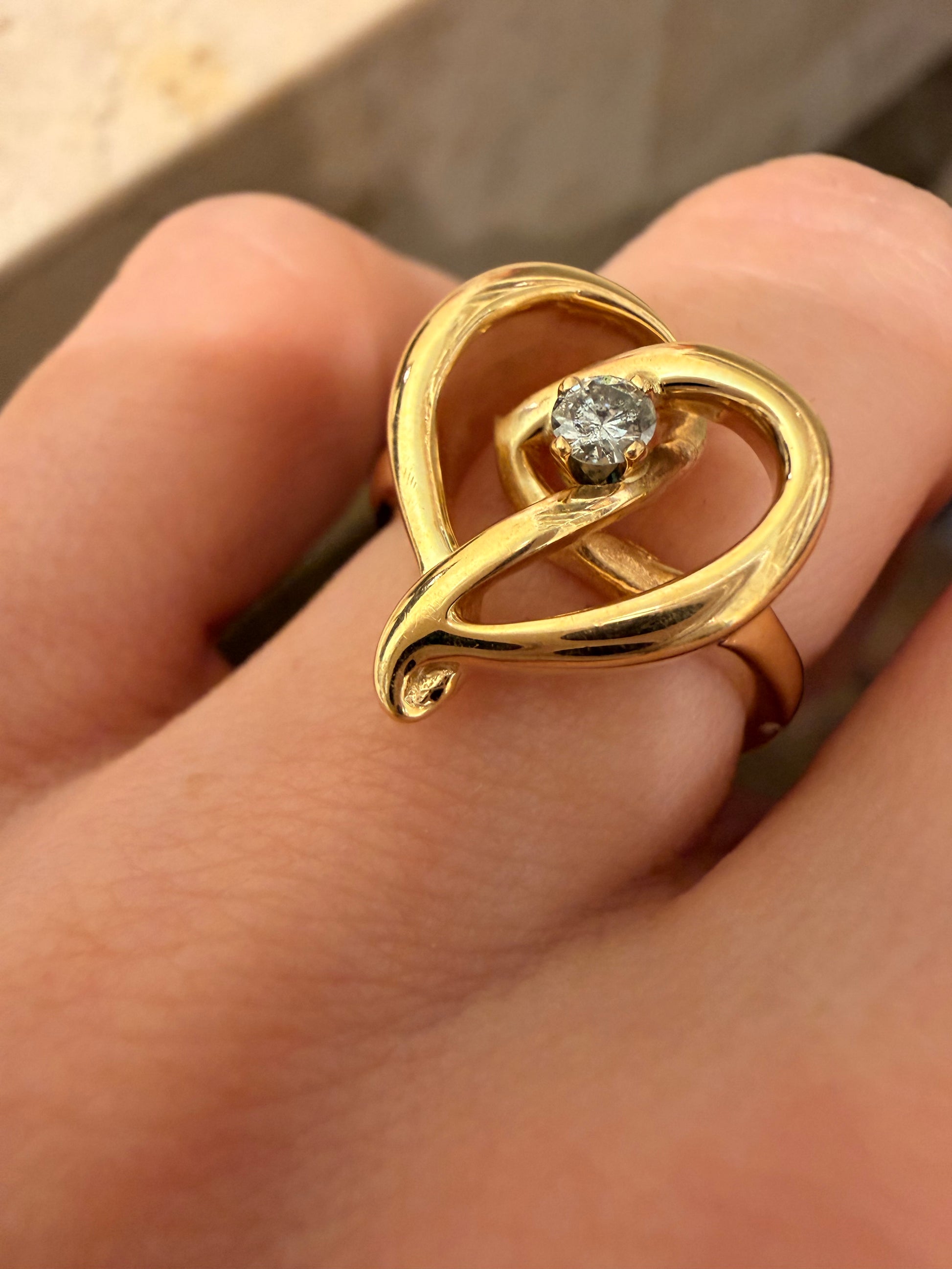 Love the dimension and movement of this Vintage yellow 14K gold .13ctw diamond heart ring, size 5.75 and sizable. Sweet sculptural open heart detail and very comfy, sitting flush to the finger. Measures 16.4mm widest. Diamond is a bit grey in color with a moodier sparkle and visible carbon specks (I clarity) but with nice inner fire. Hallmarked 14k. Weighs over 6.2 grams. In very good preowned condition.