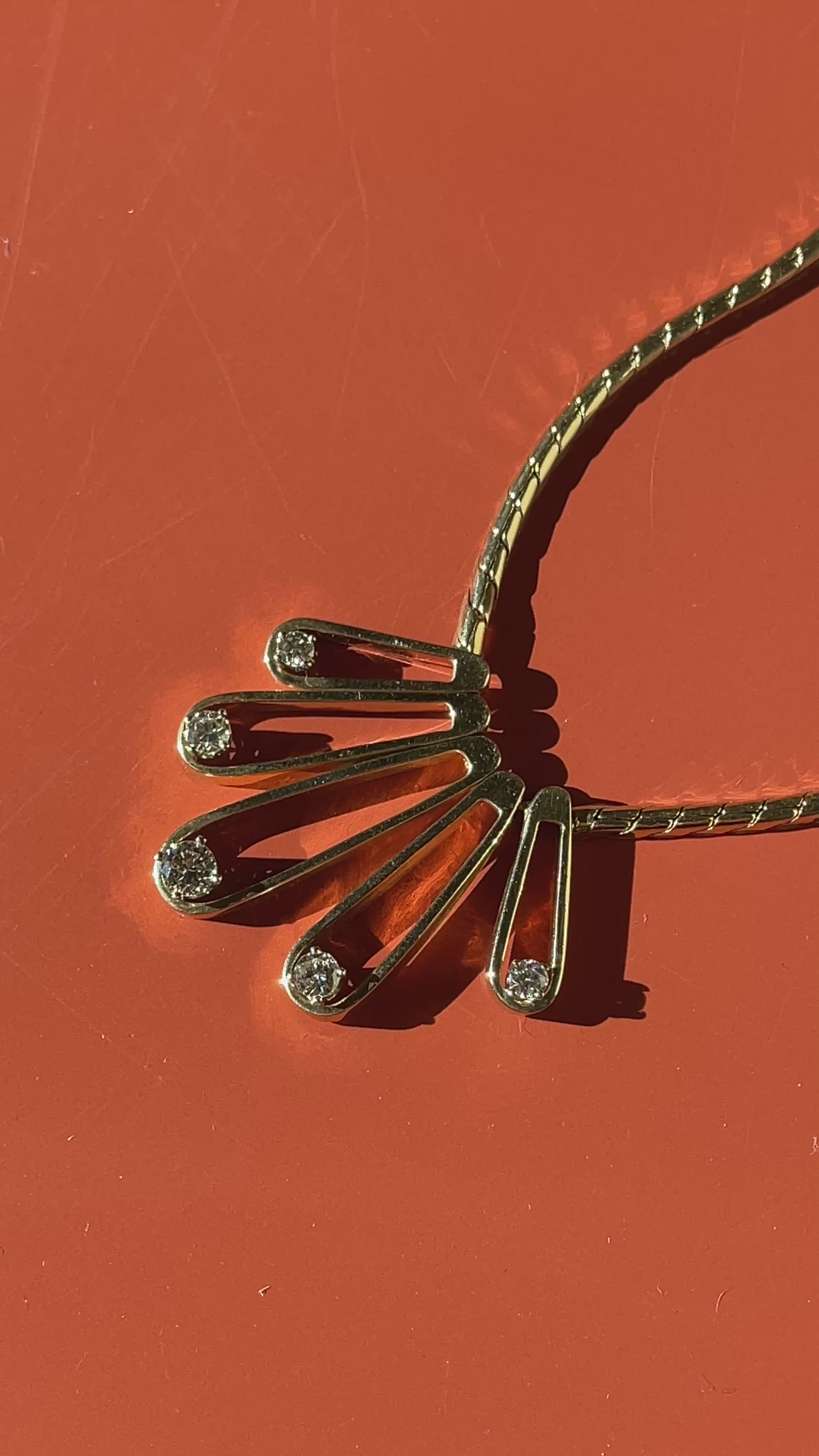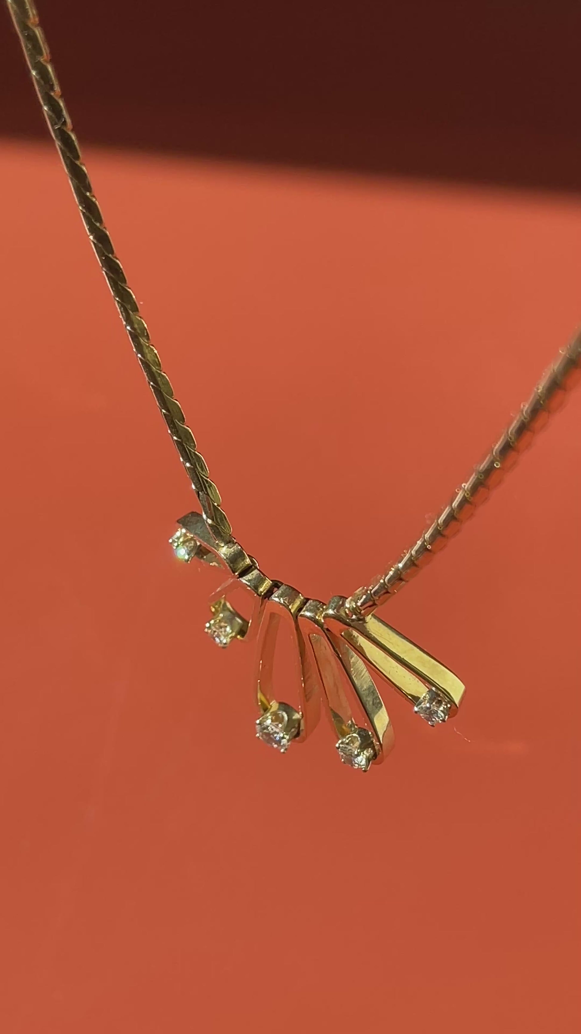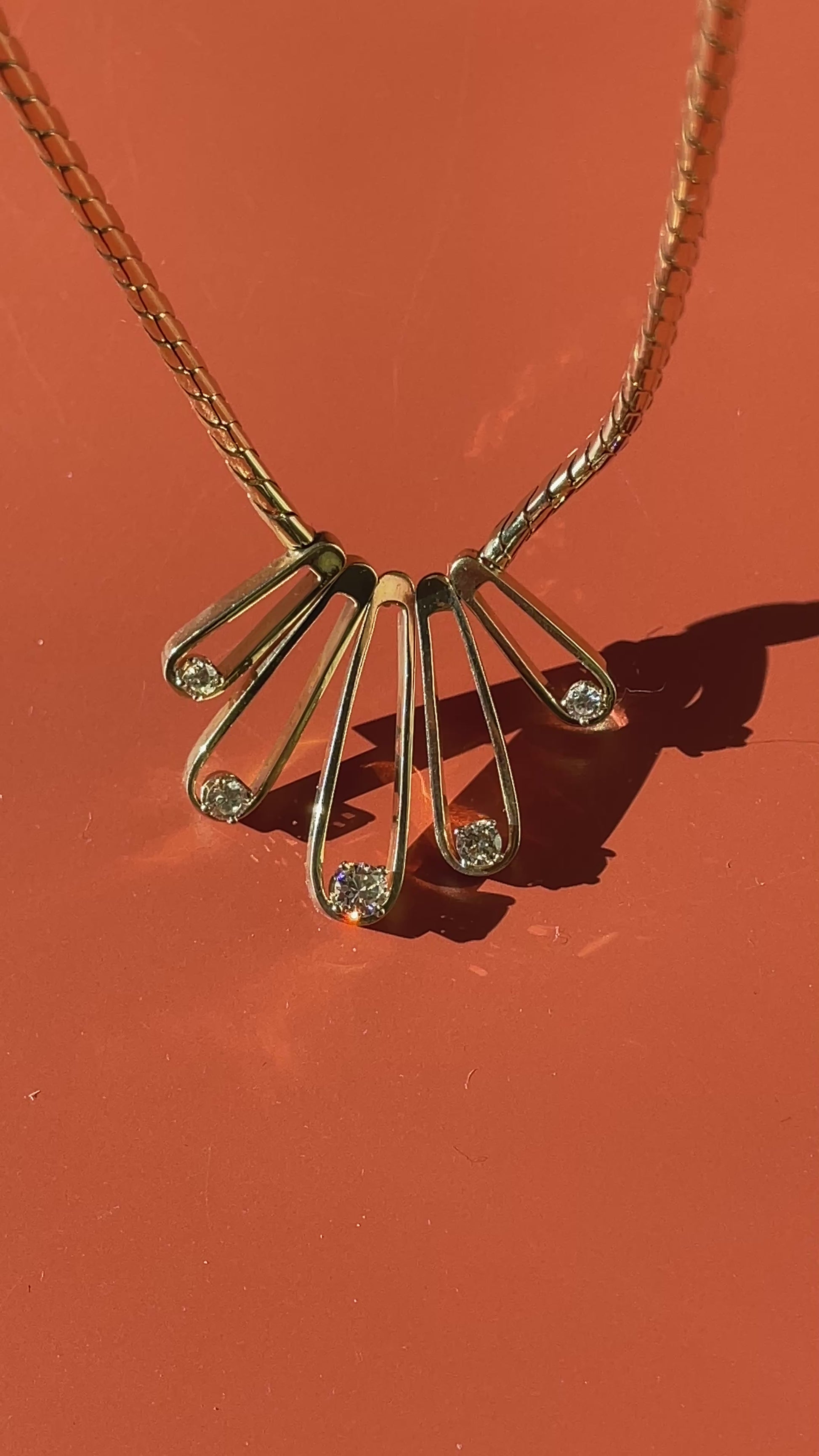 A striking and well made Vintage yellow 14K gold .7 ctw diamond articulated petal chain, 16.5 inch long. Petal center is articulated with each petal individually linked and able to move freely. A round cut diamond is prong set at the end of each petal link. Petal center is attached to a rounded fancy link chain that is flat on the back and lays beautifully. Gold is rich yellow in color.