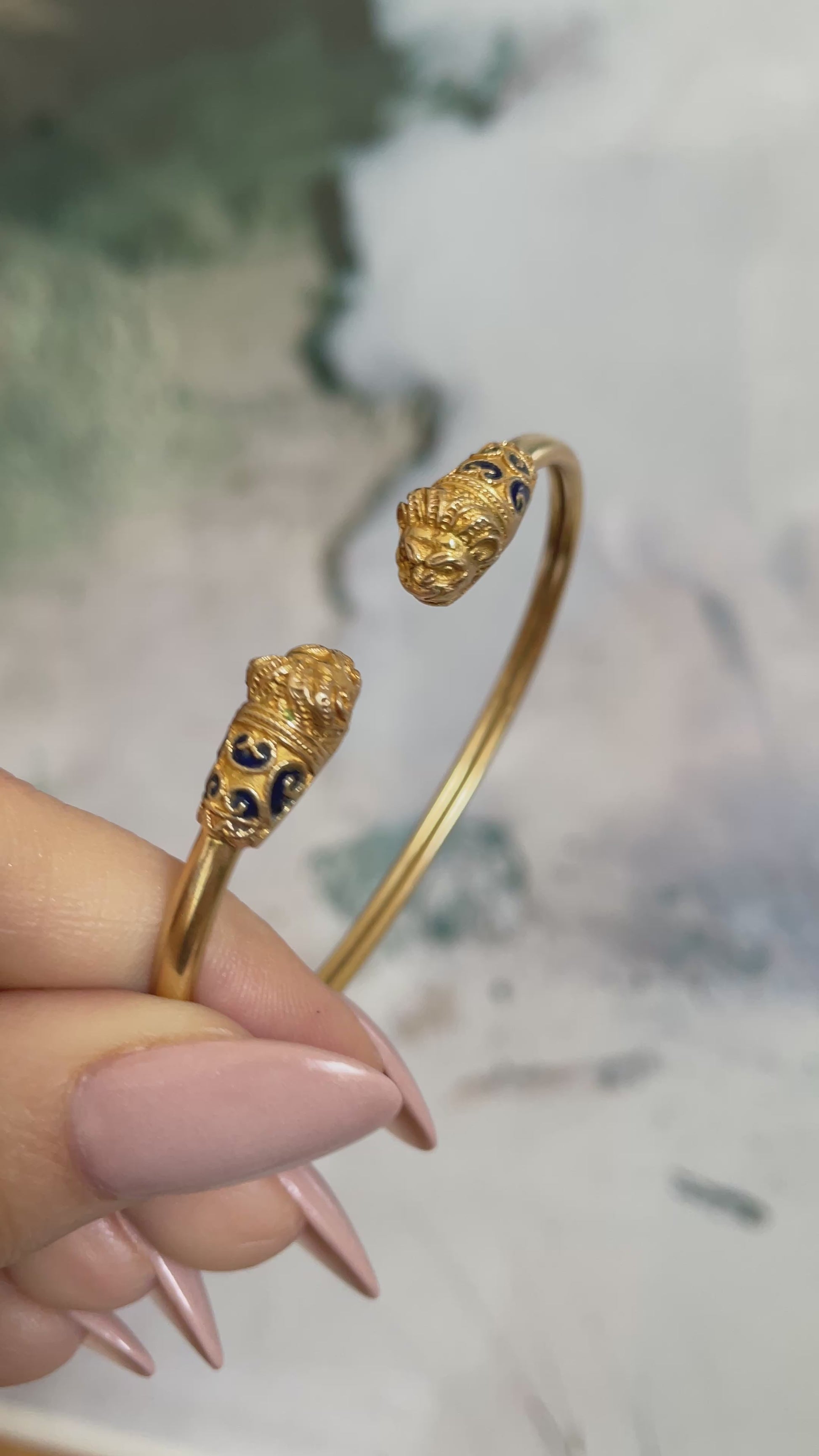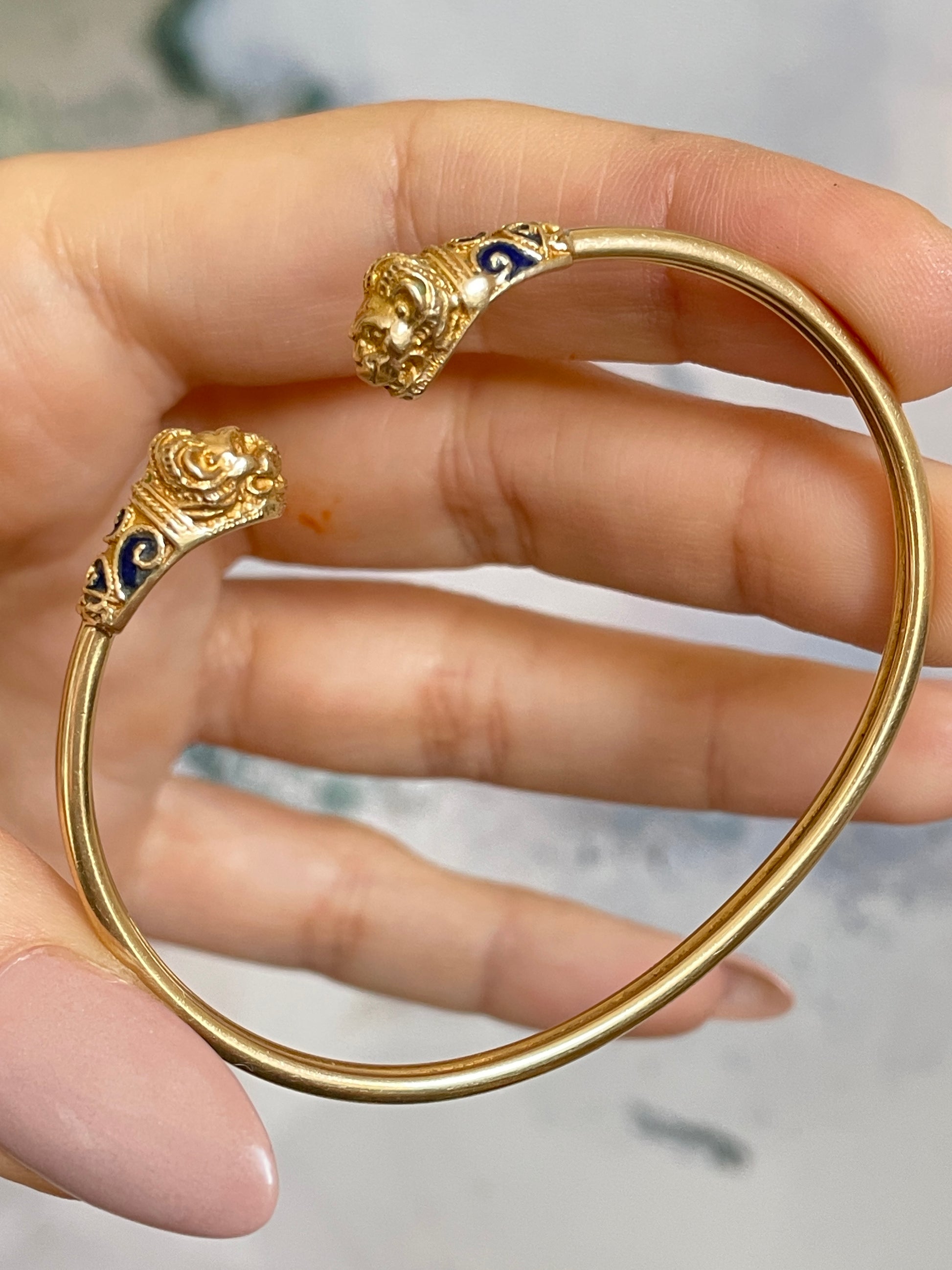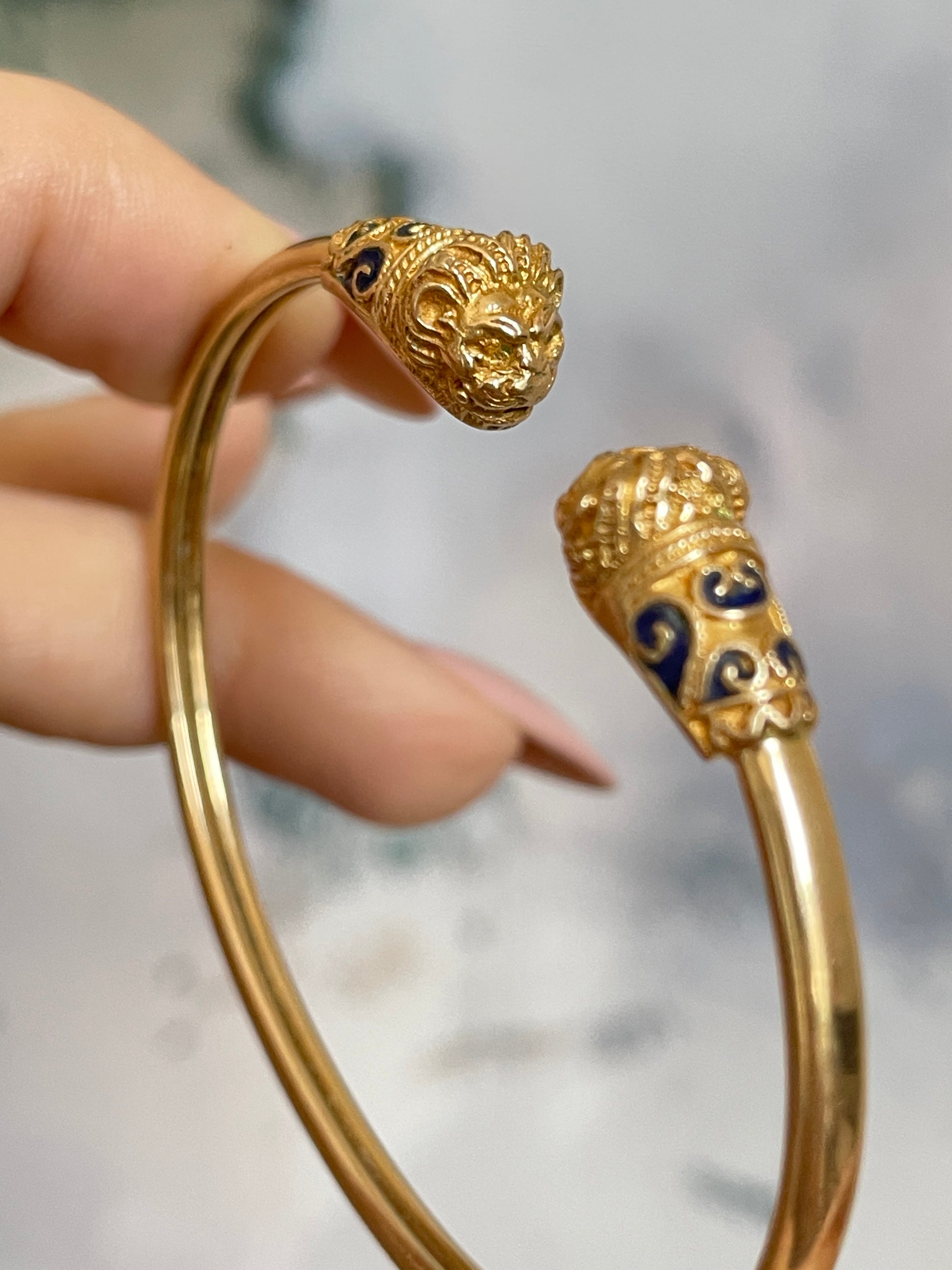 Vintage yellow 14K gold and blue enamel lion heads bangle