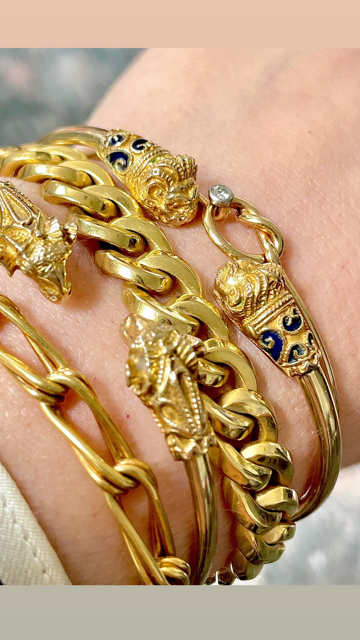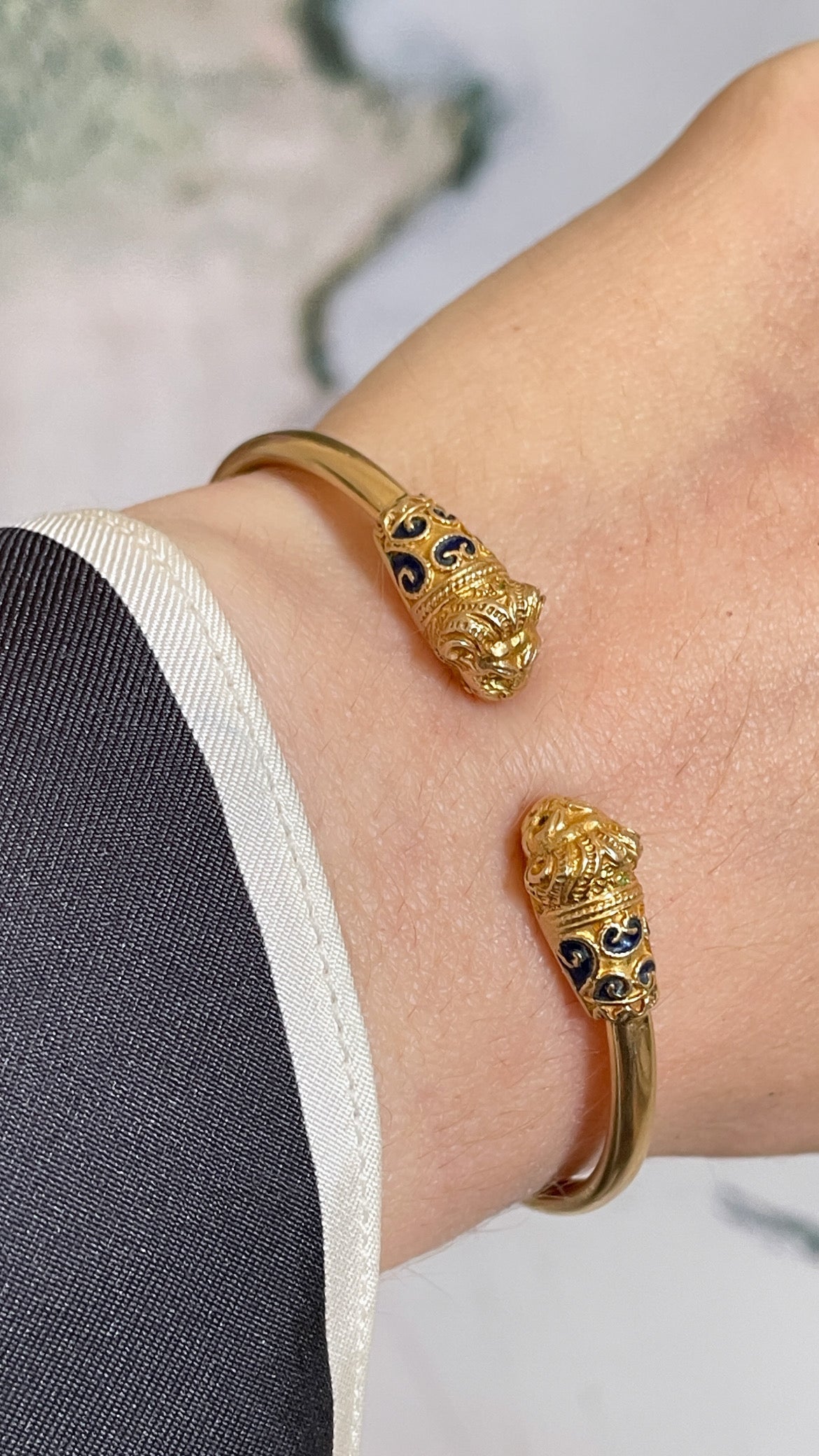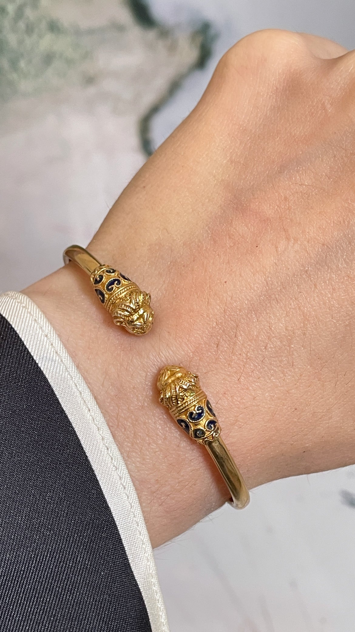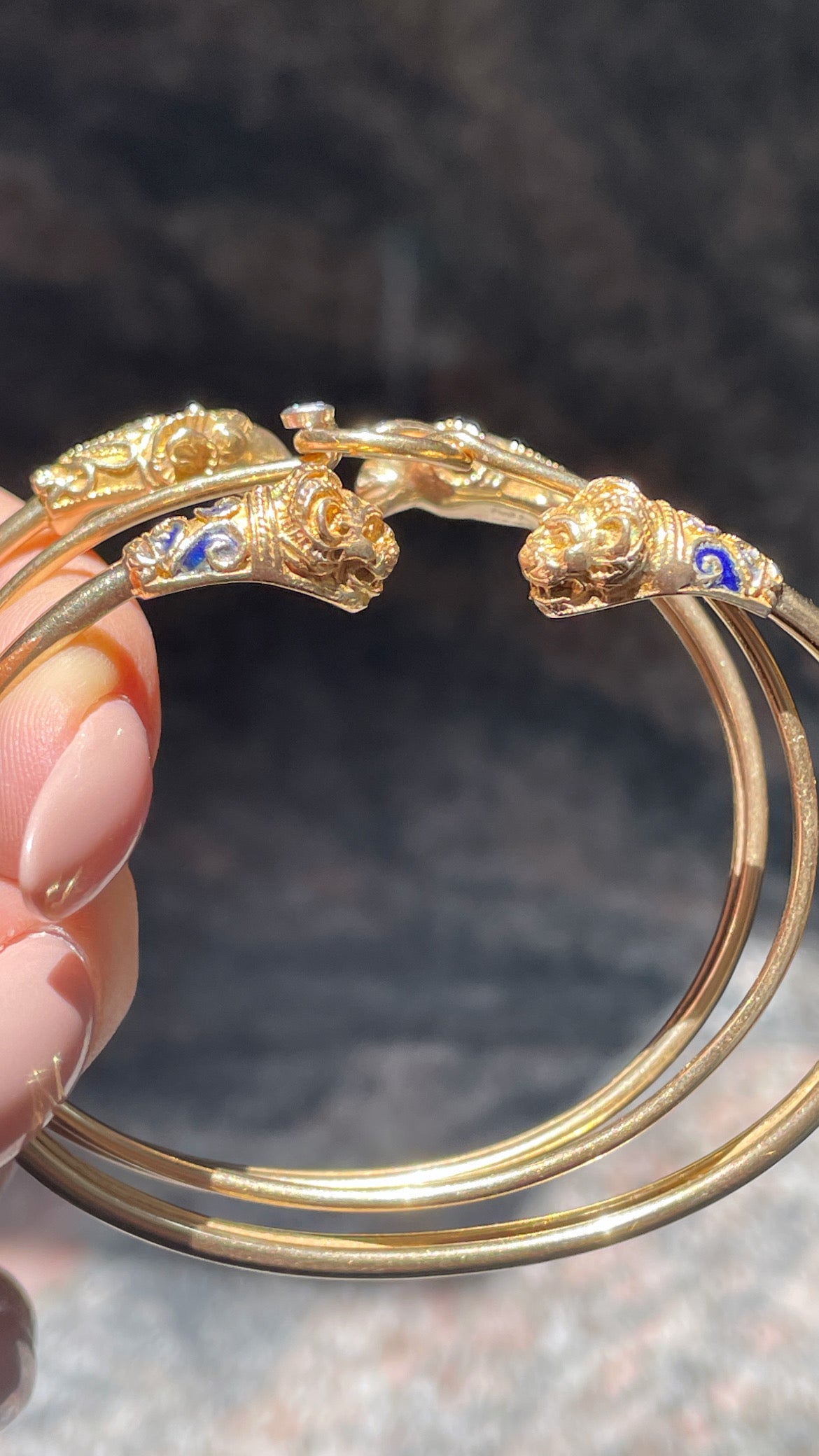 Vintage yellow 14K gold and blue enamel lion heads bangle
