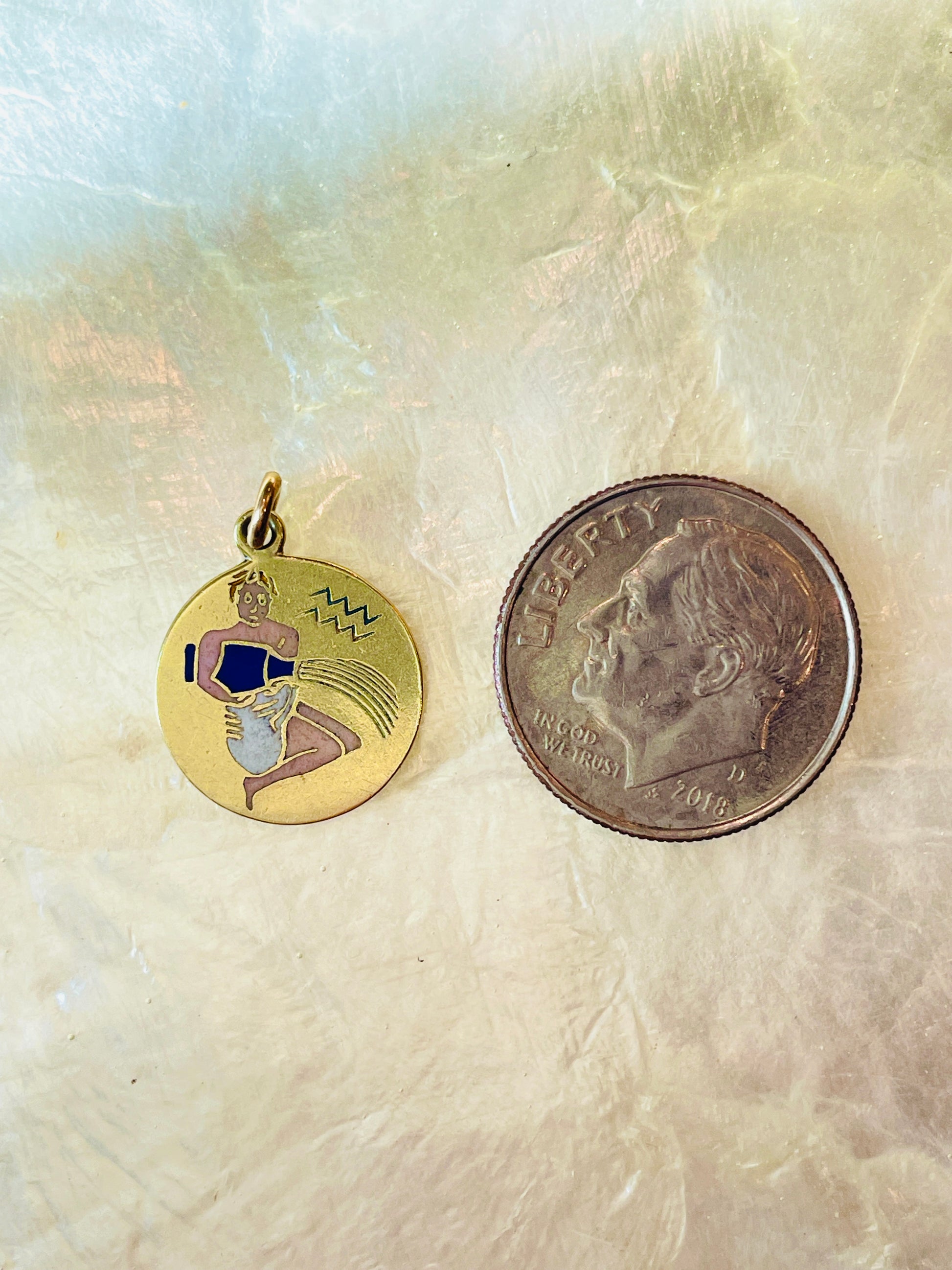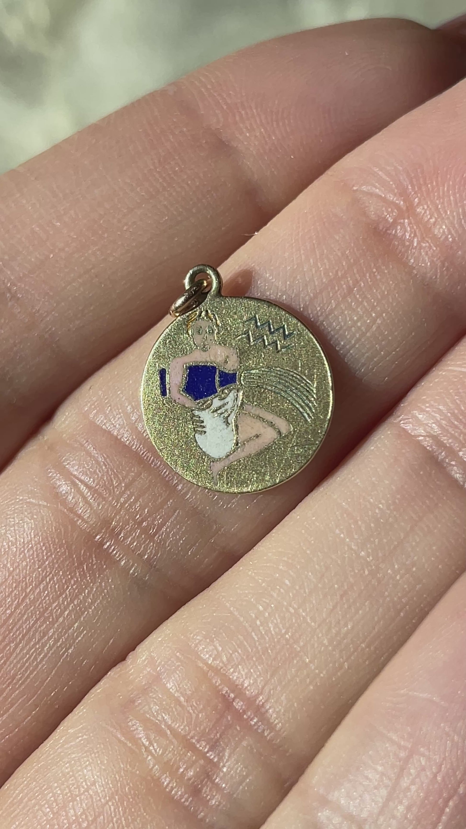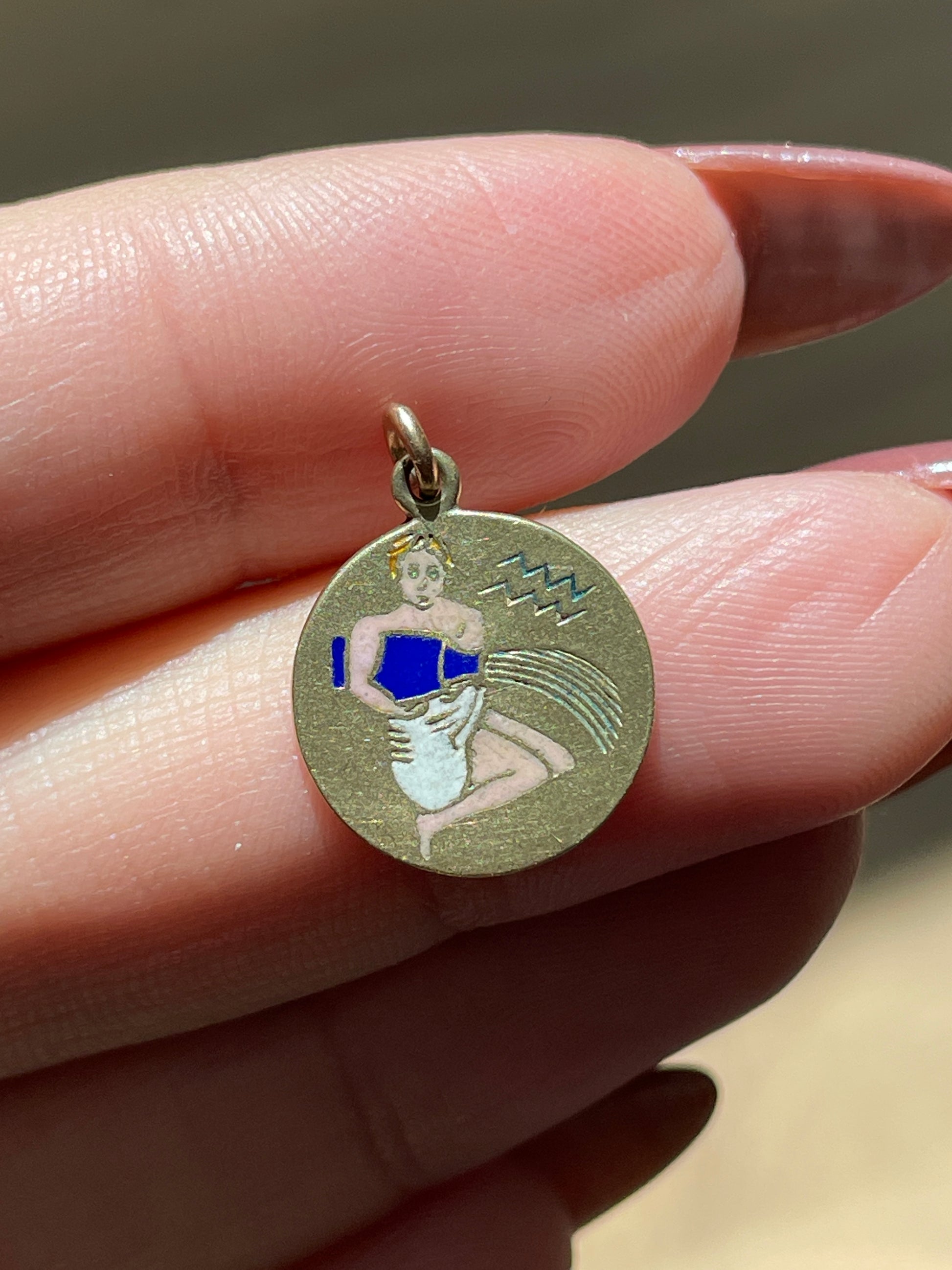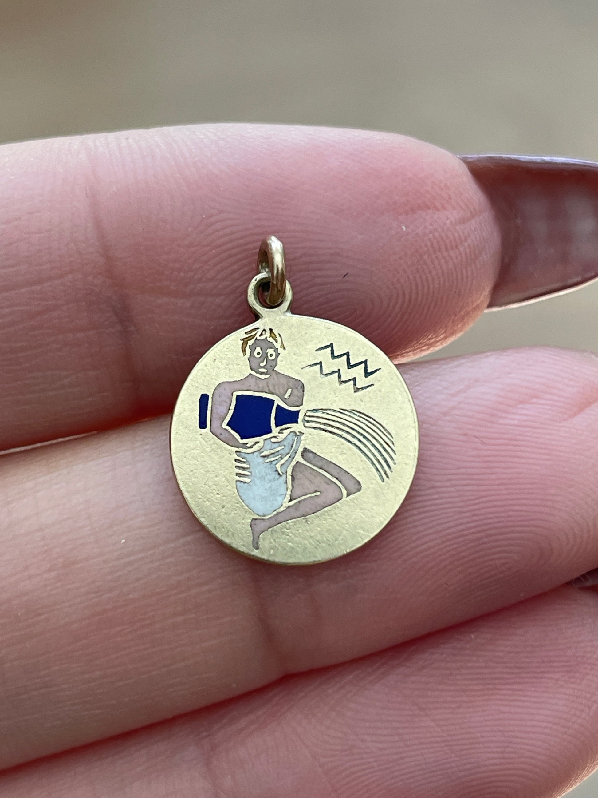 Vintage yellow 14K gold Aquarius white and blue enamel charm