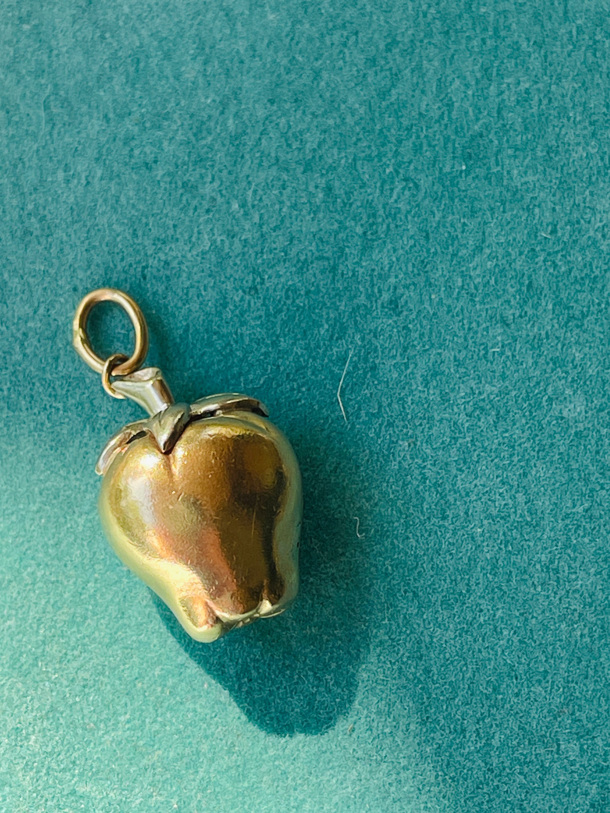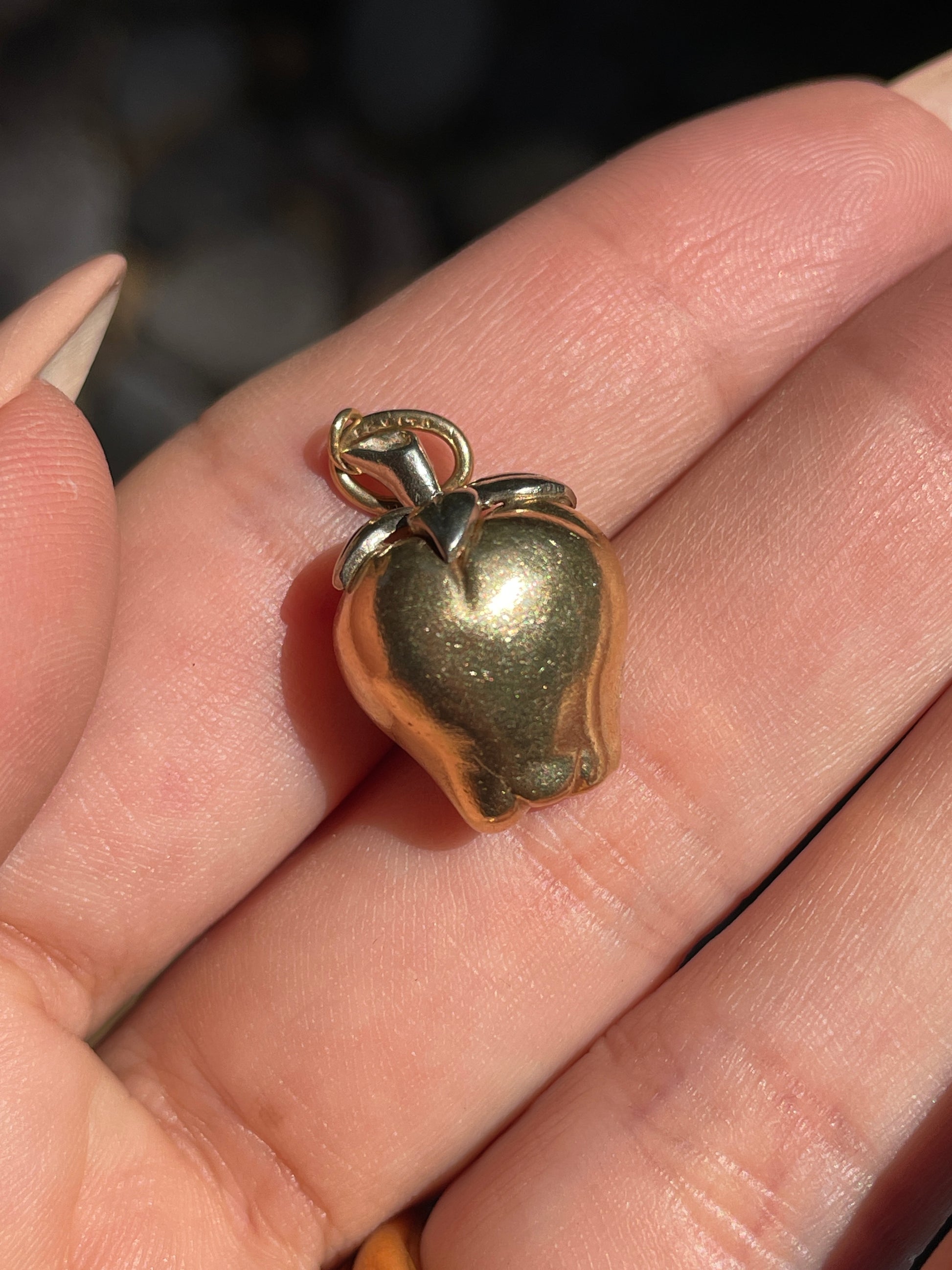 A super solid, heavy Vintage yellow 14K gold mystery fruit pendant, fully detailed on all sides. Not sure if this is an apple, a strawberry without seeds, or possibly a bell pepper? Regardless, it's an adorable food item! Fruit body is yellow gold and leaves are white 14K gold for added dimension. Measures 1.1 inch long with bail x .5 inch wide. Weighs 7.2 grams heavy. Very good preowned condition.