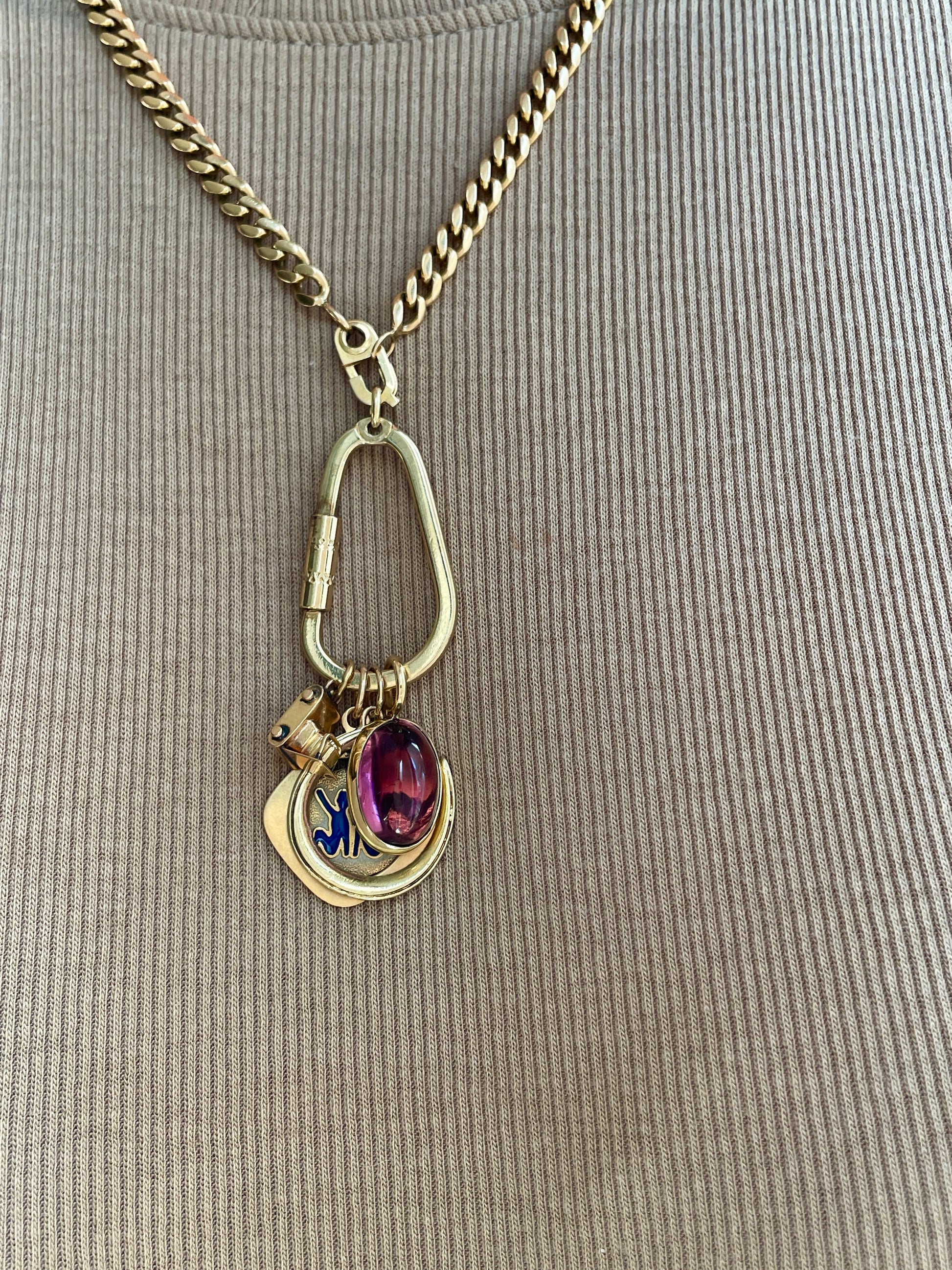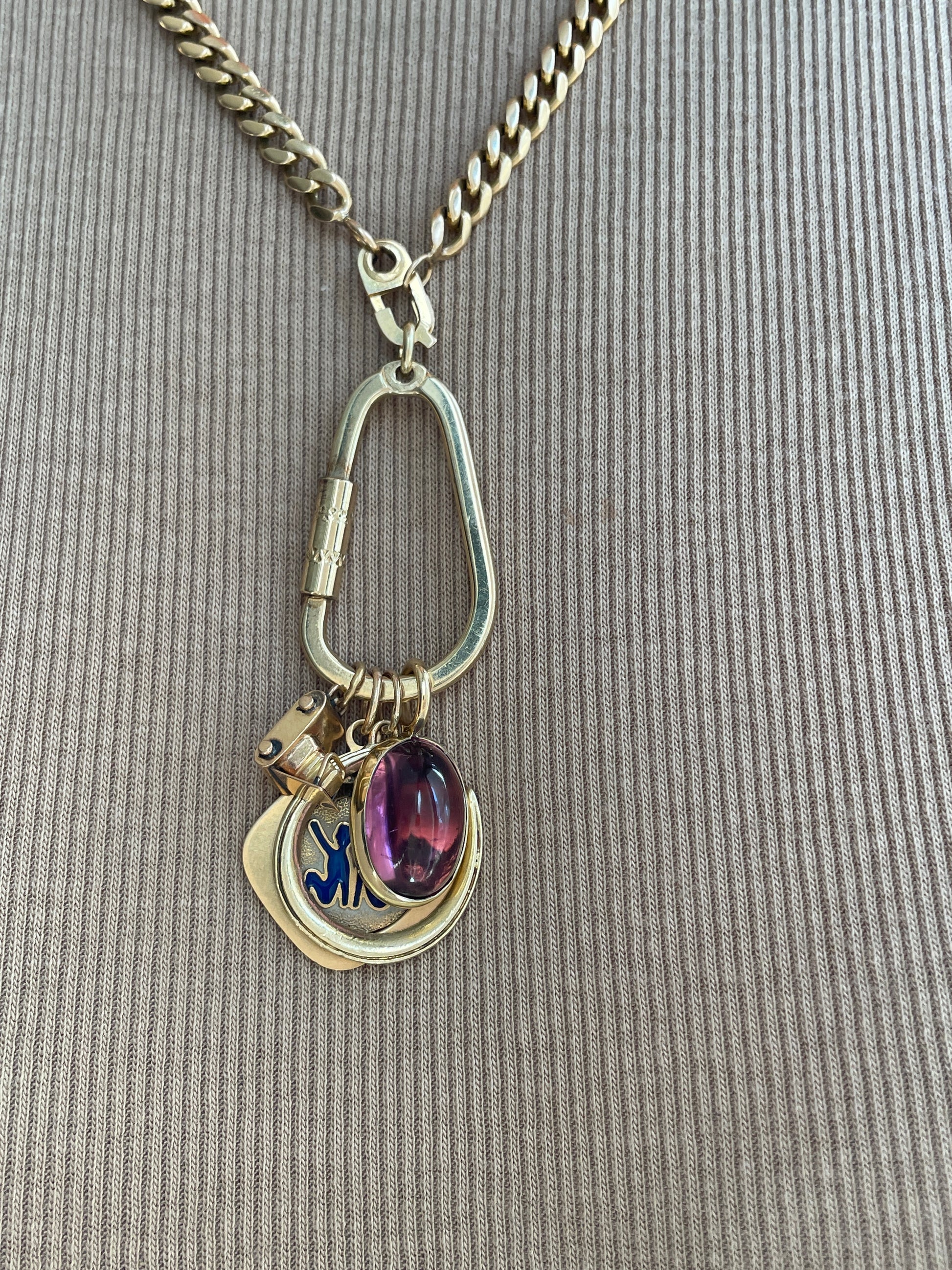 Vintage yellow 14K gold Germany hallmarked carabiner. Measures 1.5 inch long, including bale and .75 inch at the widest point. Such a great piece to have for hanging charms or extending a chain. Opens with a screw mechanism on the side which is etched with a subtle pattern. Weighs 5.5 grams. In very good preowned vintage condition. **Listing for 1 oblong carabiner only, other pieces are in separate listings