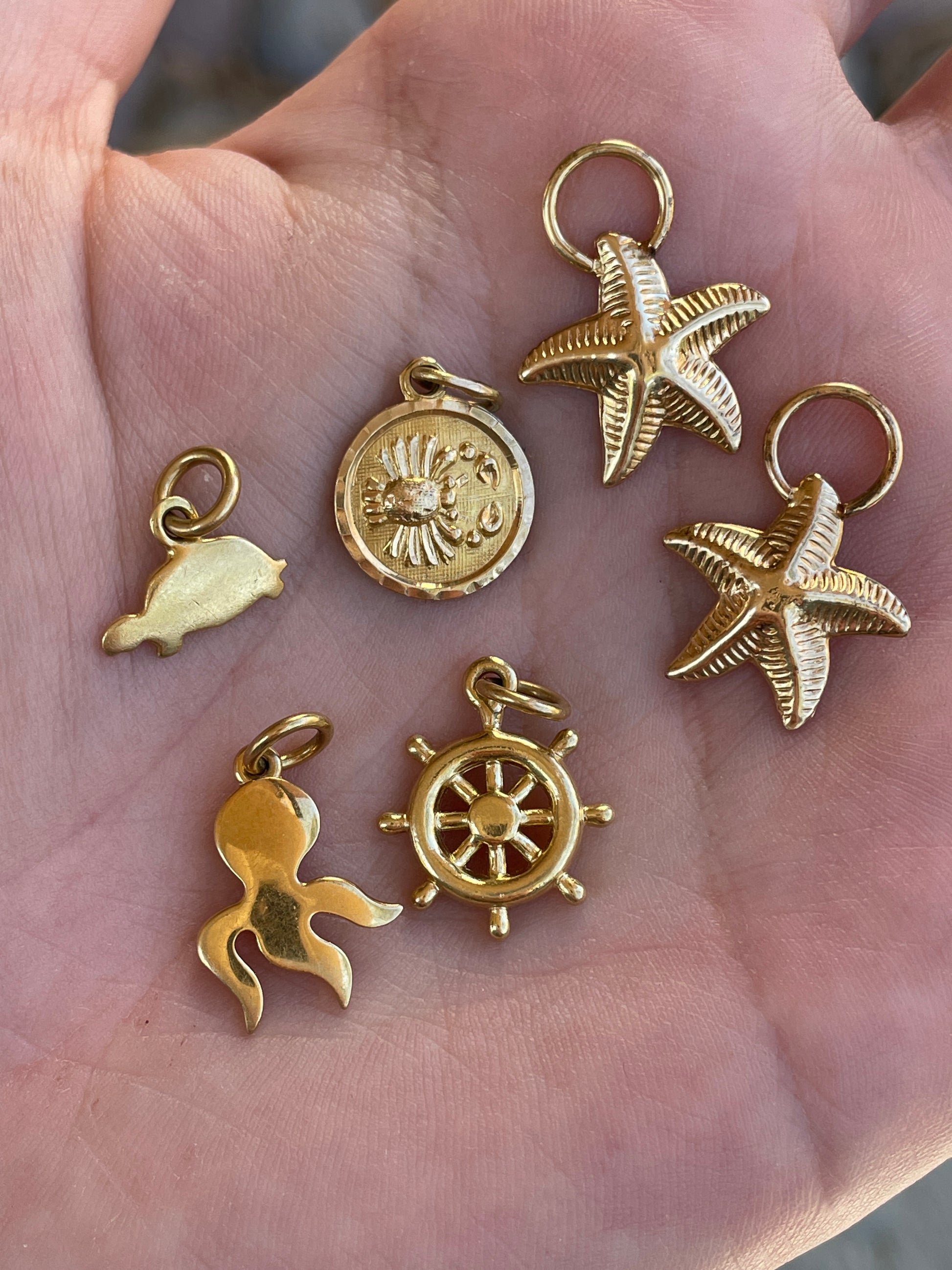 Adorable way to get multiple looks out of your favorite hoops! Vintage yellow 14K gold starfish earring charms set. Measures 21 mm long by 15.8 mm wide. Weigh 1.71 grams combined. In very good preowned condition.