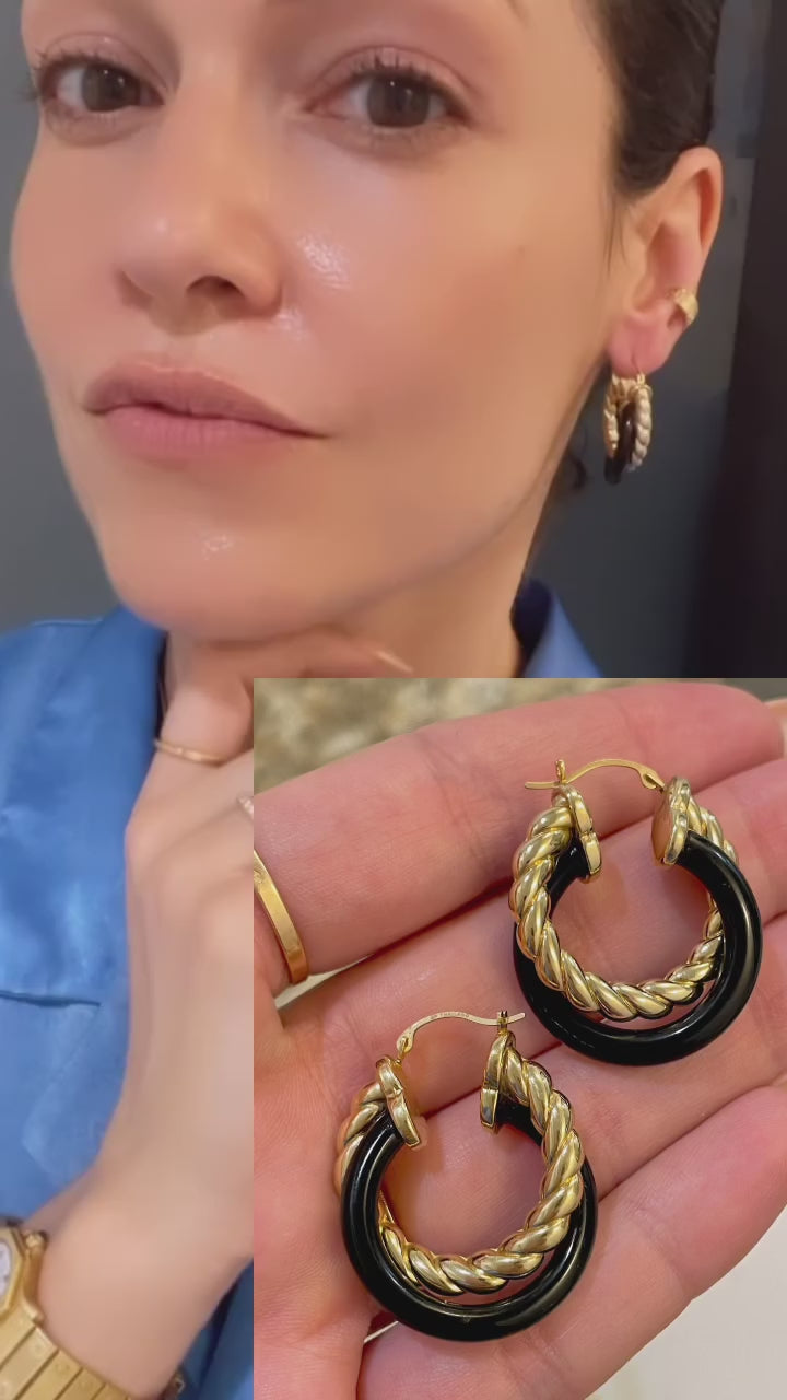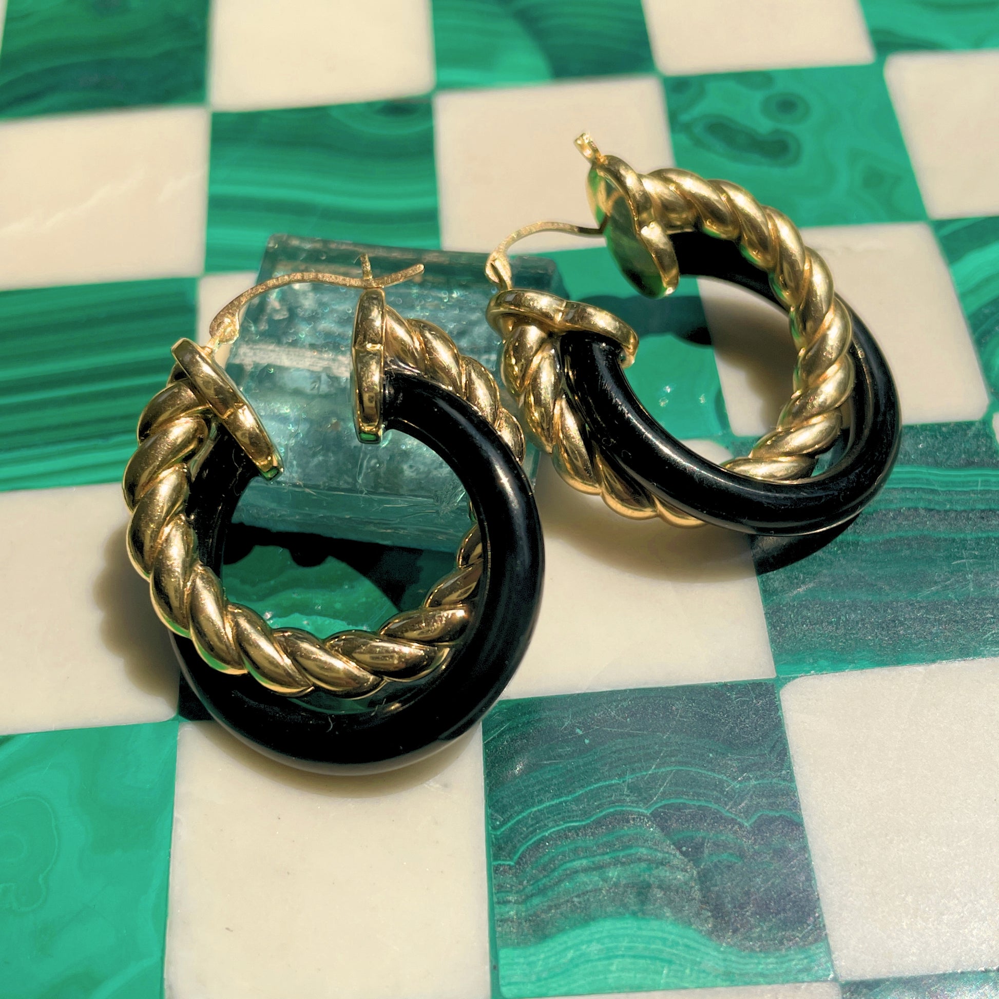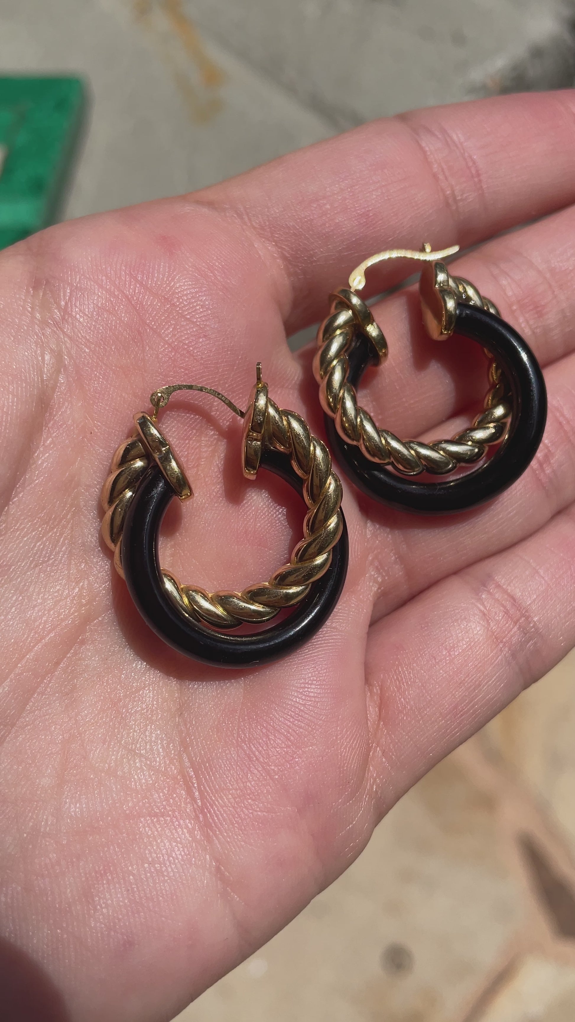 Vintage yellow 14K gold twist and onyx hoop earrings