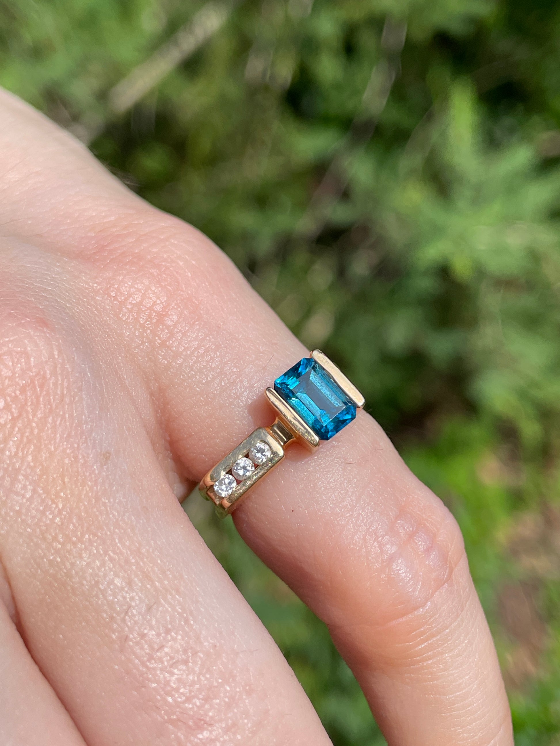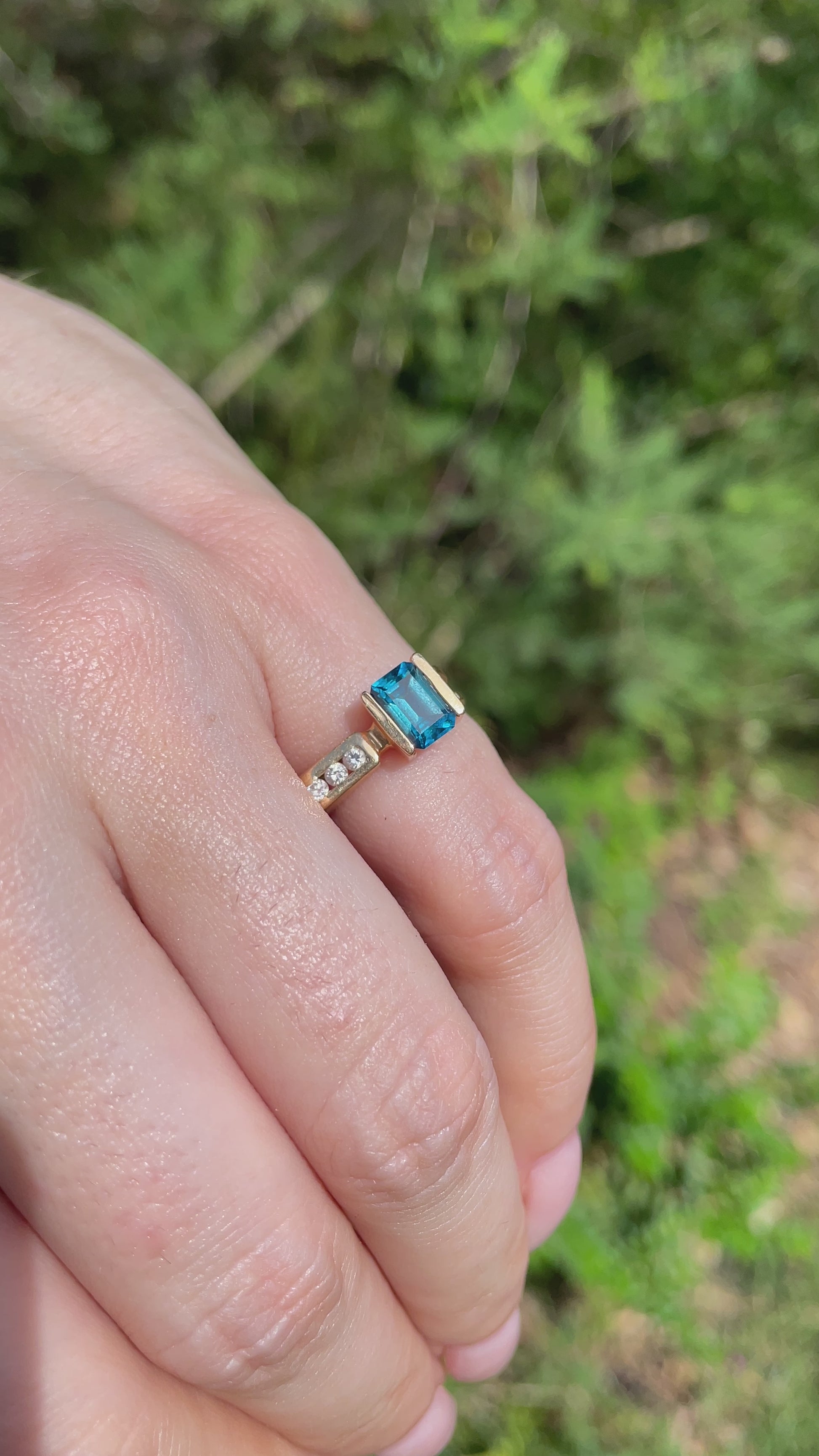 A pretty Vintage Yellow 14K Indicolite Tourmaline and .08 ctw diamond ring, Size 4 (sizable). Stones are channel set and parallel lines of gold run down the ring’s shoulders. Super cute as a pinky ring. Measures 7 mm widest. Weighs 4 grams. In very good preowned vintage condition.