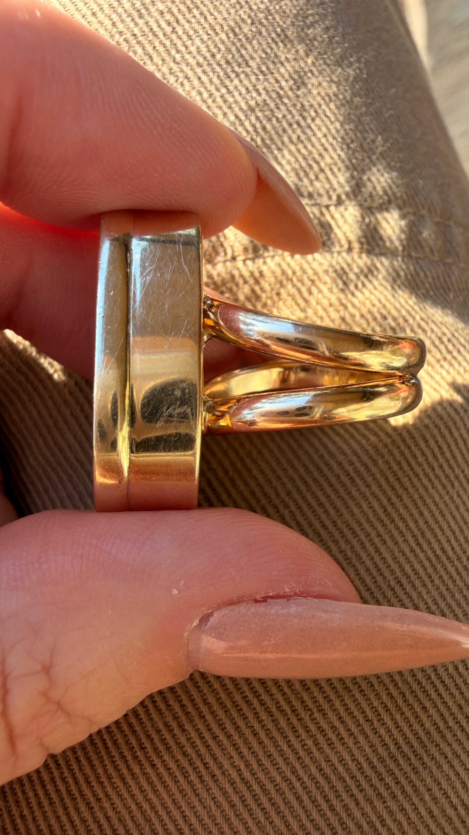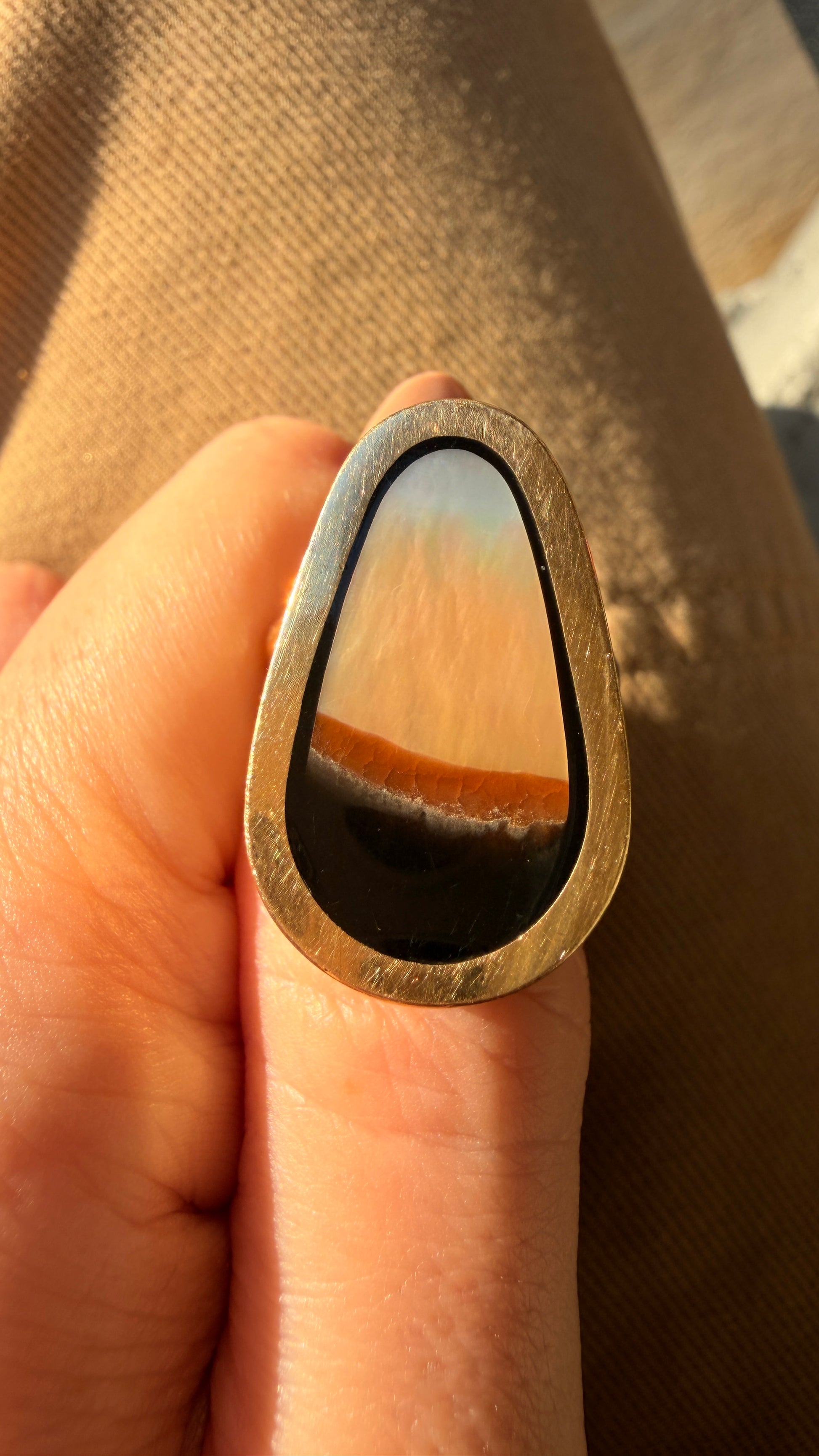 A bold Vintage yellow 14K inlaid shell and onyx statement ring artist signed ‘Many Moons’ on reverse, size 6.5. The teardrop shape and blocky elevation from the hand is such a cool statement and the split shank is a great design choice to anchor the front of the ring centered on the finger! It’s so good. Face measures 26 x 16 mm widest and tapers. Sizable (see link to sizing listing if needed). Super comfy! Weighs 15.5 grams and feels great on.