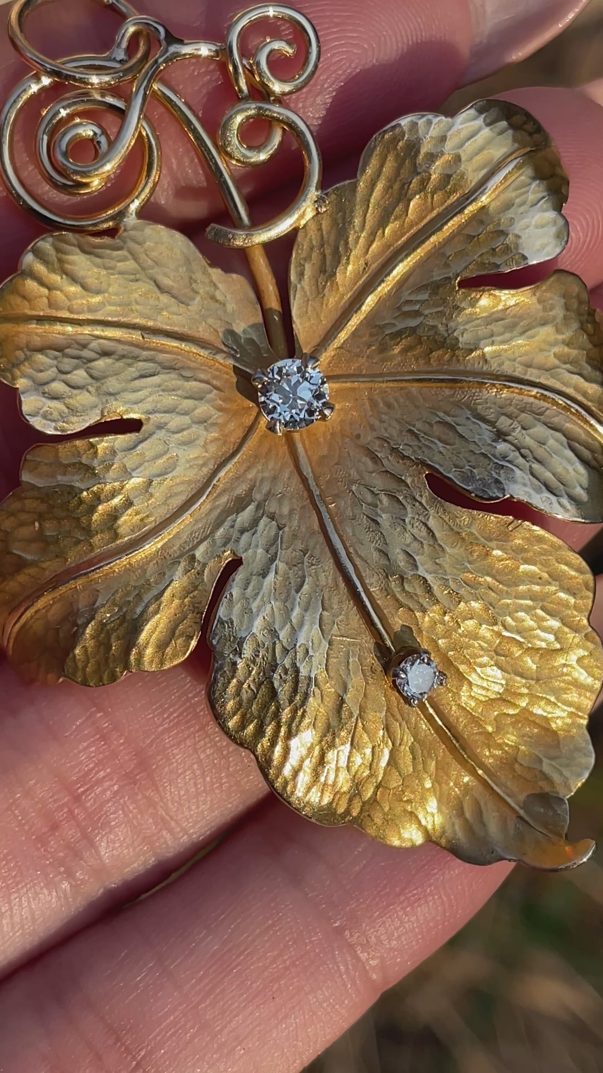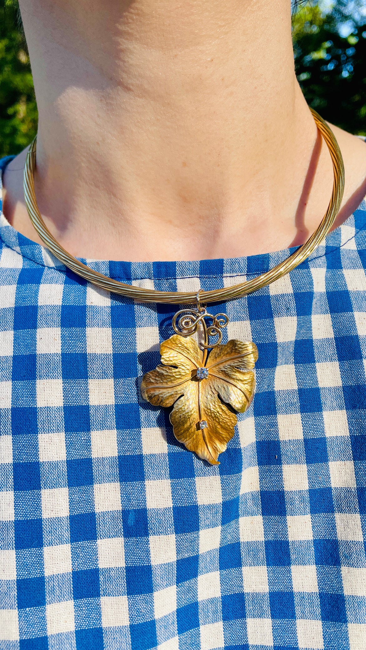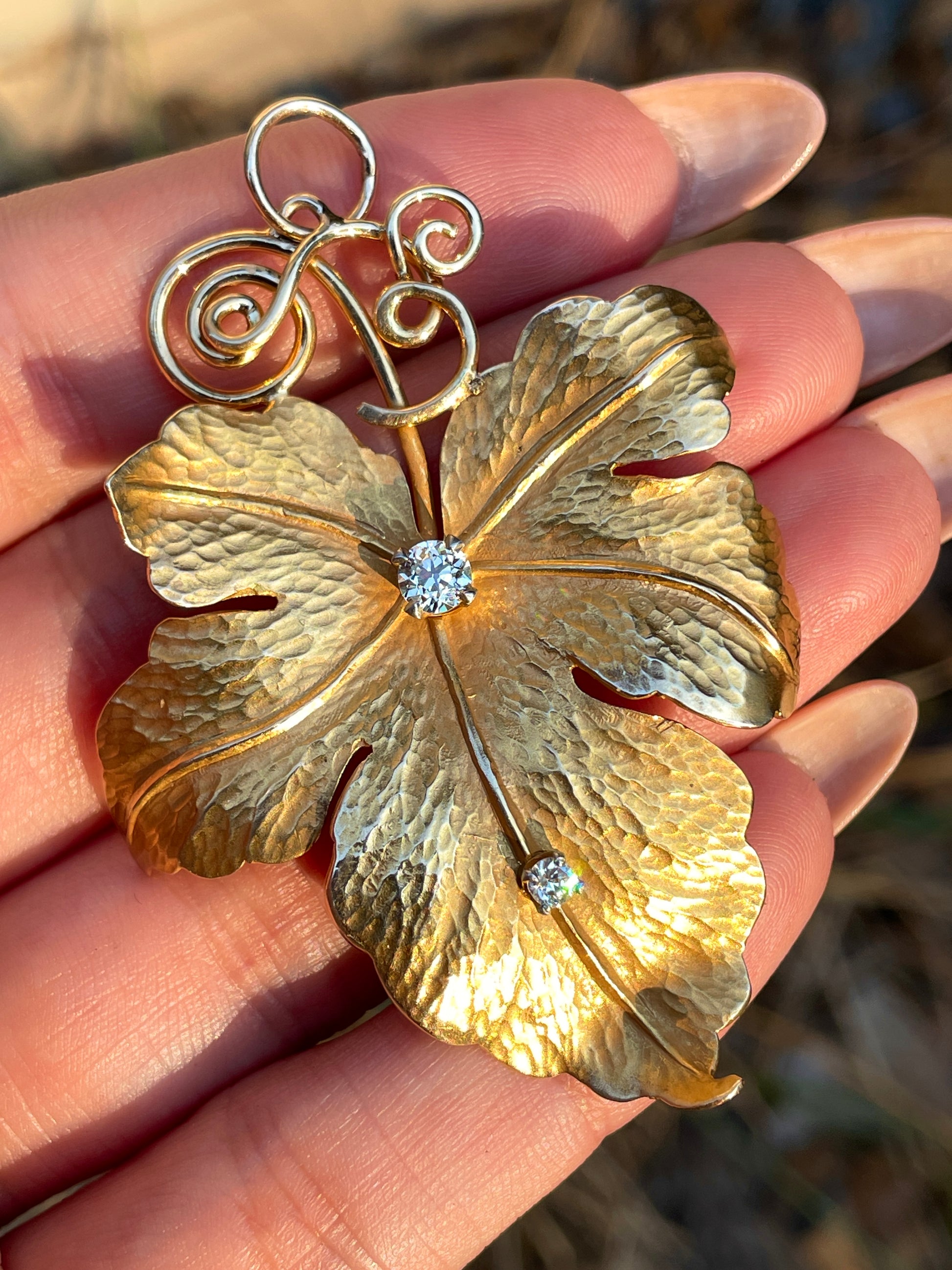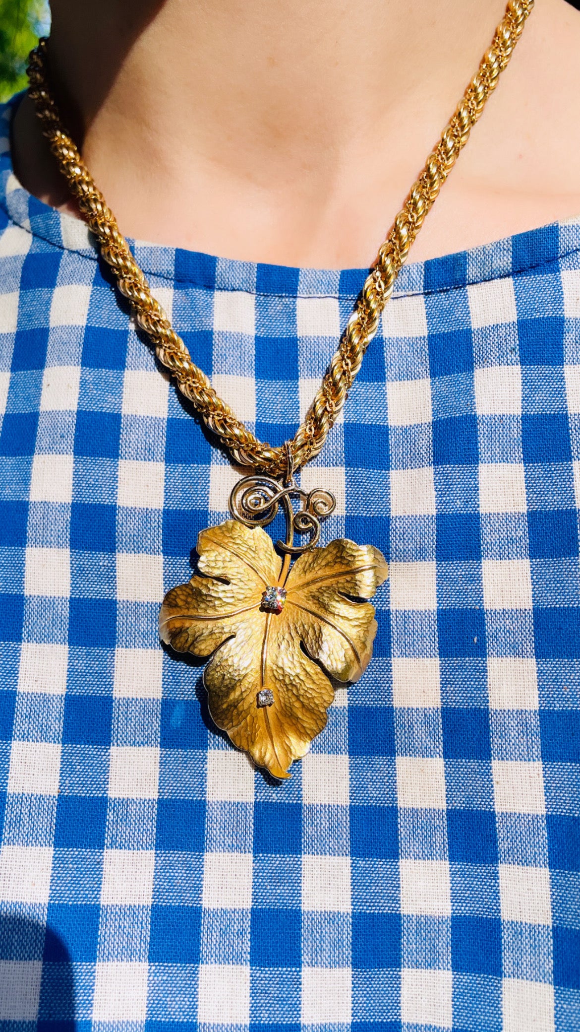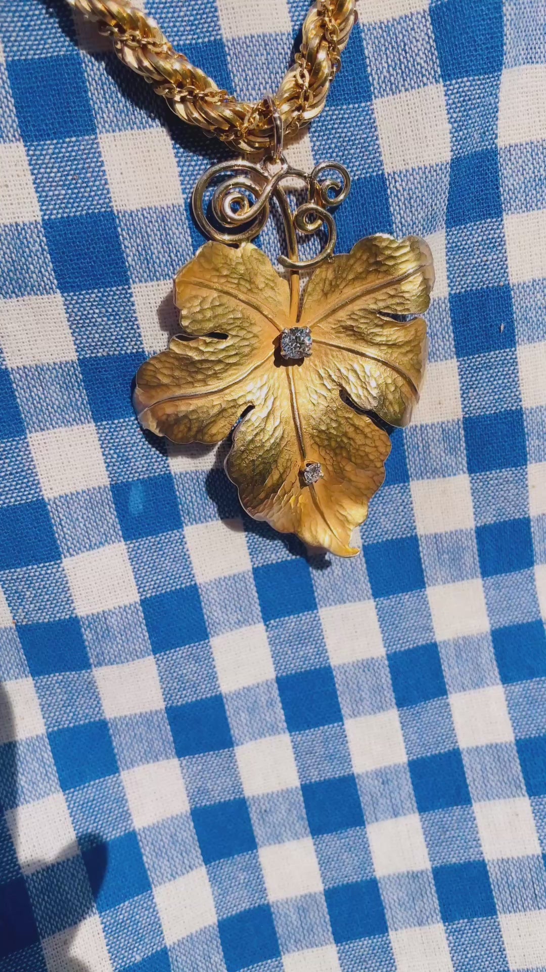 Vintage yellow 14K leaf statement pendant with .48 ctw old mine cut diamonds