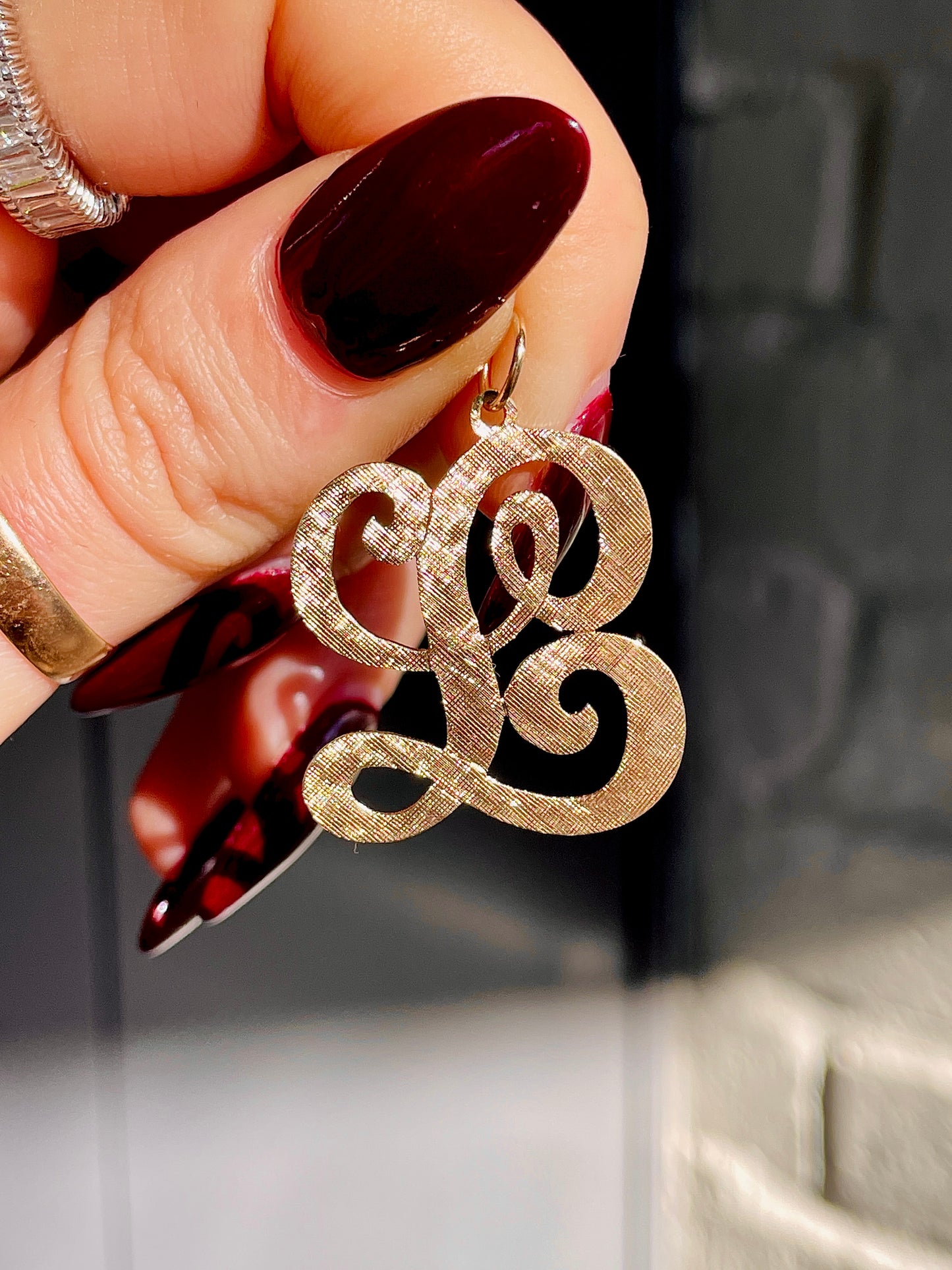 A really great vintage yellow 14K large script letter L pendant with a beautiful fine florentine finish and a larger bale. Measures 33.3 mm tall with bale and 25 mm across. No engraving on the back. In very good preowned vintage condition. Weighs 2.8 grams. Hallmarked 14K gold. In very good preowned vintage condition.