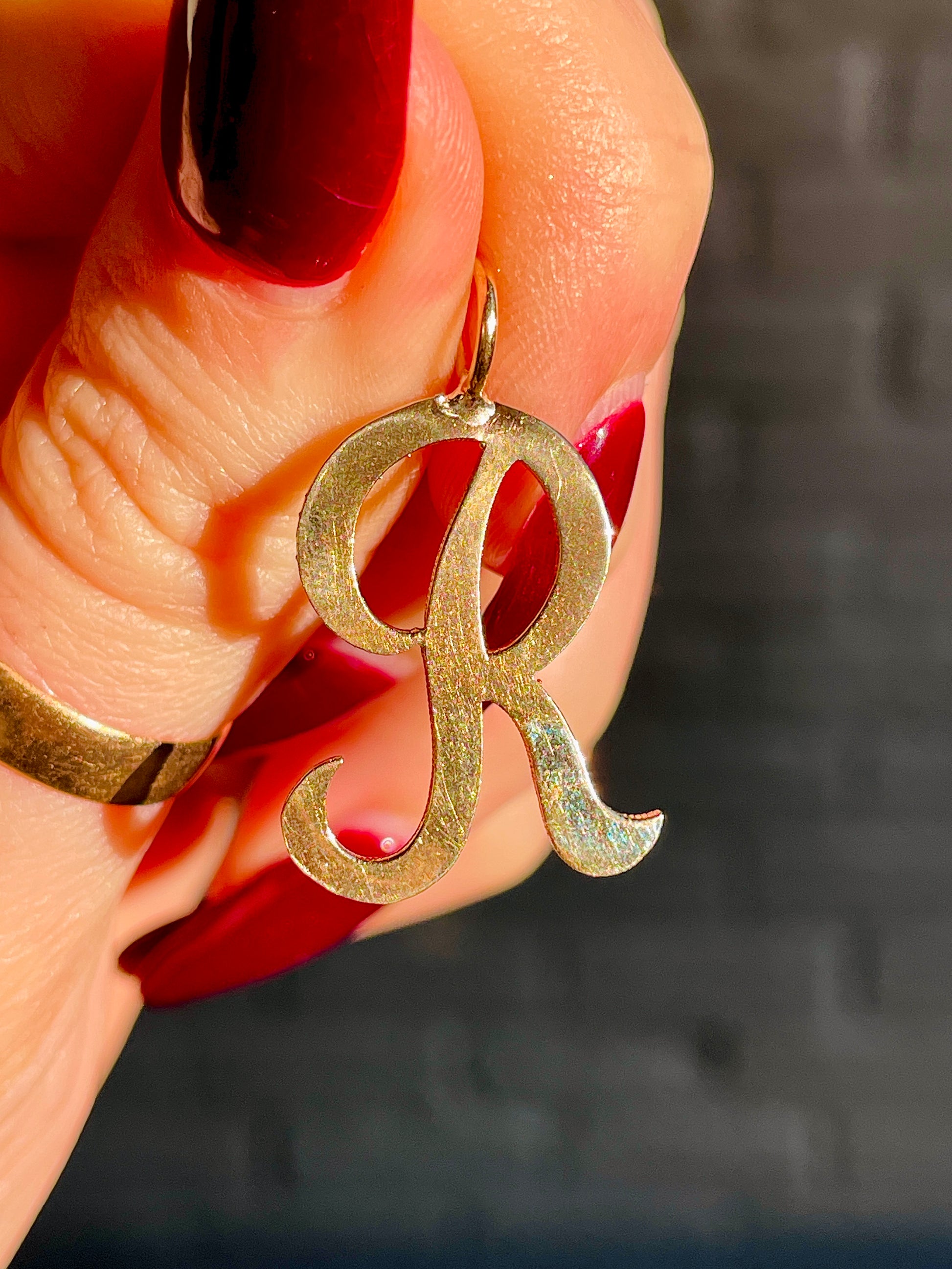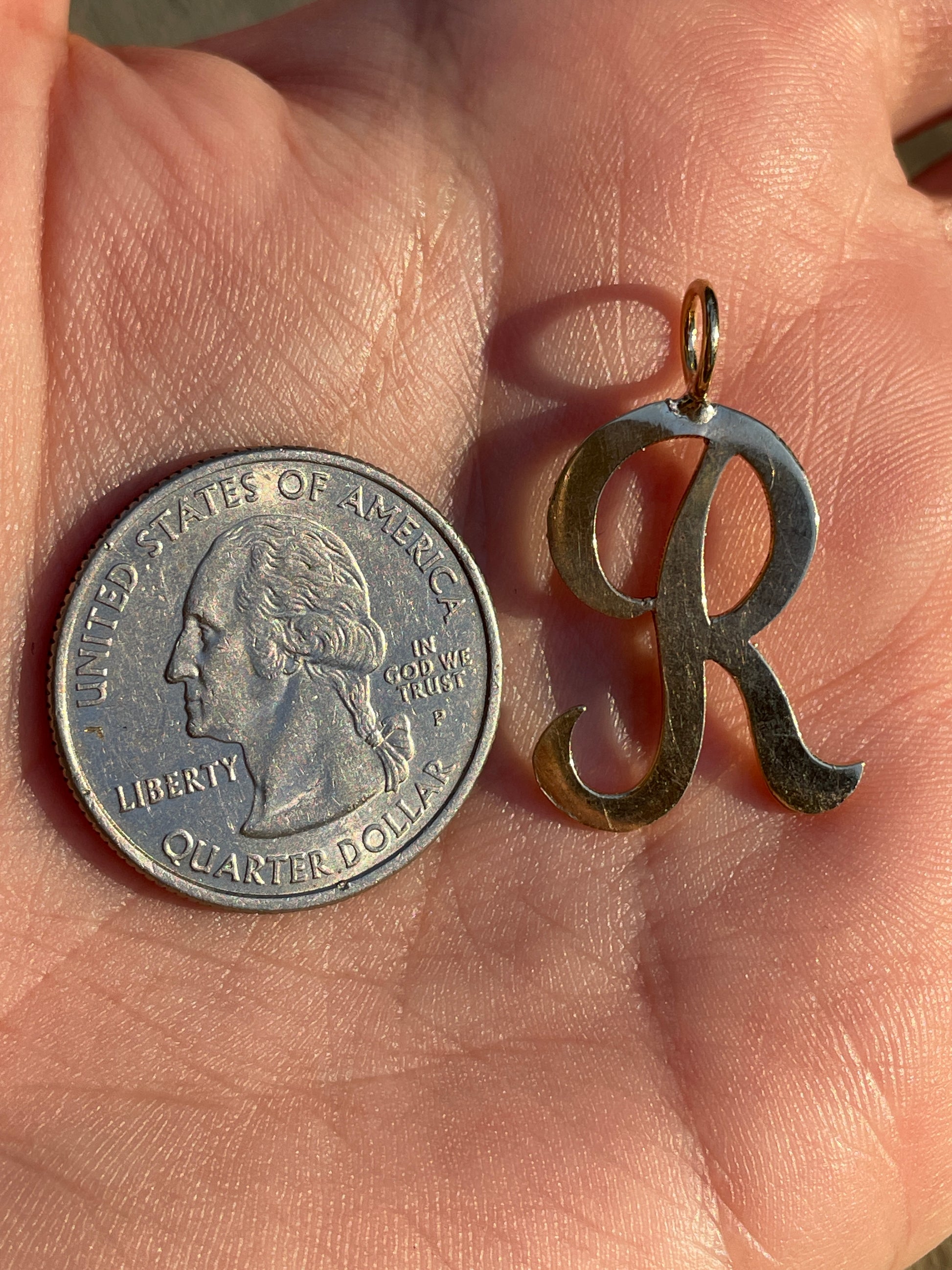 A larger Vintage yellow 14K letter script R pendant with stationary bale. Measures 29.6 mm tall and 17.8 mm wide. In very good preowned vintage condition. Weighs 1.8 grams.
