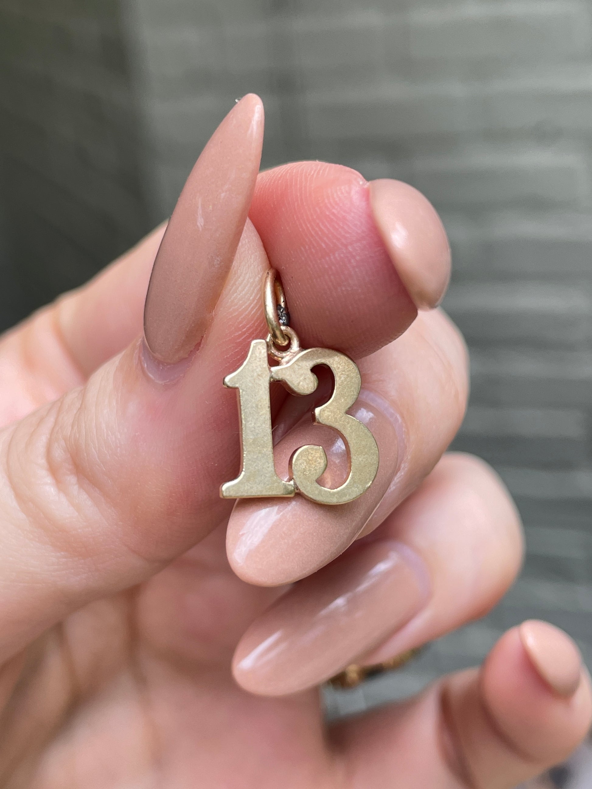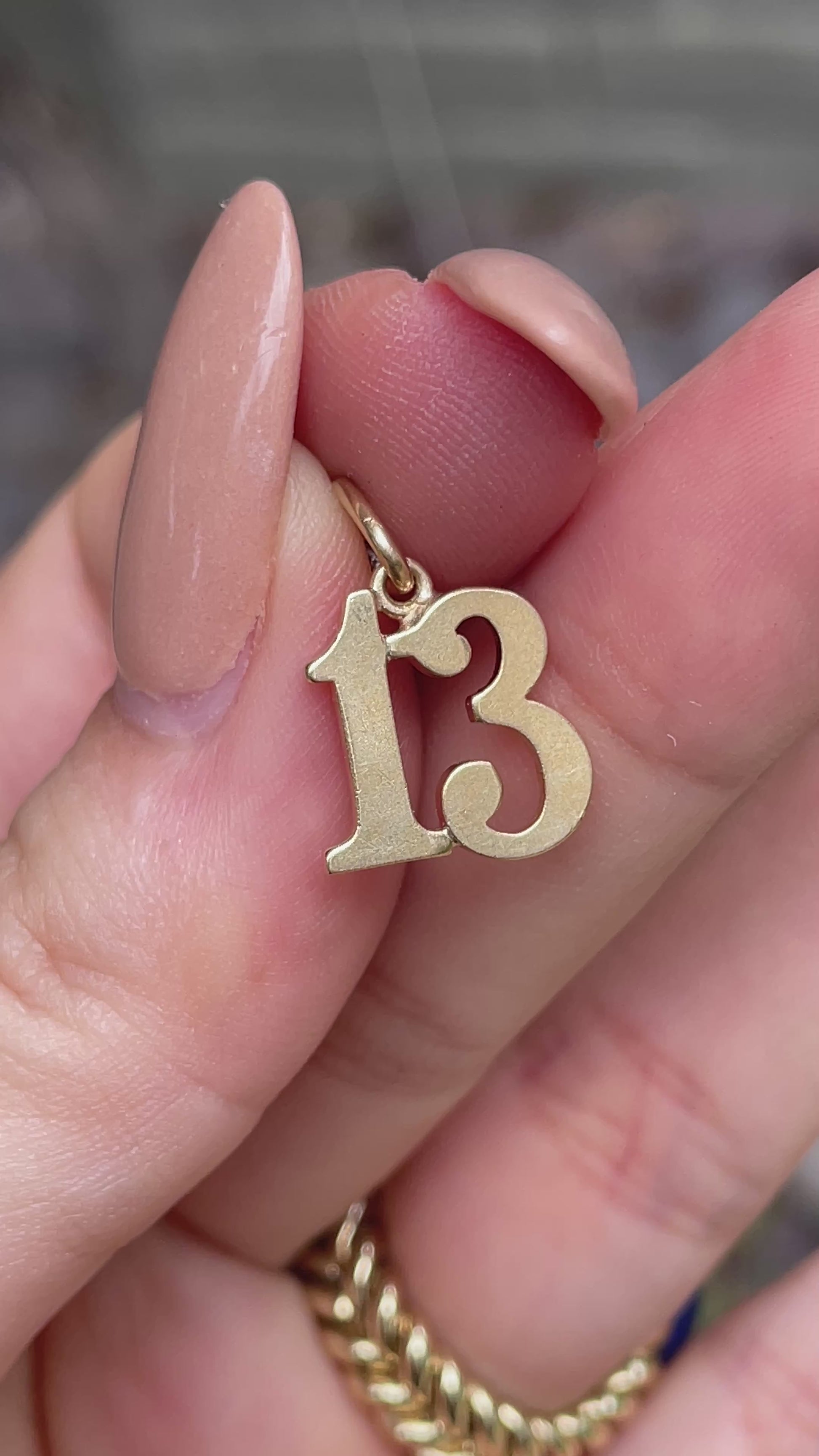 A charming solid Vintage yellow 14K number 13 charm. Measures 19 mm long with bail x 12.3 mm wide. Weighs 1.3 grams. Very good preowned condition. Some dark solder visible on bale.