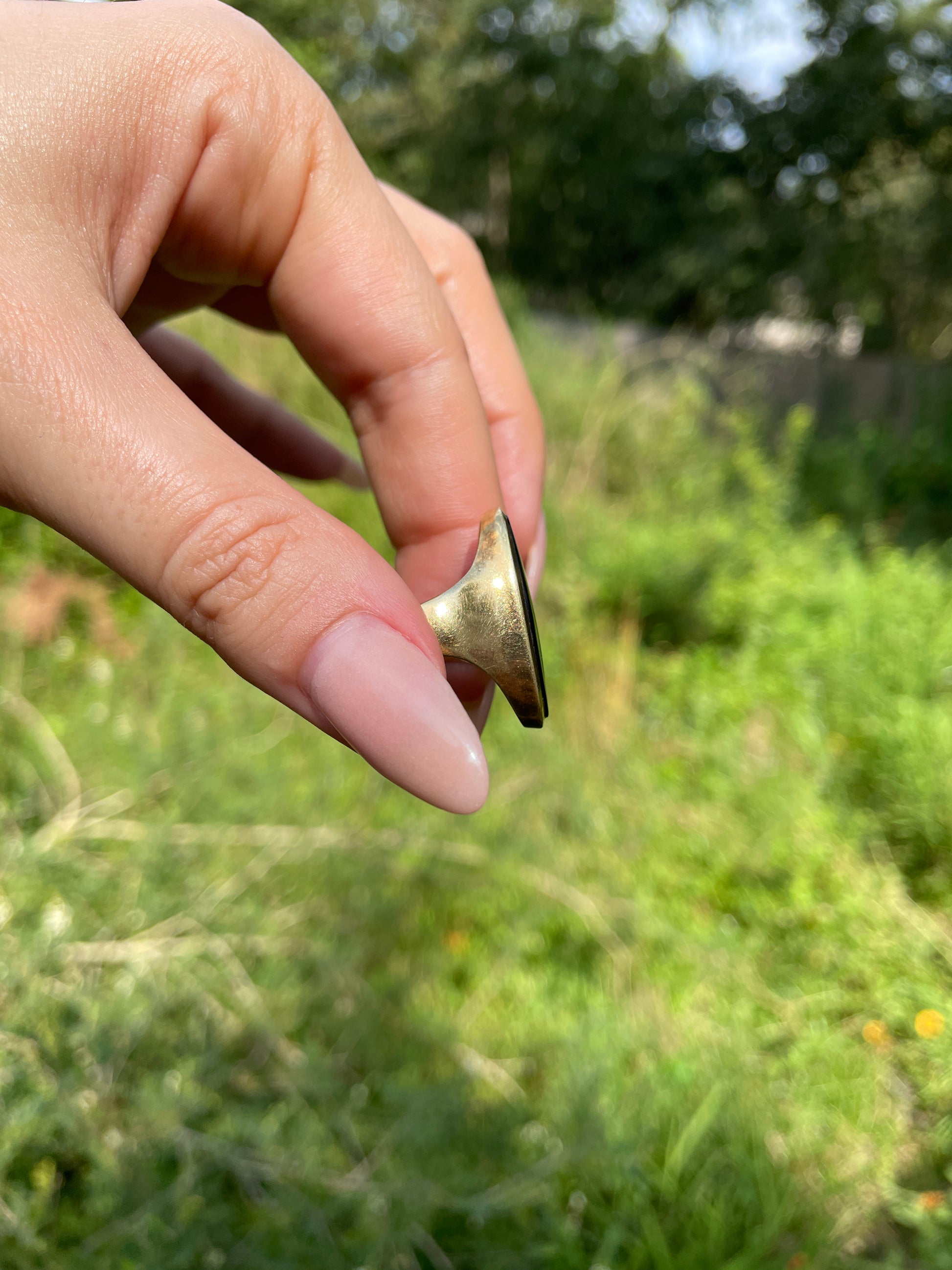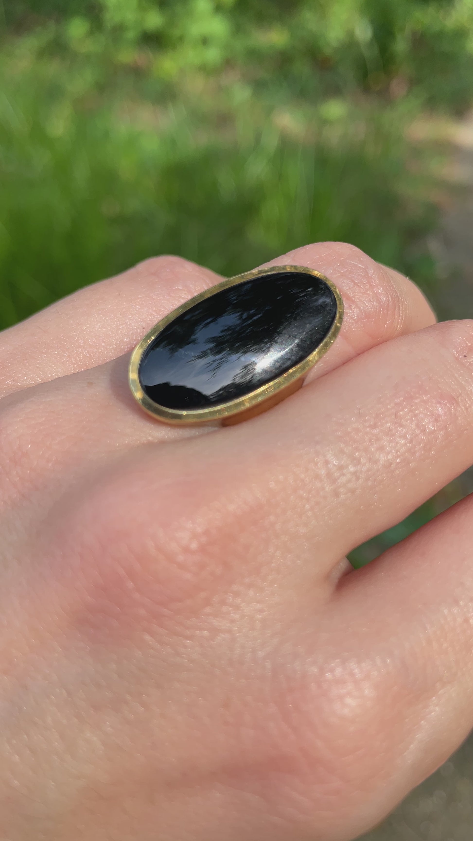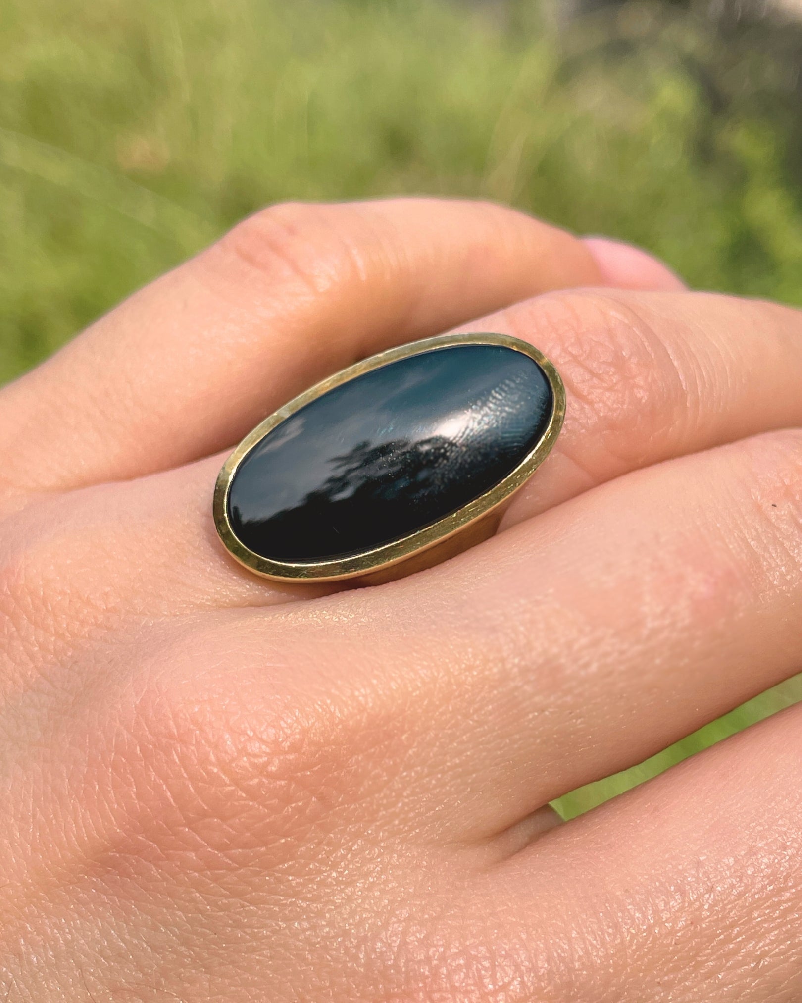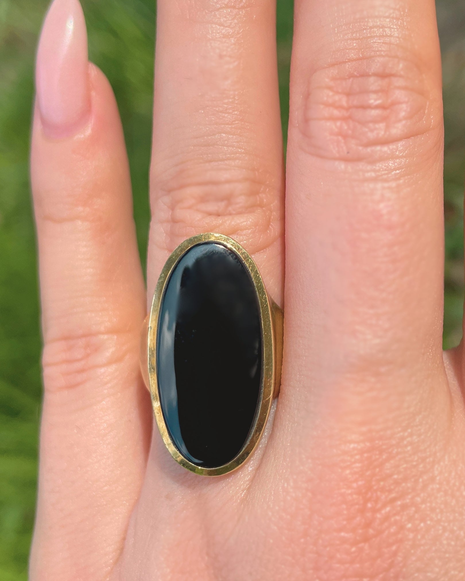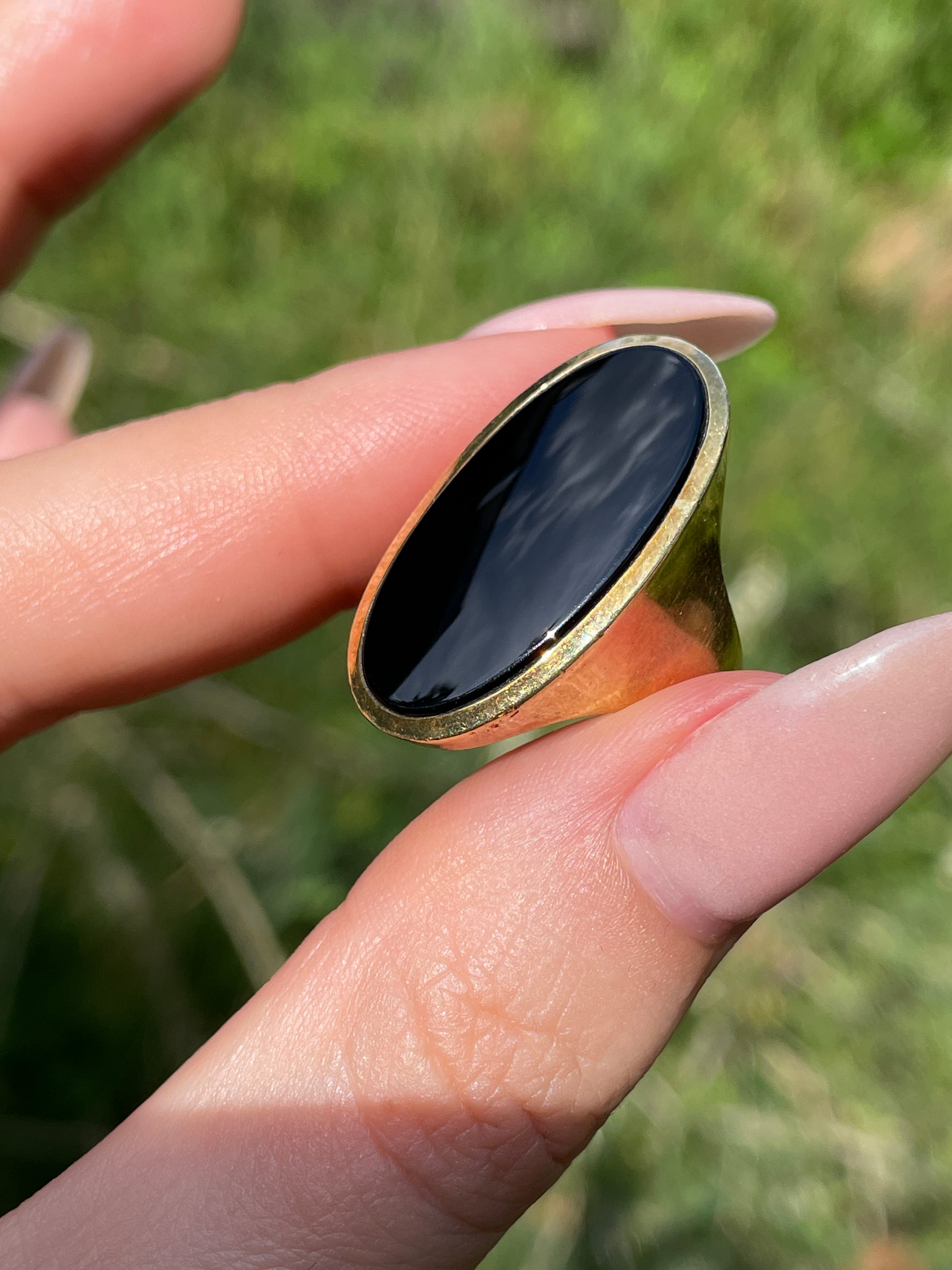 A sleek Vintage 14K onyx inlay oval signet ring, size 6.25-6.5 (sizable). Sits nice and flush and low to the finger with elongating statement coverage. Face of ring measures 27 mm wide x 13.4 mm. Onyx in great condition no scratches or cracks. Weighs 11.4 g.