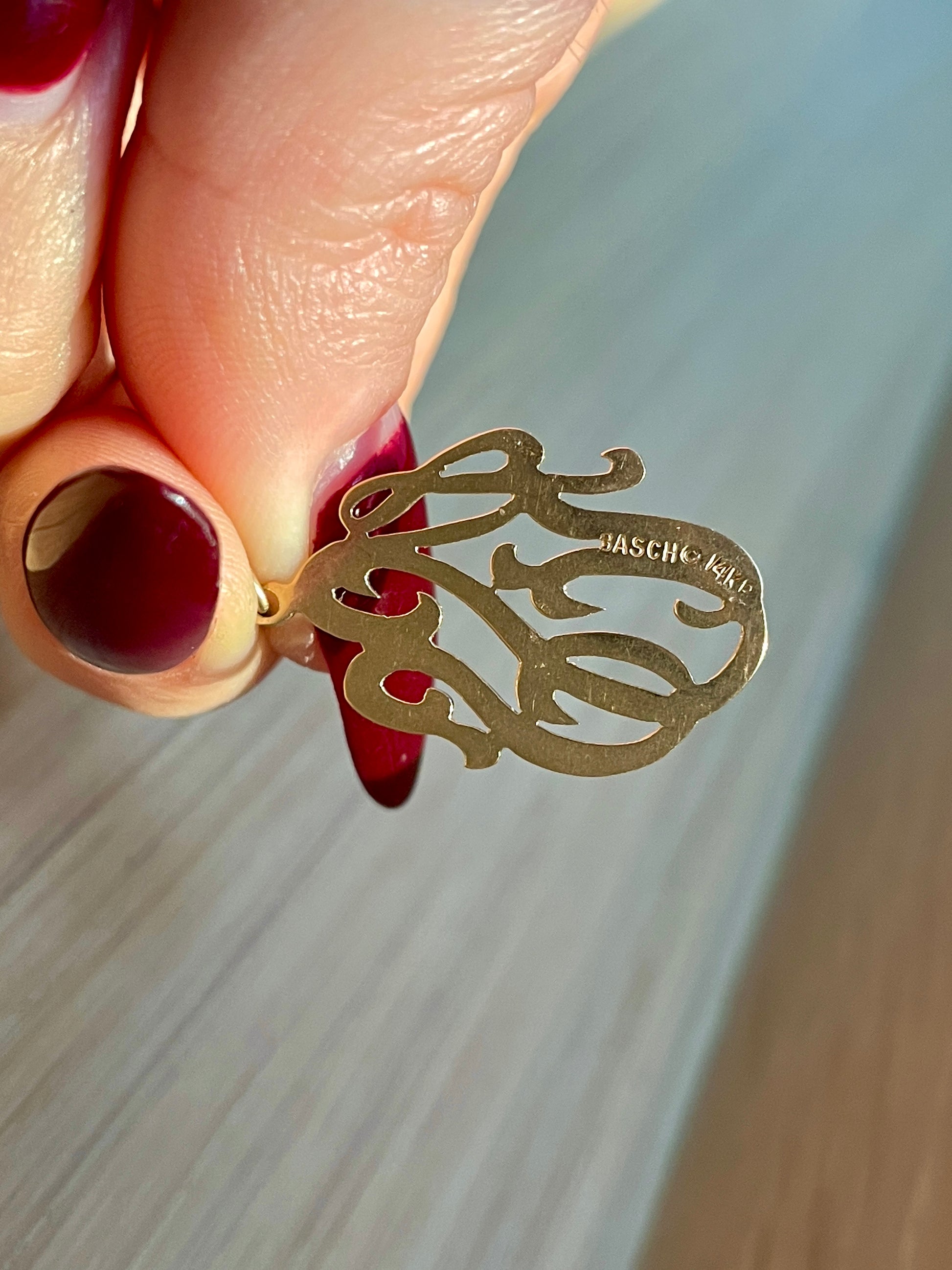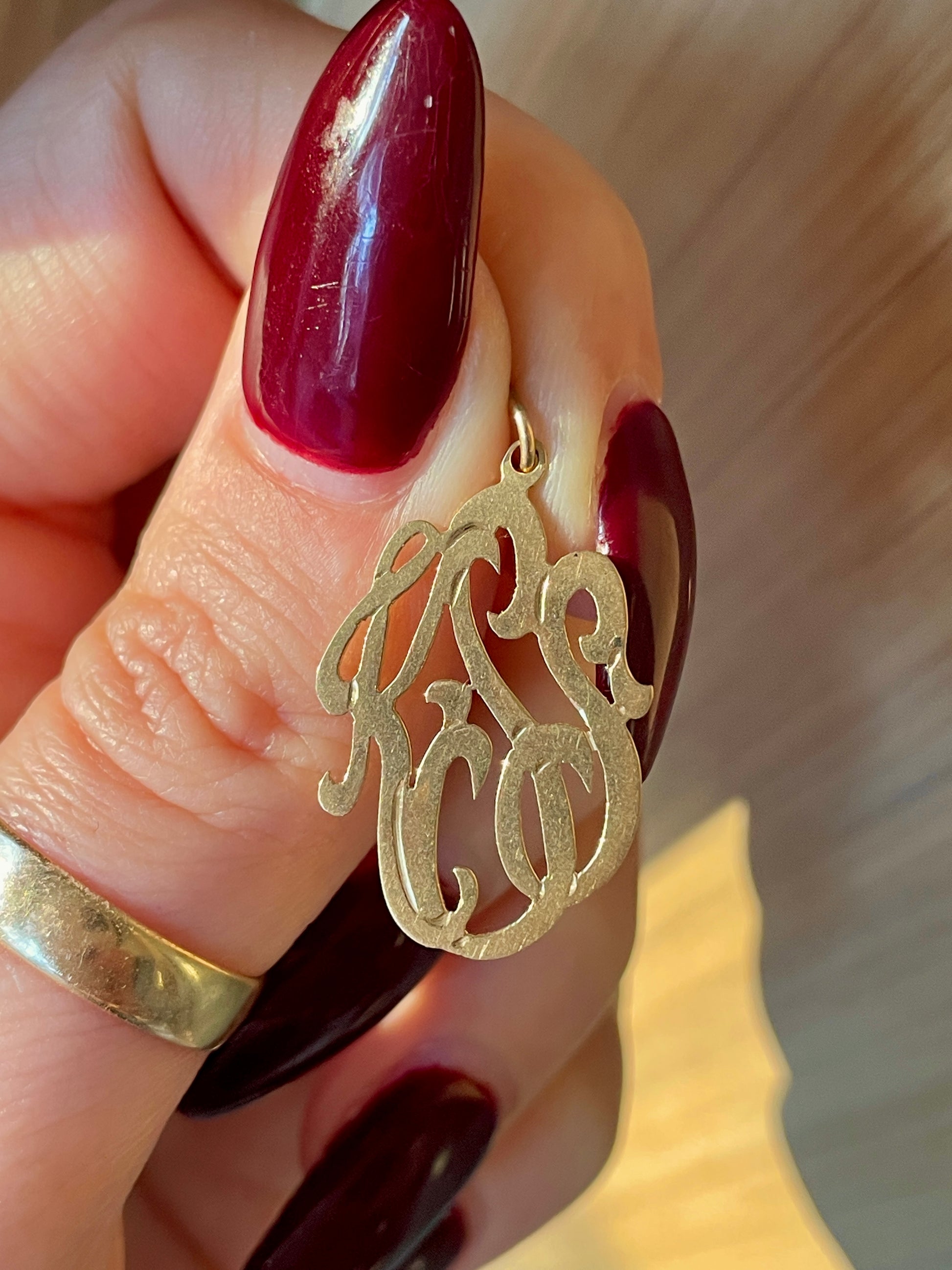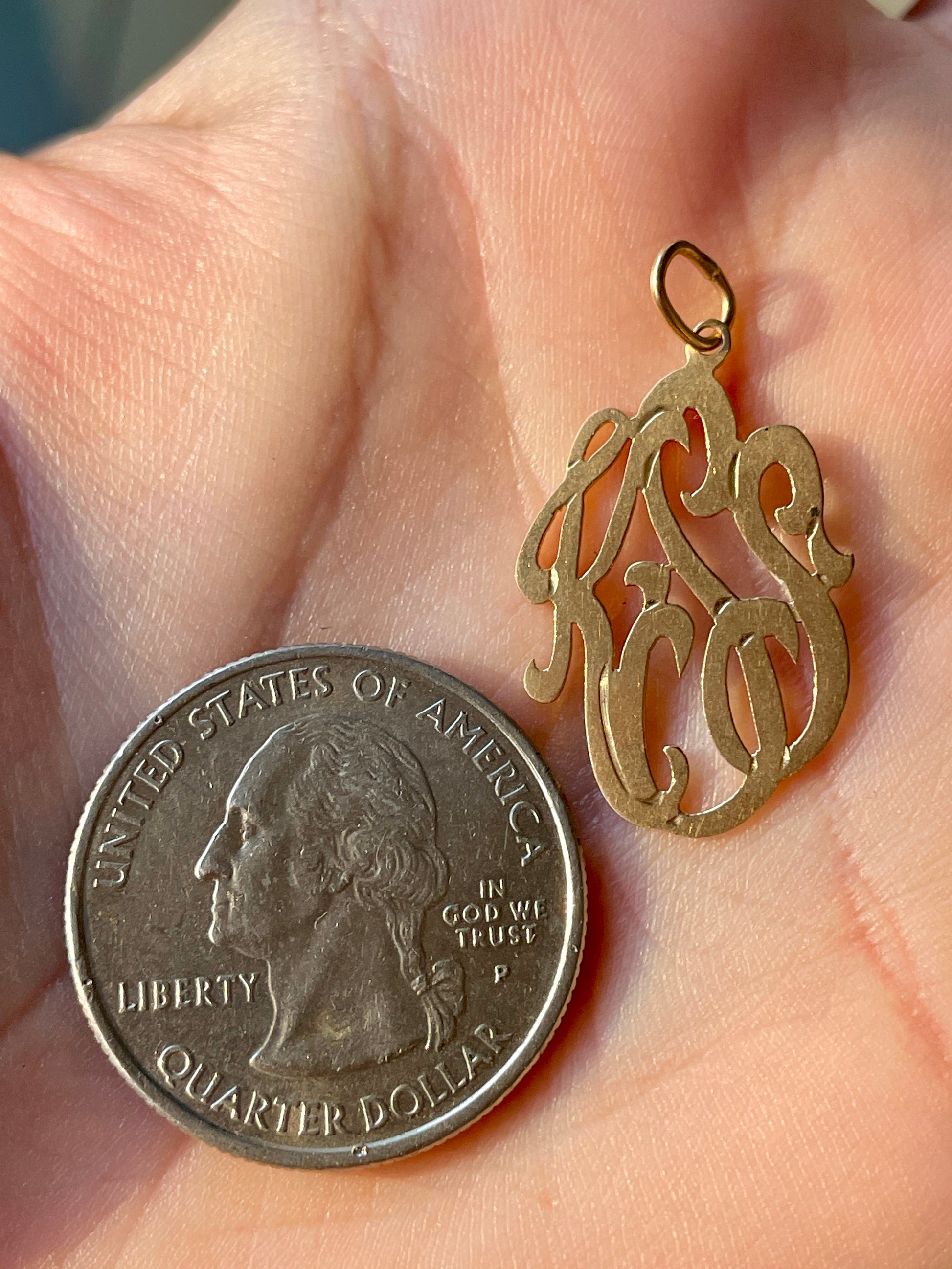 A sweet vintage yellow 14K initial pendant with KSS (or SSK) initials. Measures 29.4 mm tall with bale and 16.6 mm across. In very good preowned vintage condition. Weighs 1.2 grams. Hallmarked 14K gold. In very good preowned vintage condition.