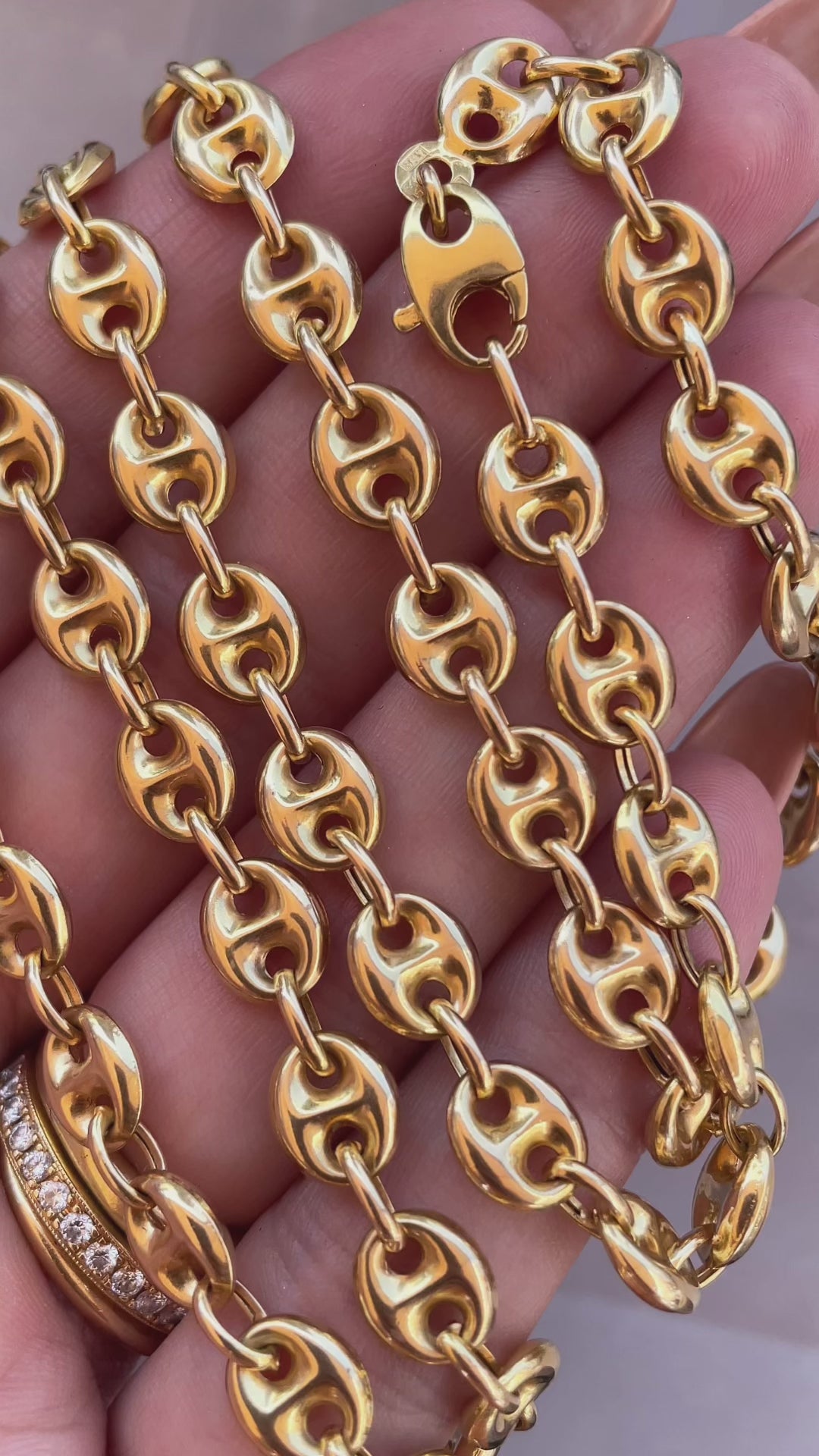 A really great Vintage yellow 14K mariner link chain, 23.5 inch long with a coordinating mariner link shape lobster clasp. Links are semi solid. Measures 7.2 mm wide. Weighs 18.6 grams. In very good preowned vintage condition with no dents.