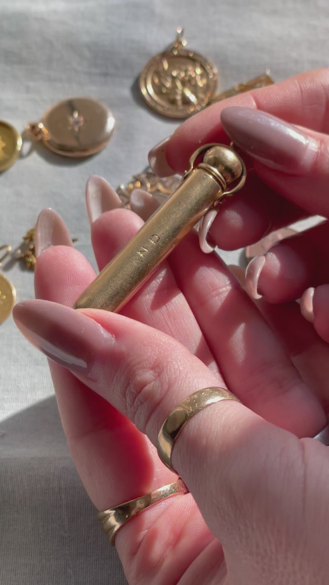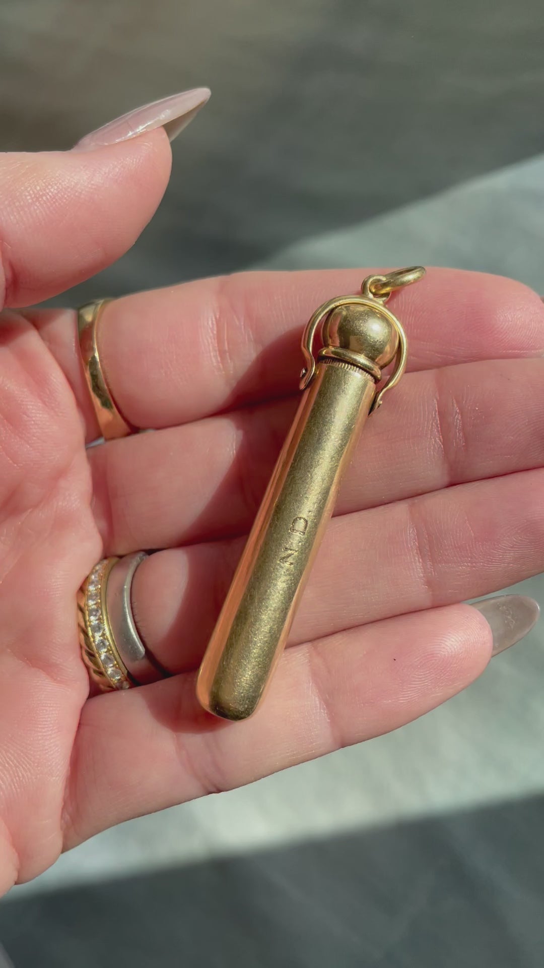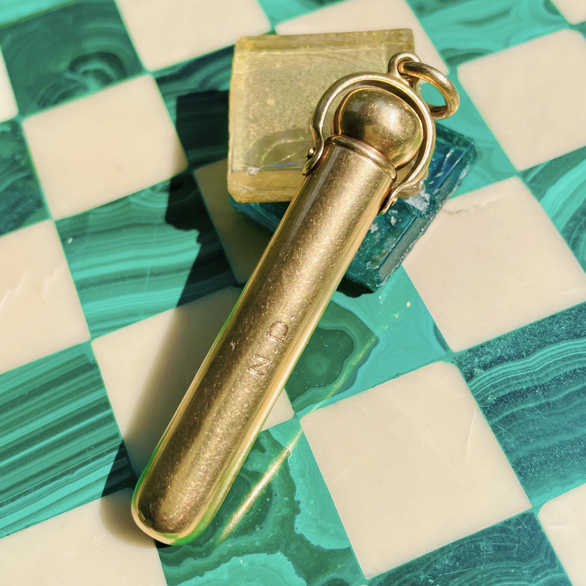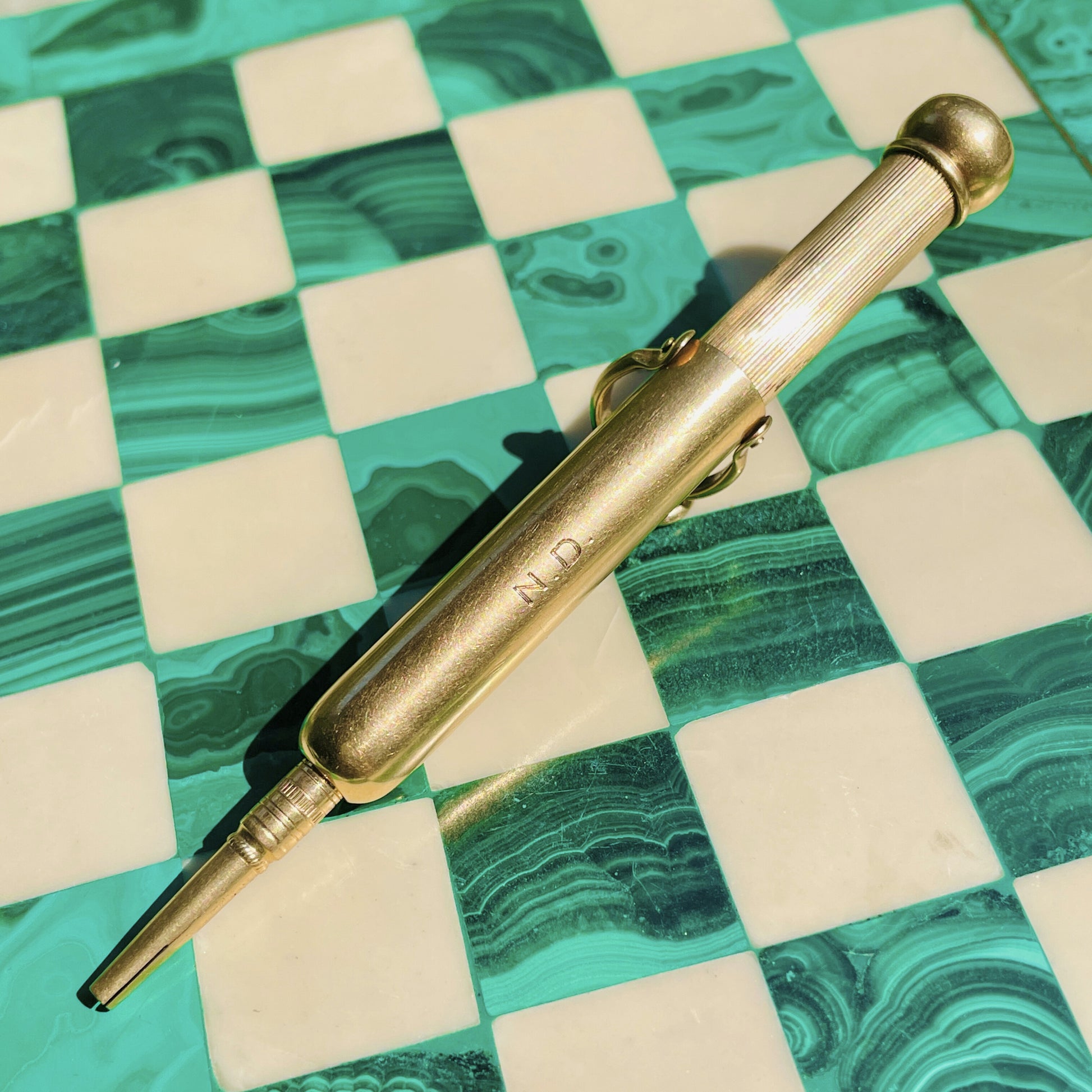A Vintage yellow 14K retractable writing pencil pendant with engraved “N.D” initials on side, hallmarked 14CT and has a 'WS; makers mark. Has a large bale which hinges down so the end of the pendant can be pulled to reveal the lead-holding pencil end. The mechanism is smooth and in great shape! It does not come with lead for writing.
