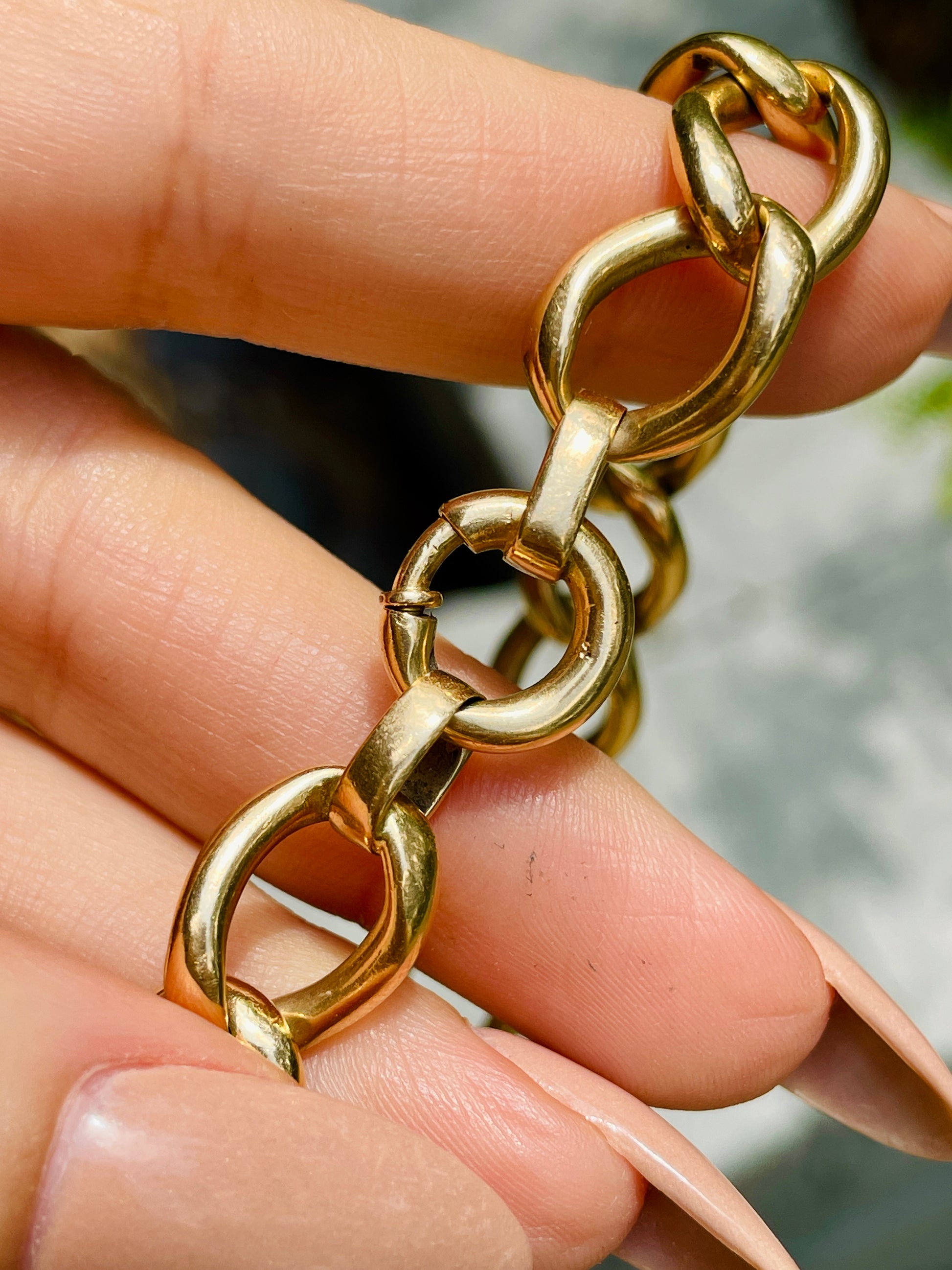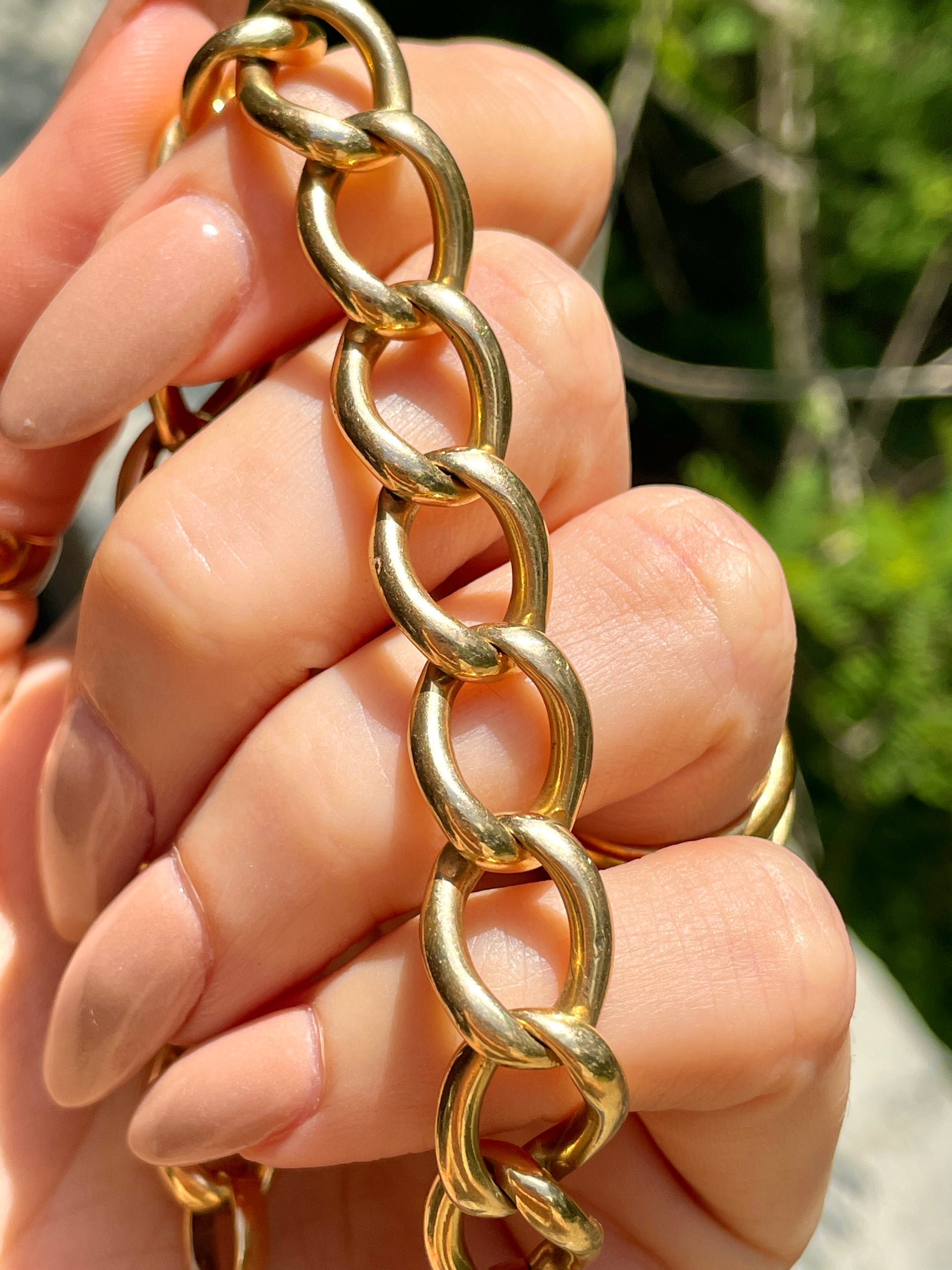 A bold Vintage yellow 14K round open curb link bracelet, currently measures 8.25 inch but we can remove links to shorten by 0.5 inch increments. Love the openness and scale of this rounded link! Link is 11.4 mm widest and thickly constructed and durable but totally solid. Has a built in continuous bolt clasp closure that is tight and secure. The design of this bracelet also makes it a great chain extender! Weighs 19.4 grams. 14K hallmarked. In very good preowned vintage condition with no dents on curb links and just minor dents on the bolt clasp.