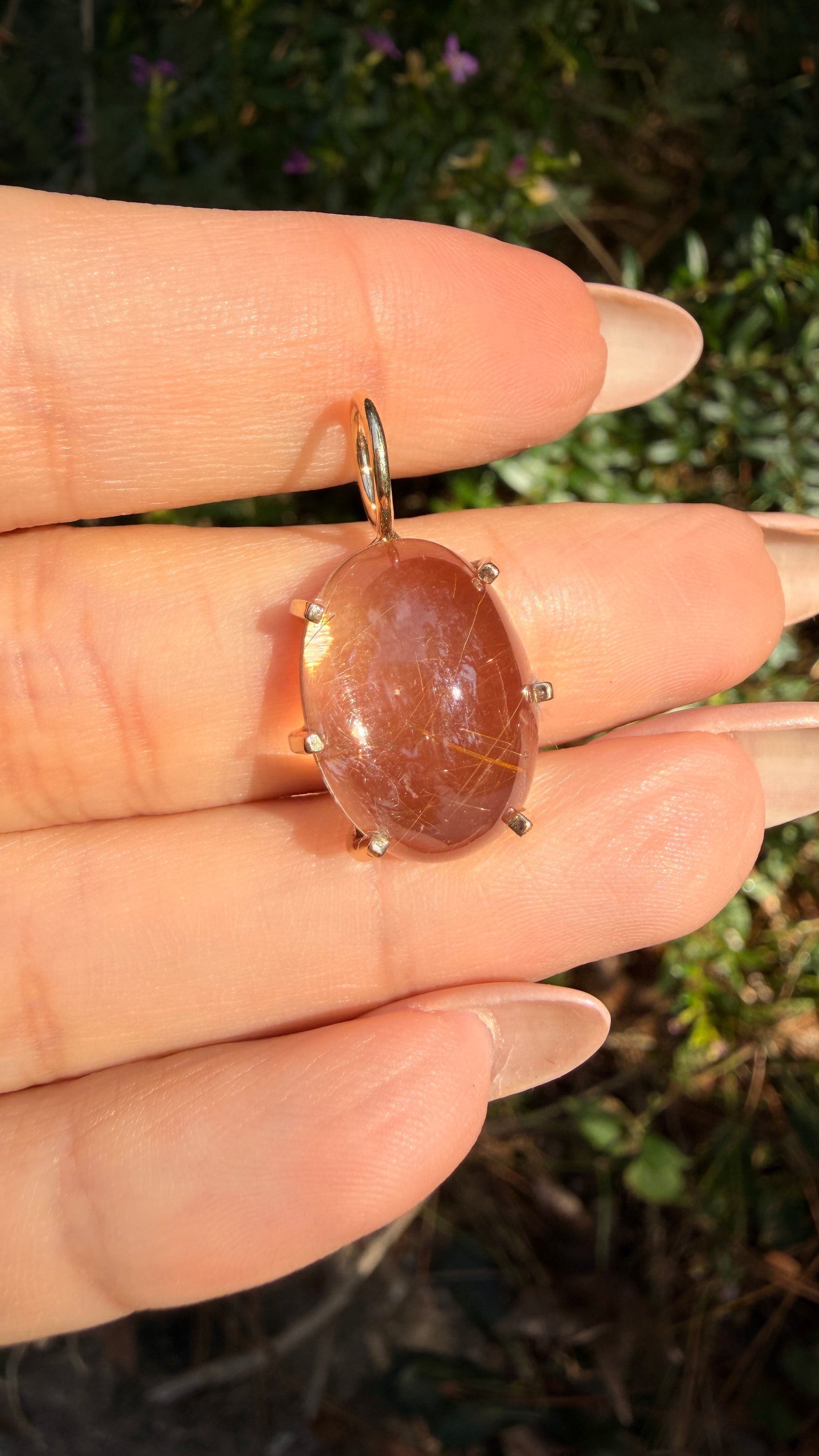 A beautiful Vintage yellow 14K rutilated quartz cabochon pendant with squared prongs. Measures 26.4 mm long x 15 mm wide and weighs over 3.8 grams. Bale opening is over 6.2 mm. Very good preowned condition.