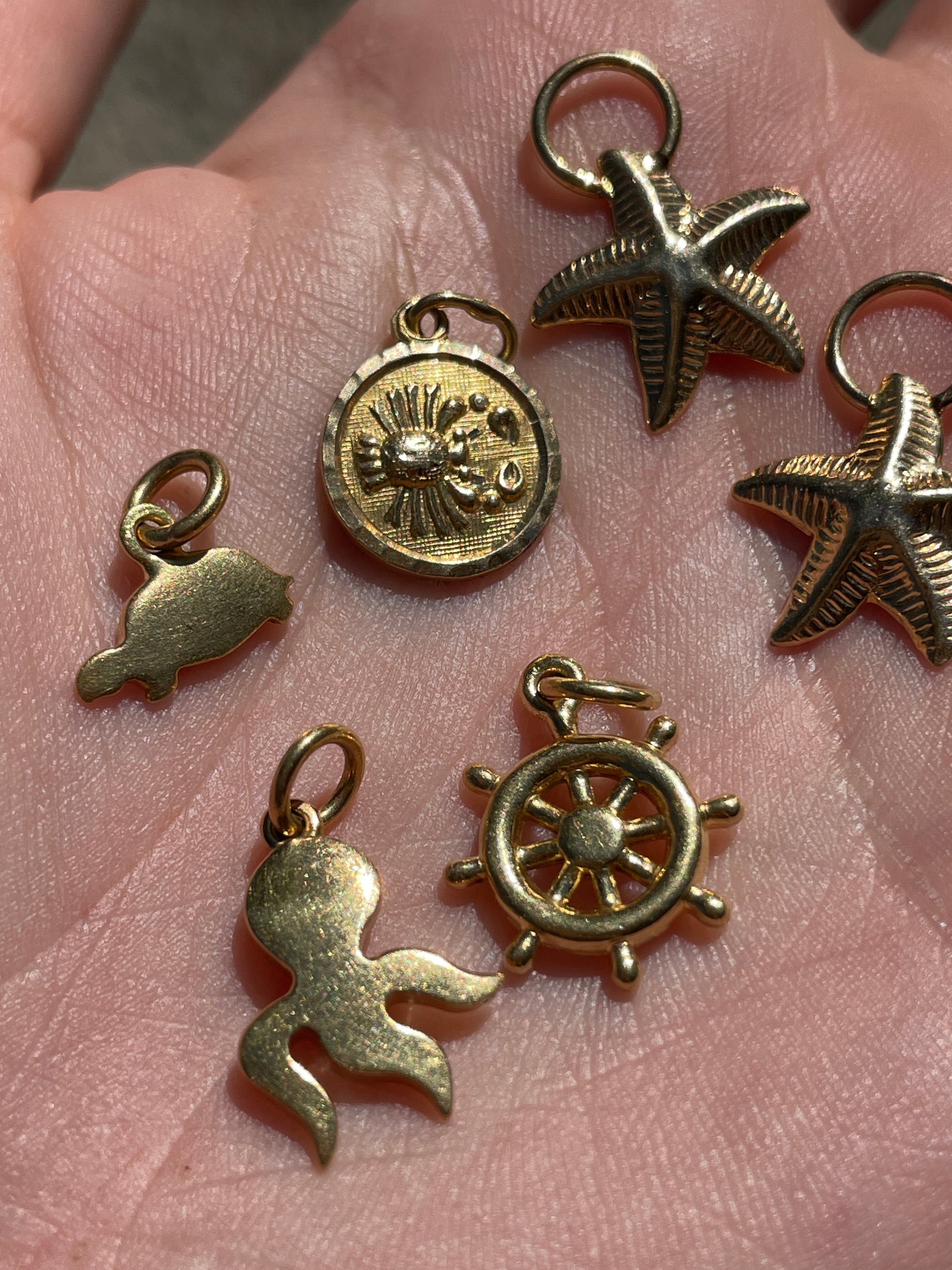A whimsical Vintage yellow 14K small Cancer crab medallion charm with a fun play on textures. Measures 19.3 mm long with bale by 12.4 mm wide. Bale is not soldered for ease of putting onto a charm bracelet. If you'd like the bale soldered closed before shipping please leave an order note. Weighs 1.74 grams. Hallmarked 14K on reverse. In very good preowned condition.
