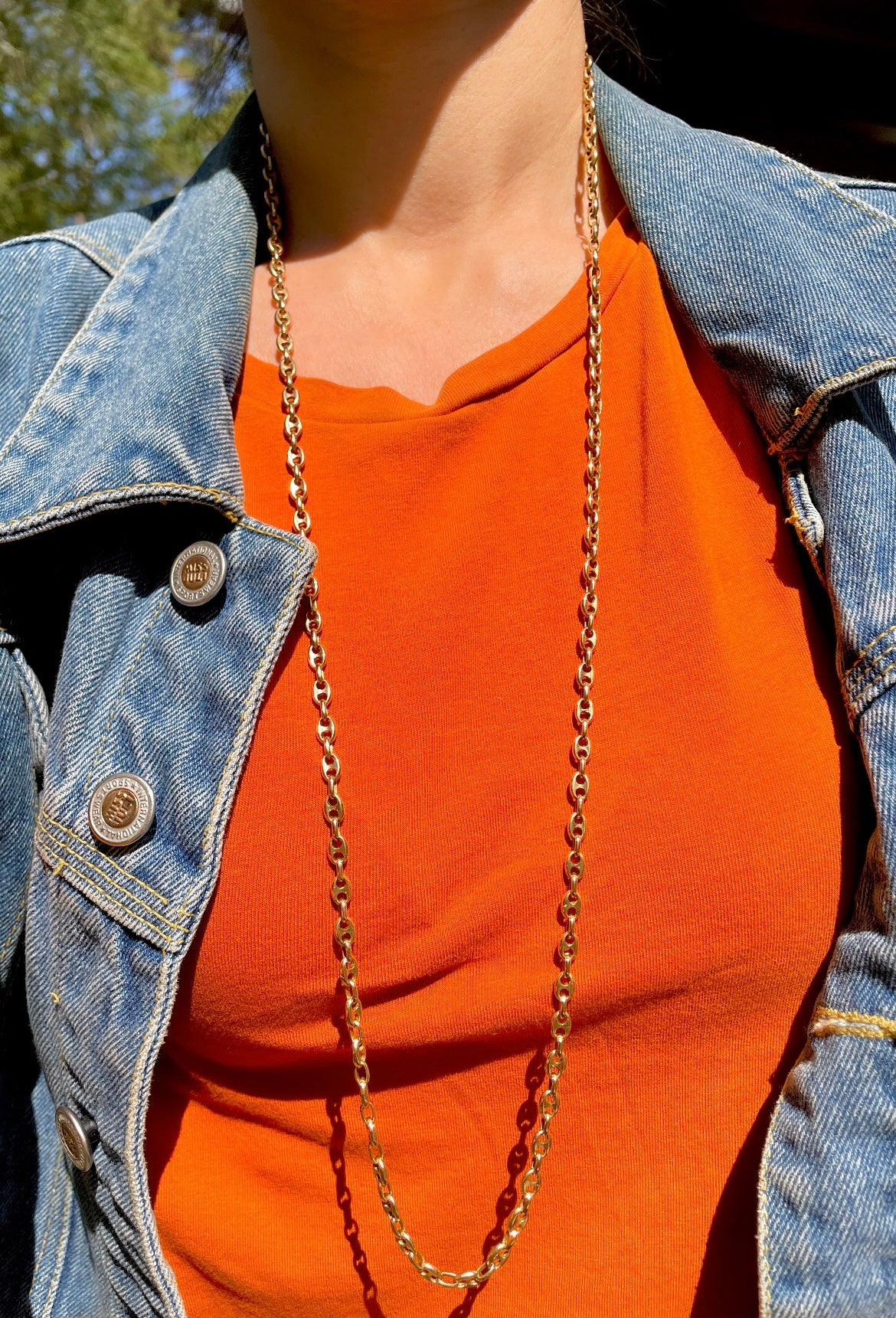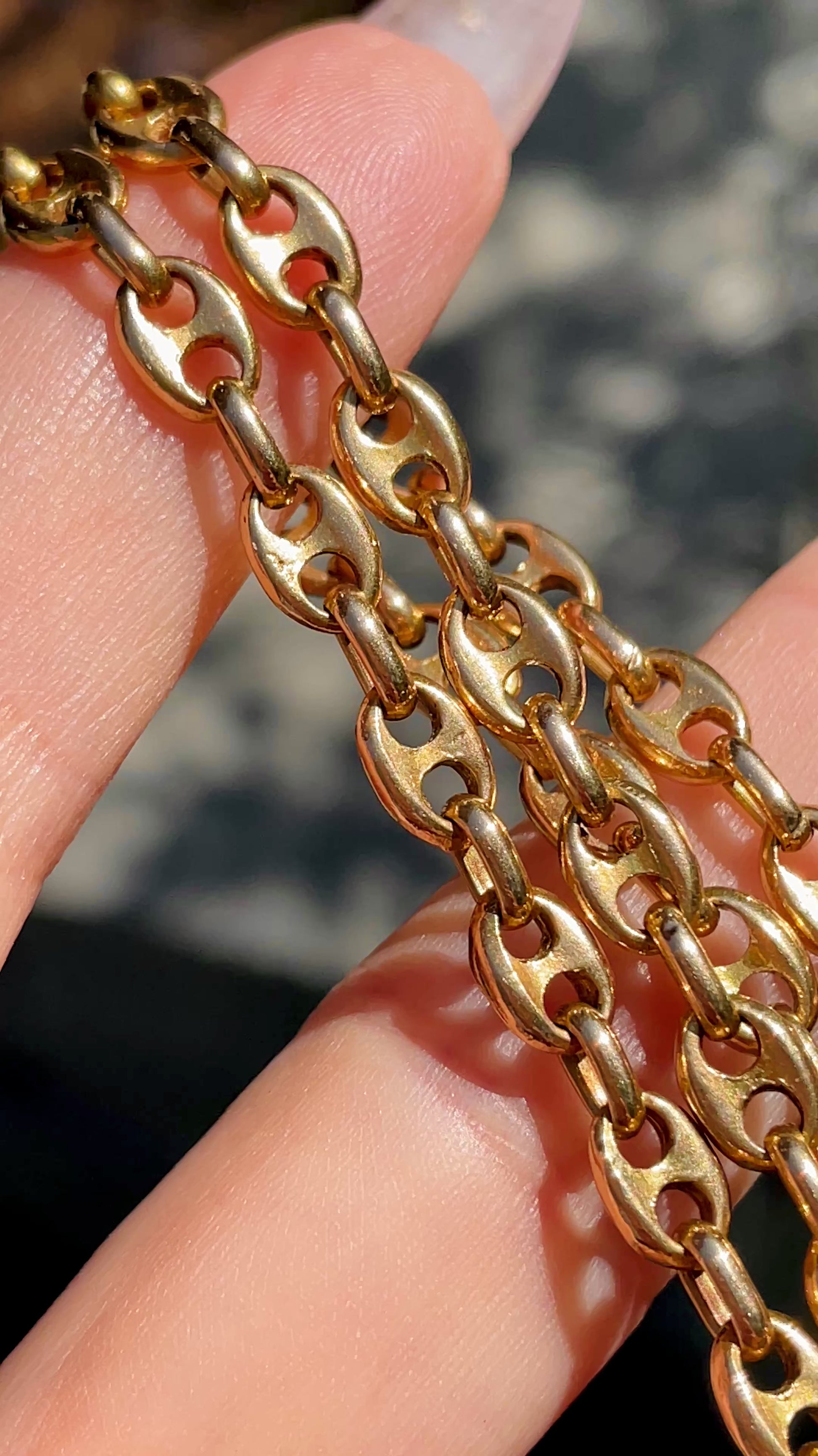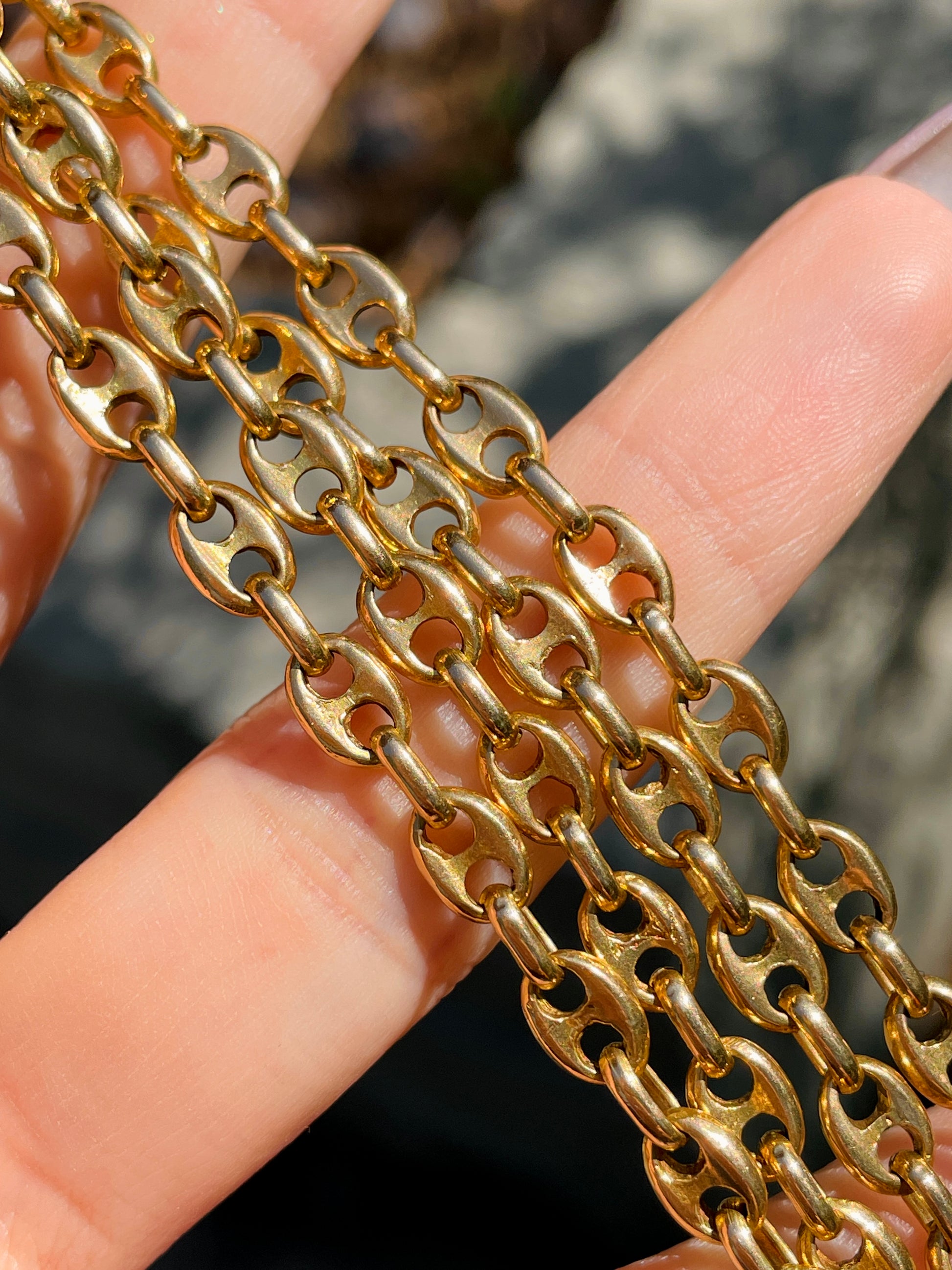 Best mariner chain I've found so far. Yellow gold links are totally solid. Can be worn so many different ways, long, doubled or even tied in a lariat style that stays put due to the heavy weight of the links. Weighs 55.1 grams, 4.5 mm wide, 35.25 inch long, secure tube clasp and side safety. In very good preowned vintage condition.