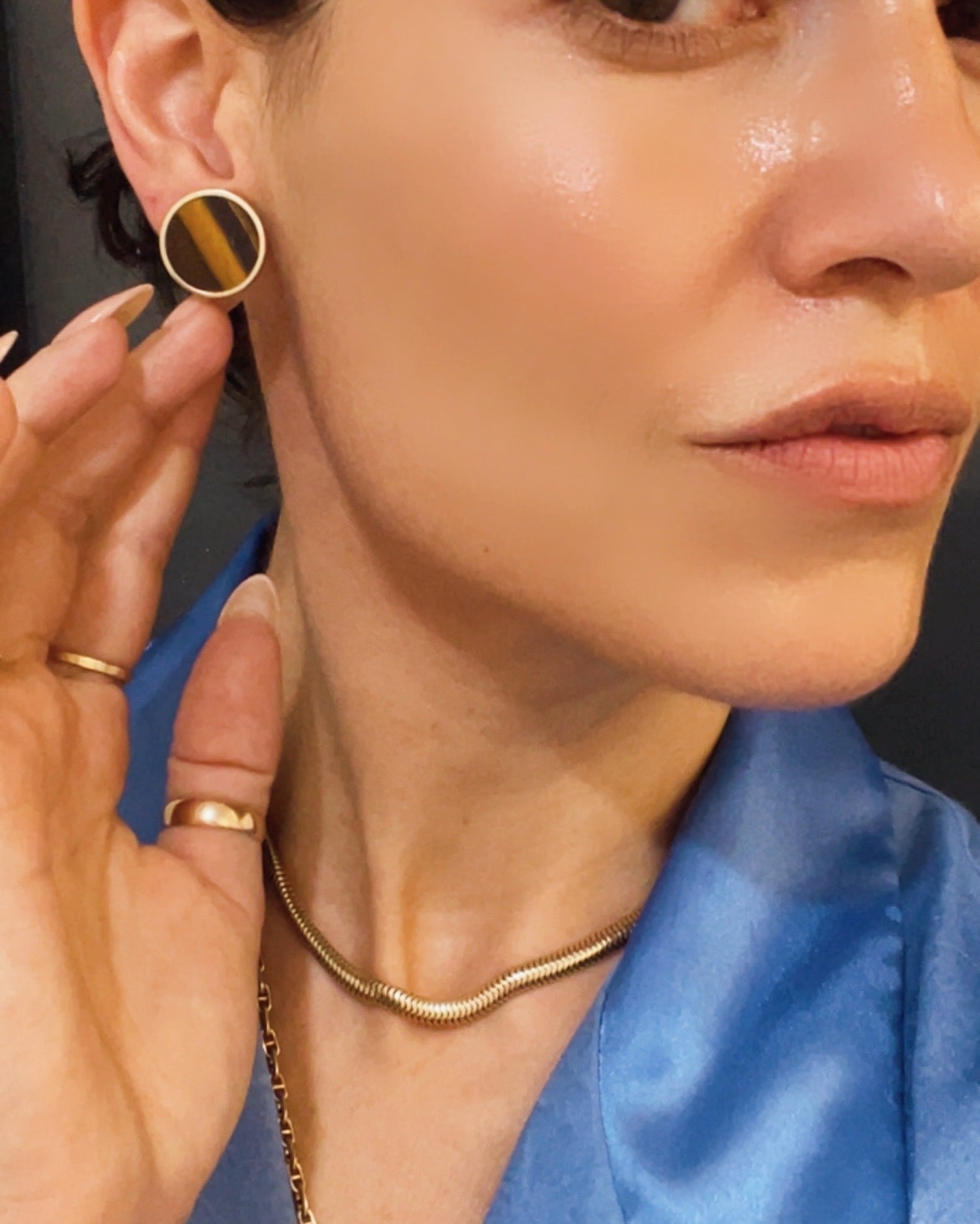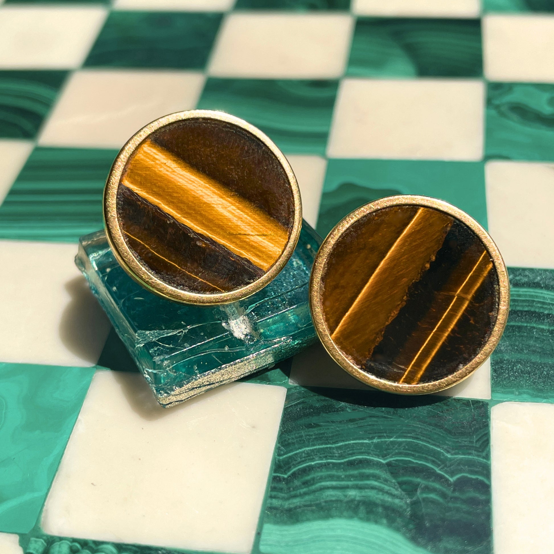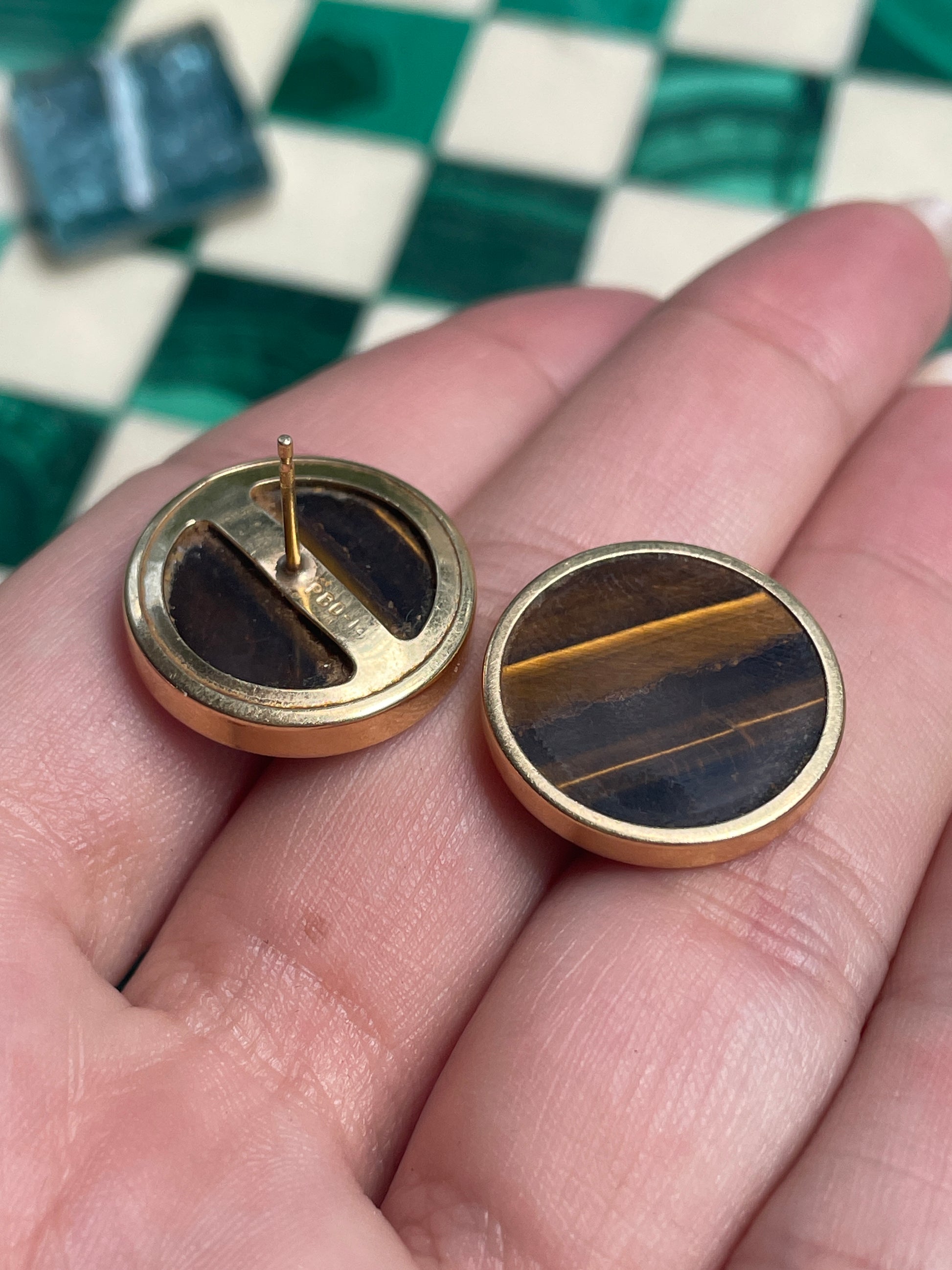 Vintage yellow 14K Tigers eye bezel set disc post earrings