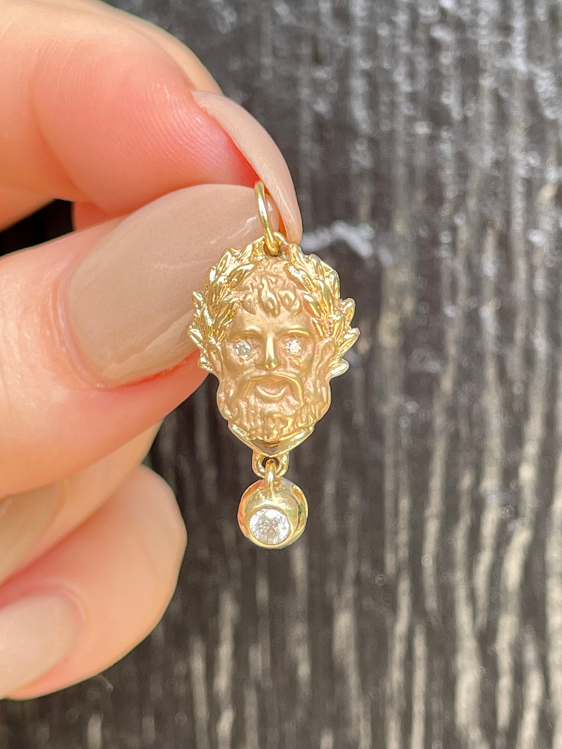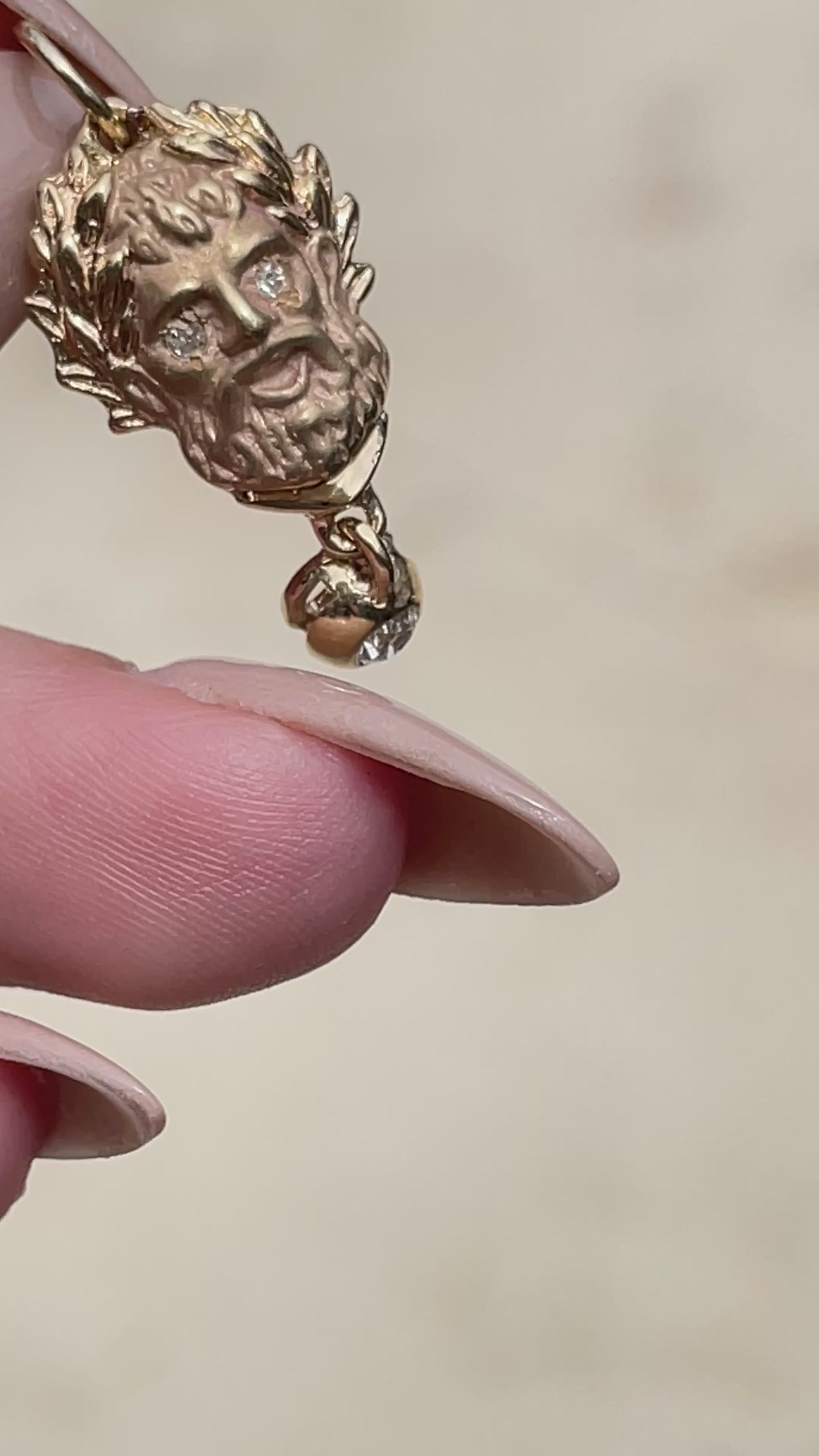 Vintage yellow 14K Zeus pendant with diamond eyes and dangling .07 ctw diamond bubble
