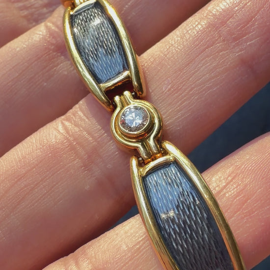 Vintage yellow 18K approx 1.5 ctw diamond and blue enamel link bracelet, 6.75 inch