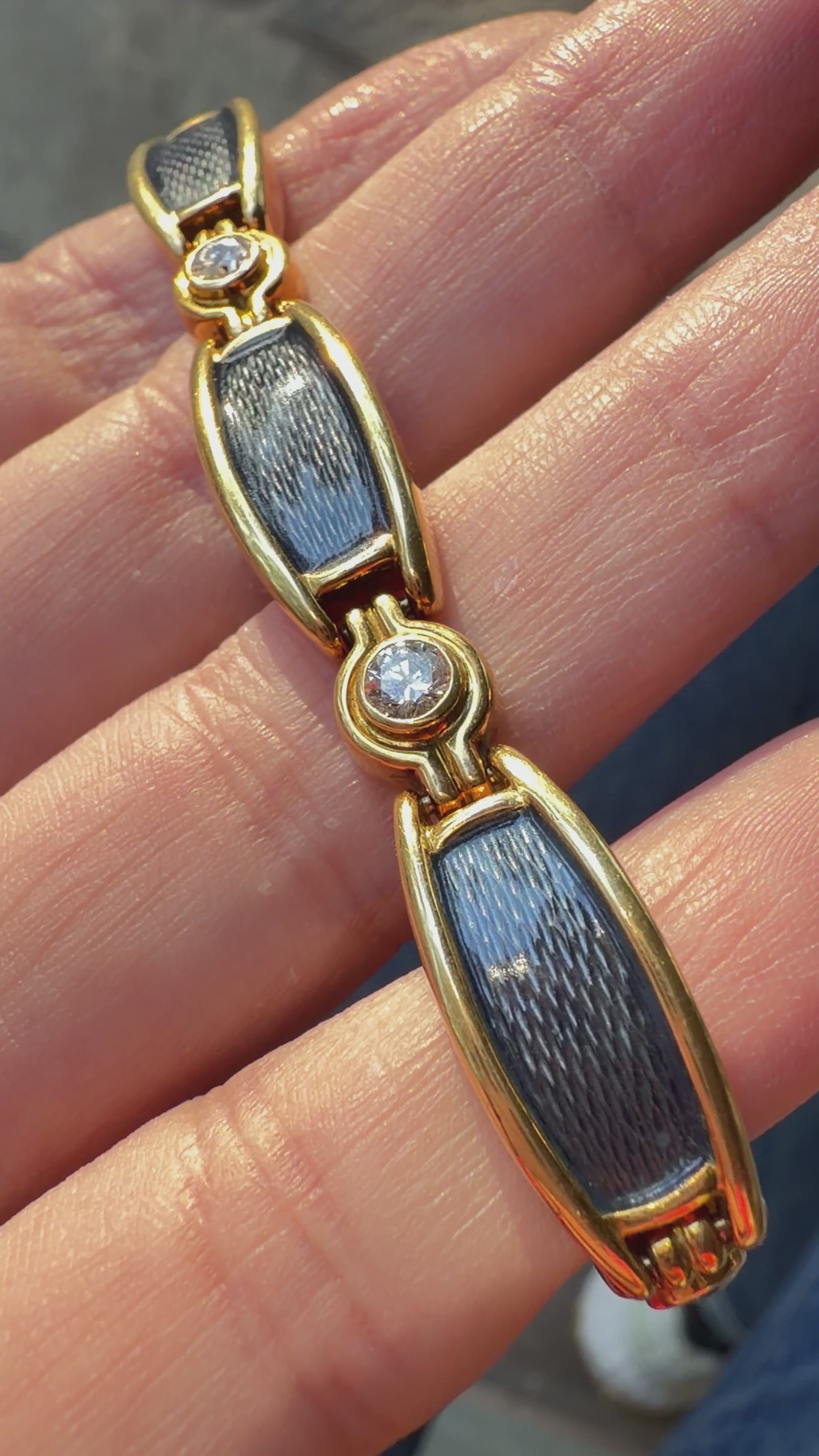 Super chic incredibly well made Vintage yellow 18K approx 1.5 ctw diamond and transparent blue enamel link bracelet, 6.75 inch long. Width is 9 mm widest. Diamonds are very high quality, G color, VS clarity and super sparkly. Recessed detail of links protects the transparent dusty blue guilloche enamel which has minimal to no wear. Weighs 37.8 grams. British marks for 18K gold with makers marks too hard to decipher. Very secure box clasp.