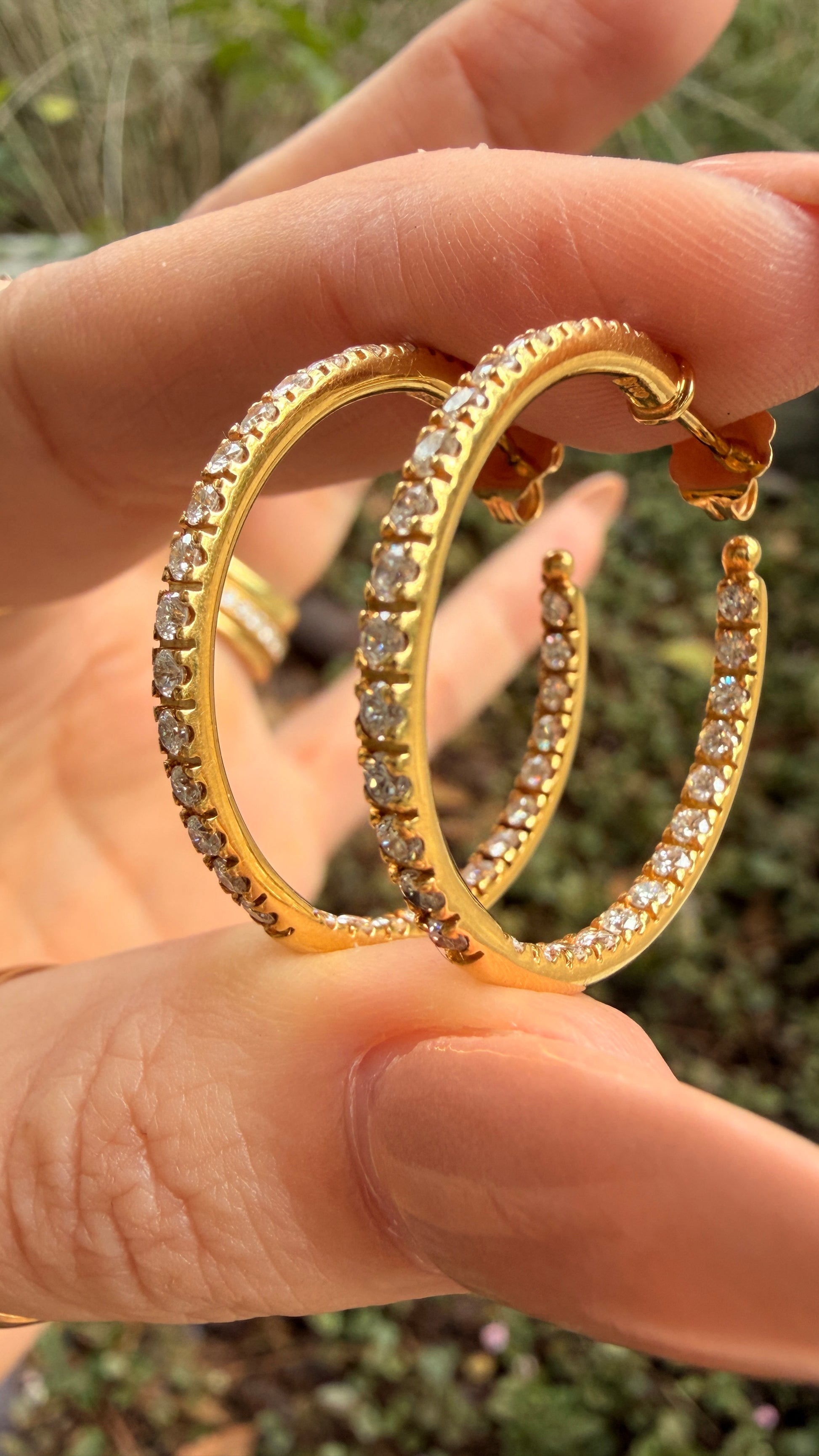 A super chic pair of Vintage yellow 18K approx 1.9ctw diamond inside out round hoop earrings. 29 sparkly H color, VS/SI clarity natural diamonds set in each earring, and each earring measures 28.2 mm long from post and 29.1 mm across. Weigh 7.9 grams combined. In good preowned condition.