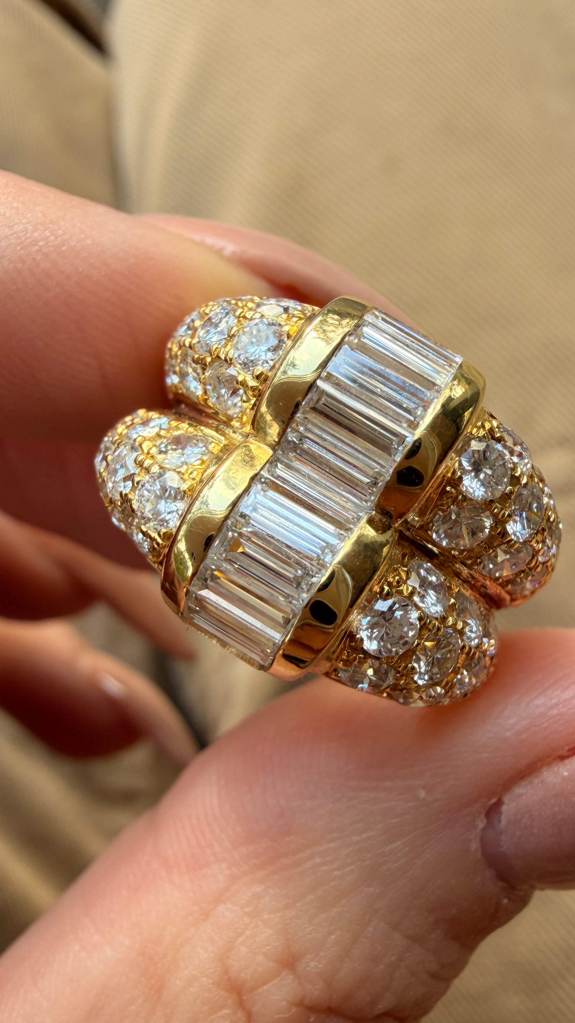 A Vintage yellow 18K approx 2.5ctw diamond double ring with baguettes and rounds, size 6 covered in bright natural diamonds (GH color, VS to SI clarity). Has the look of 2 rings but it’s 1! Really looks like a designer piece, truly gorgeous. Face measures 14.8 mm widest. Sizable up (see link to sizing listing if needed). Weighs over 7.3 grams.