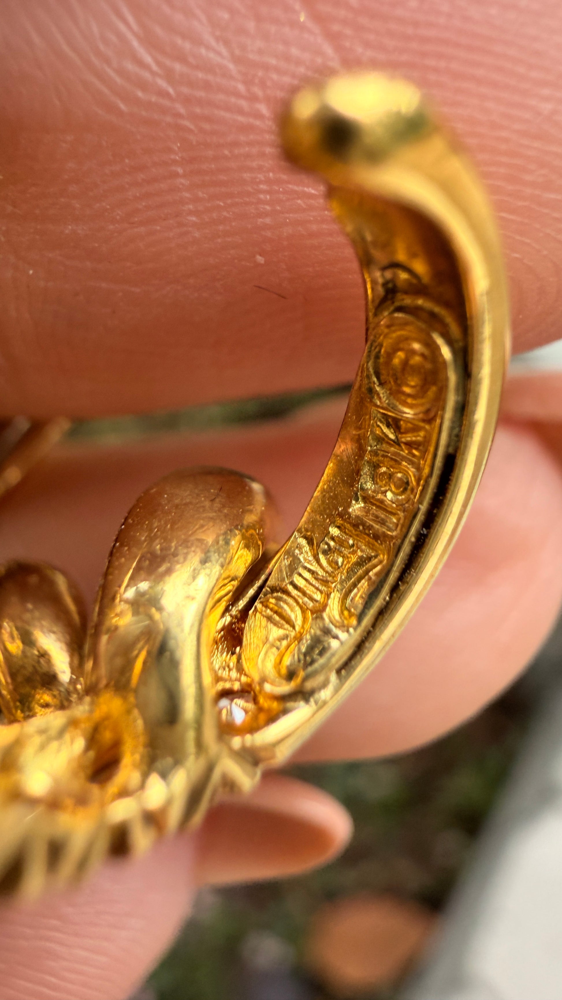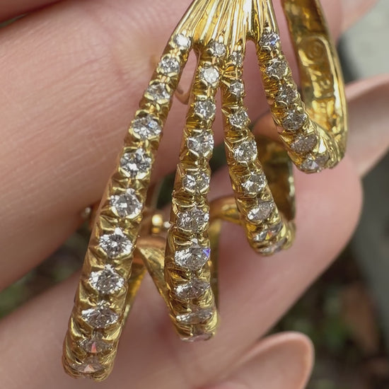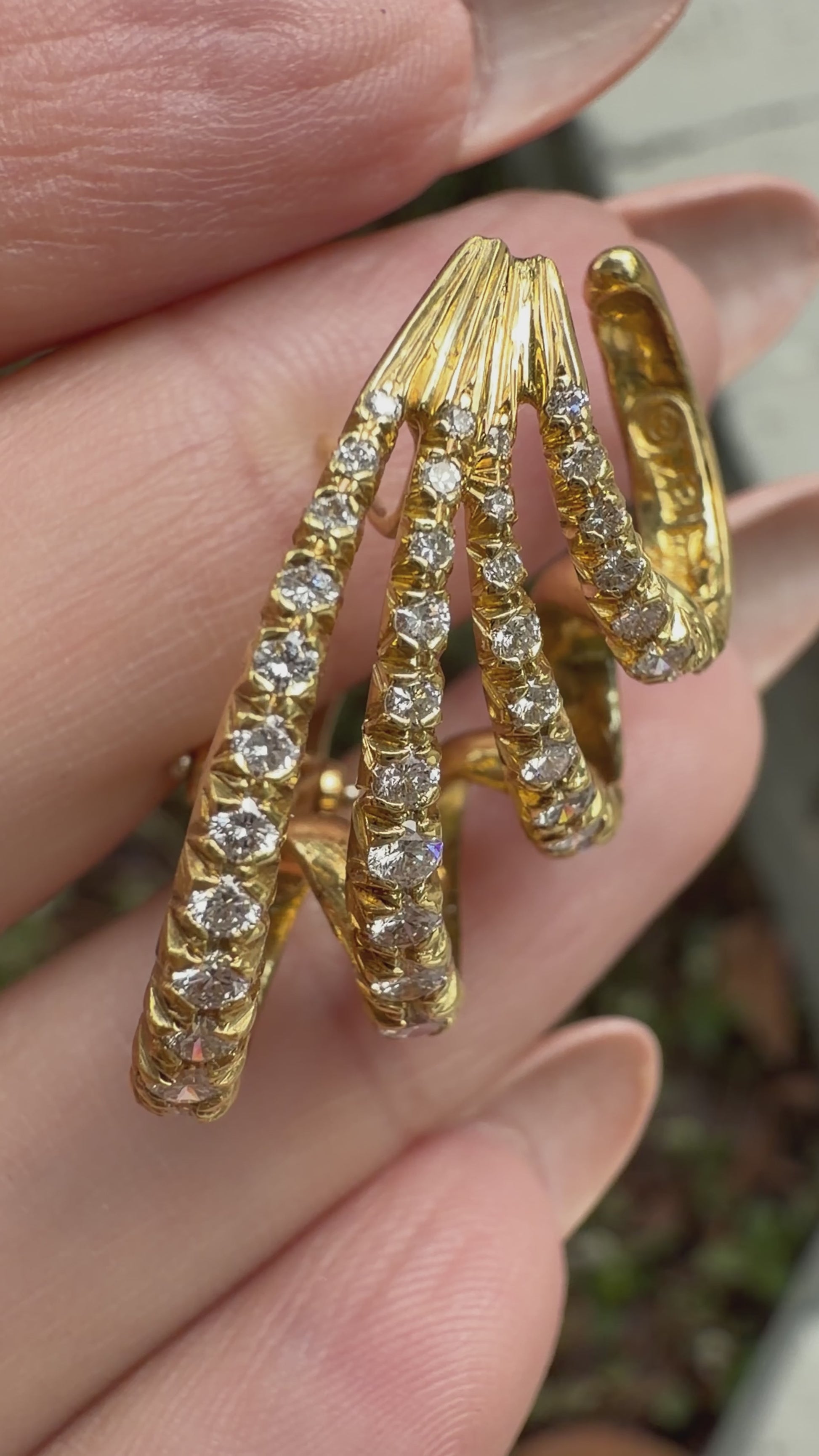 Love the ear wrap effect of these beautiful Vintage yellow 18K approx 2.5ctw Henry Dunay designer diamond wave earrings with omega back closure. Each earring measures 25.9 mm long and 30 mm across long. High quality diamonds GH color, VS clarity avg. Weigh 16.1 grams combined. In very good preowned condition, strong closure. Hallmarked.